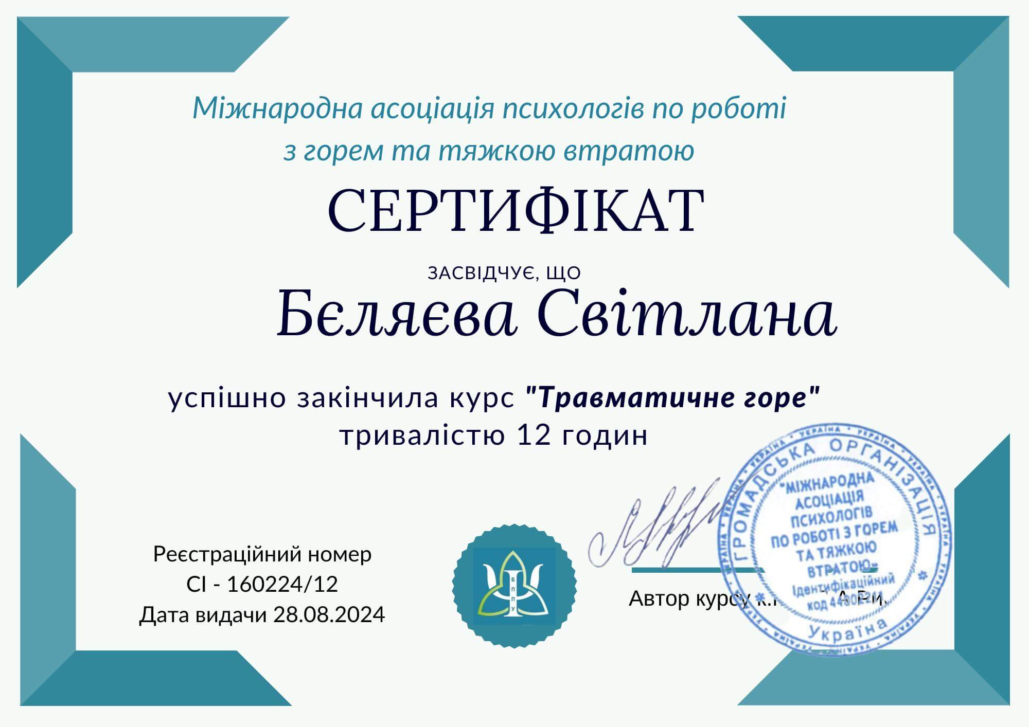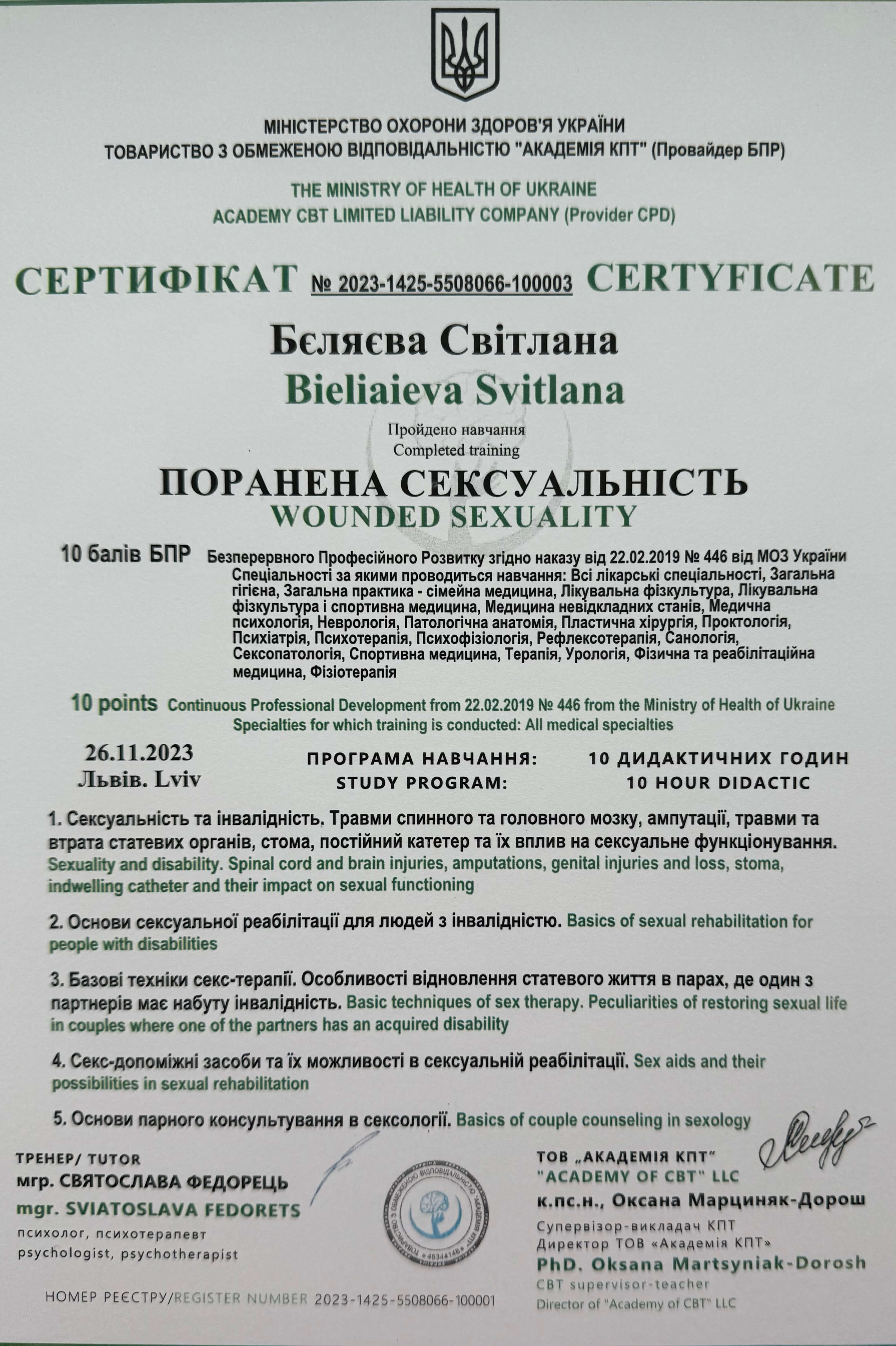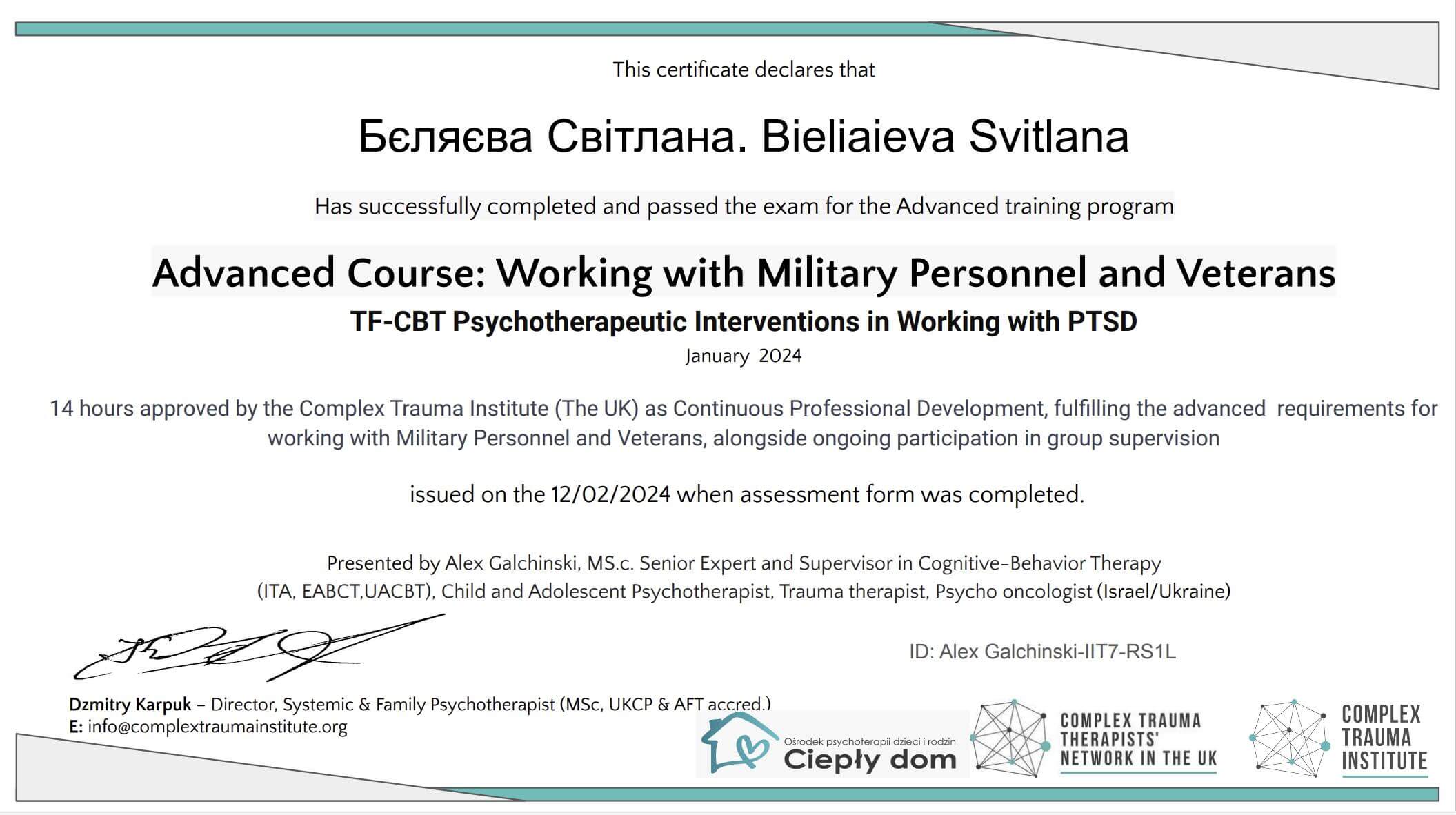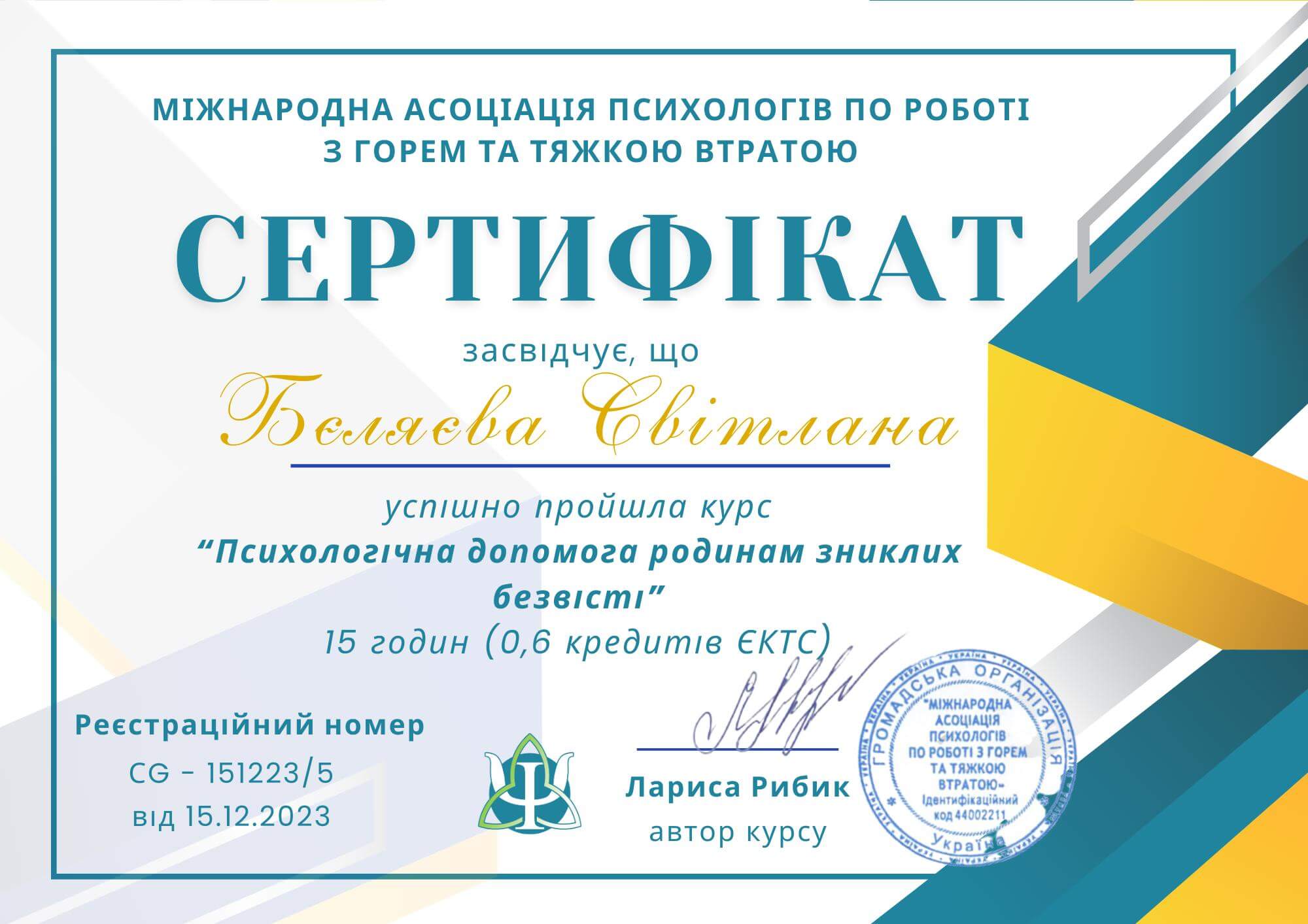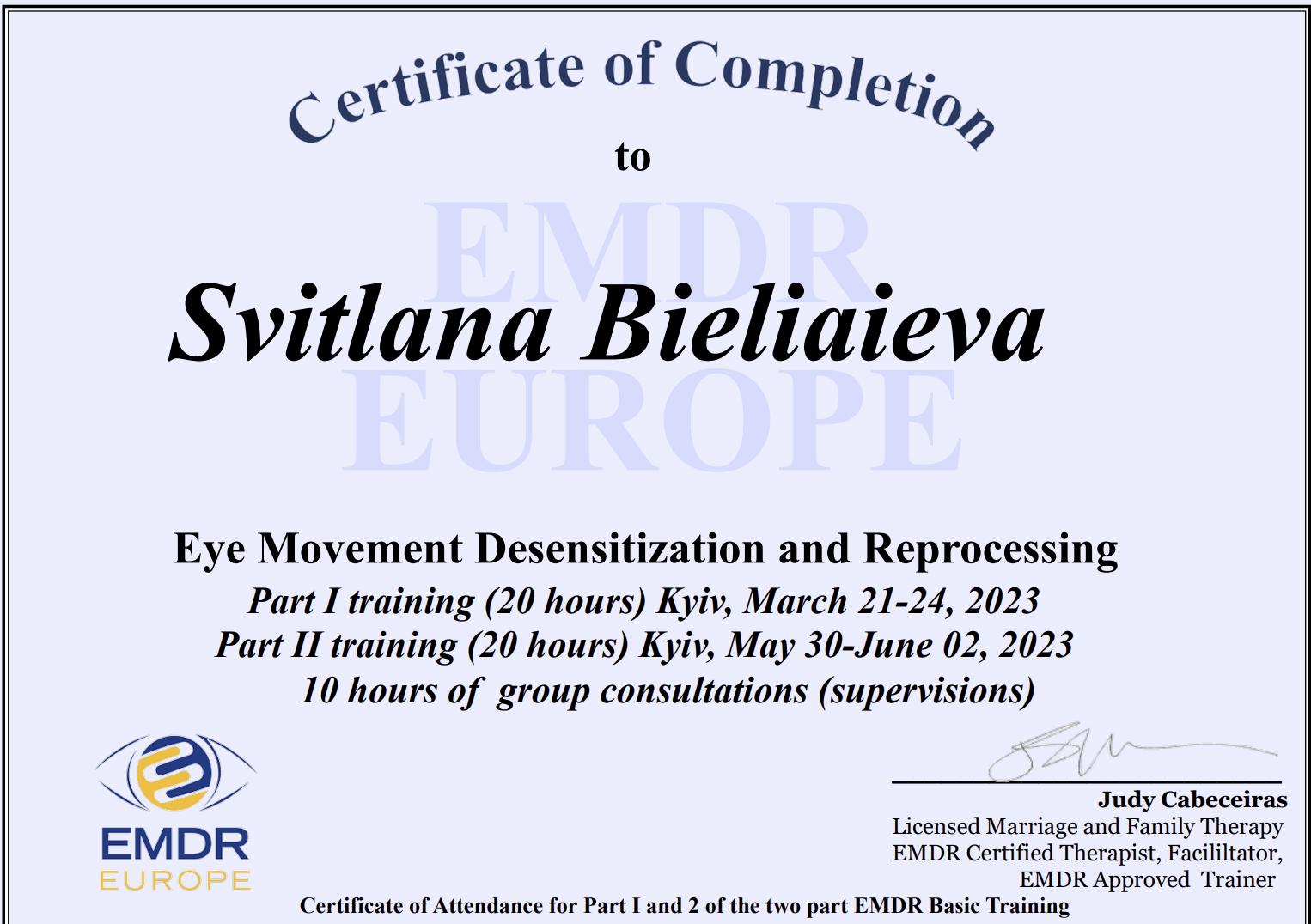 Николаевский государственный педагогический институт (психология, базовое образование); Ассоциация профессионального развития психологов и терапевтов в Украине (основы кризисного консультирования, основы нейропсихологии); ОО "Семейное пространство" (Теория и практика системной семейной психотерапии); Українська спілка психотерапевтів (Кататимно-имагинативная психотерапия. Основная ступень); Институт психологии и здоровья (8 шаговая программа по работе с утратой); Израль. Травмацентр (Телесно ориентированная терапия); Киевский институт рационально-интуитивной терапии "Я" (Психотерапия травматического опыта и личностных расстройств)