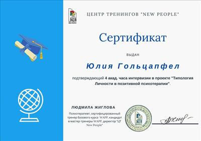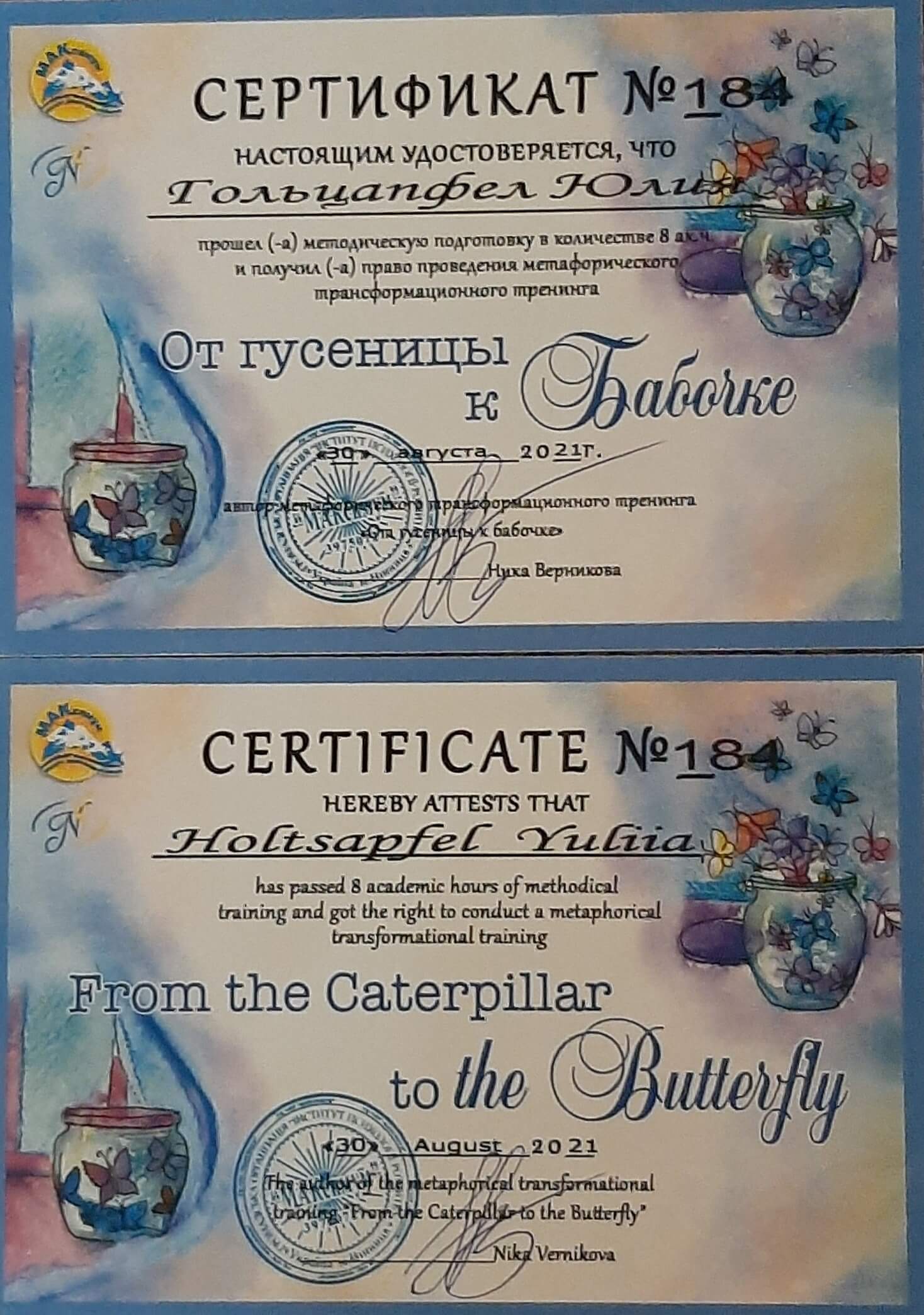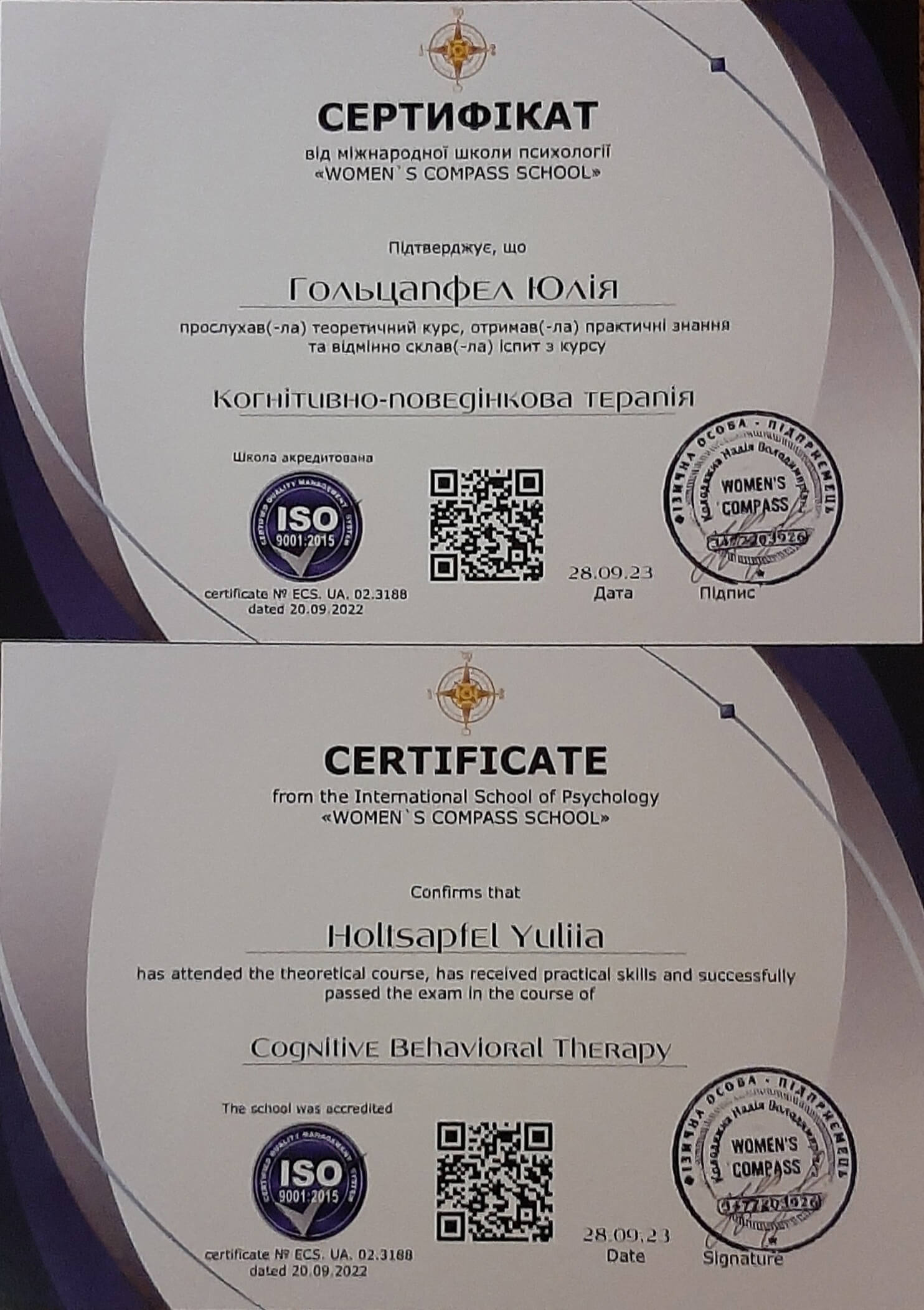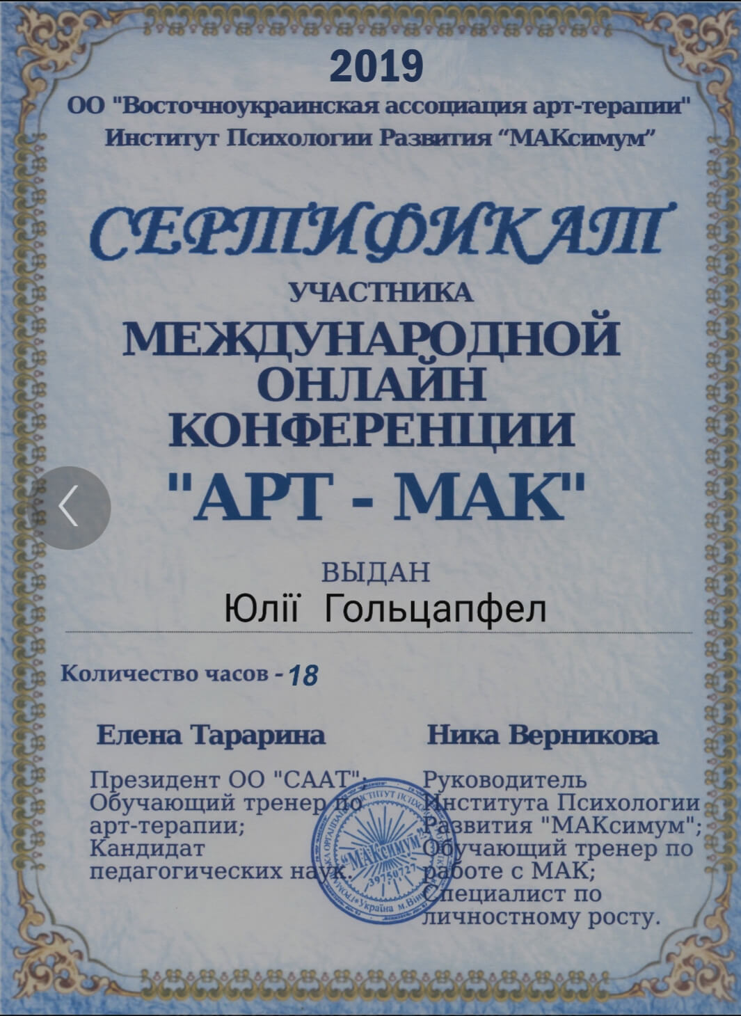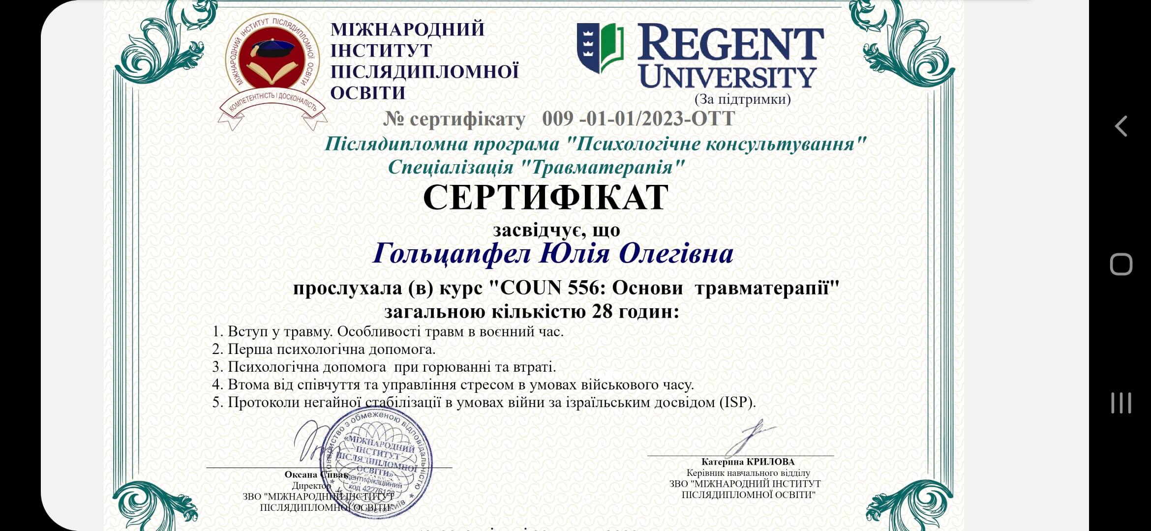 Мукачевский государственный университет -магистр психологии, курс "Введение в гештальт терапию/ гештальт консультирование. Контакт с собой и другими", базовый курс позитивной психотерапии, модуль "Психодинамика и развитие человека" в базовом курсе позитивной психотерапии, курс "Типология личности в позитивной психотерапии."