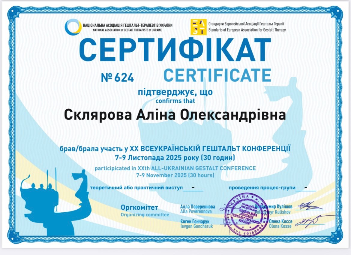 Меня зовут Алина, мне 34 года. Я психолог. Заканчиваю обучение в МАУП. Имею психологический опыт более 4 лет. Провожу консультации в гештальт-подходе. Постоянно нахожусь в процессе получения новых знаний (лекции, конференции, семинары). Сертифицированный гештальт-коуч. Прошла курс по метафорическим картам и практической психологии. Есть сертификат о прохождении курса «Травматический опыт и ПТСР: инструментарий для психотерапевта» Имею постоянную личную терапию. Также 2 года личной групповой терапии.