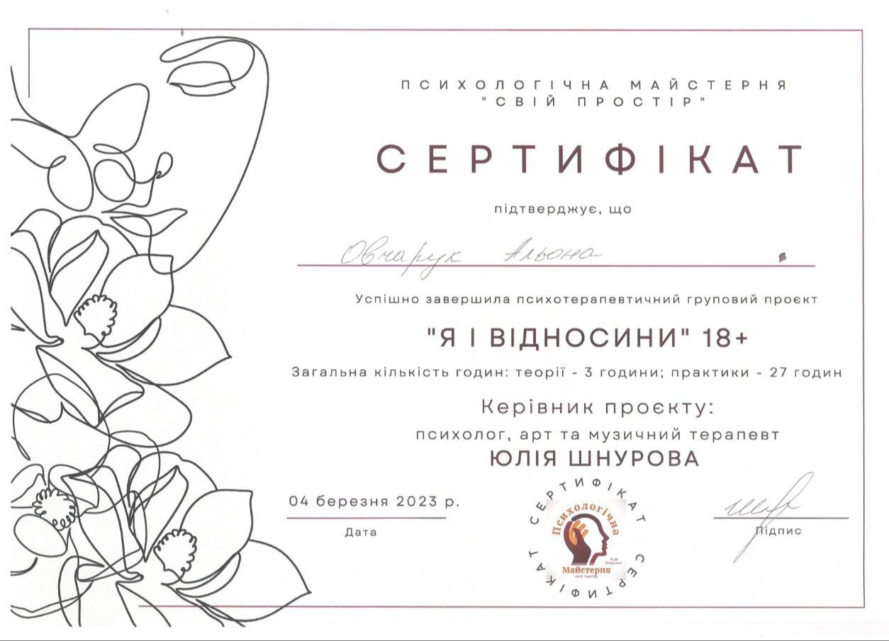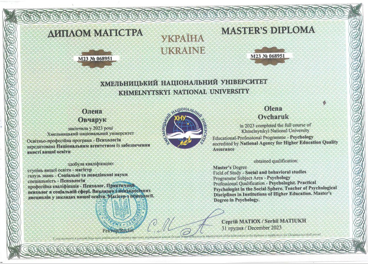 Магистр психологии Хмельницкий национальный университет; сертификация в позитивной психотерапии; сертификат по КПТ; эмоционального интеллекта; заканчиваю обучение через месяц на клинического психолога в Харьковском университете внутренних дел