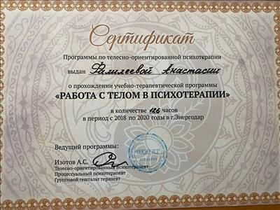 Прошла обучающий курс телесно-ориентированной психотерапии