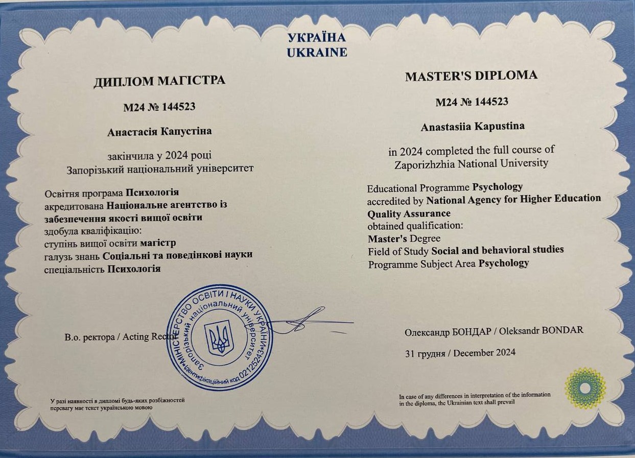 Магистр психологии, Запорожский национальный университет (ЗНУ)