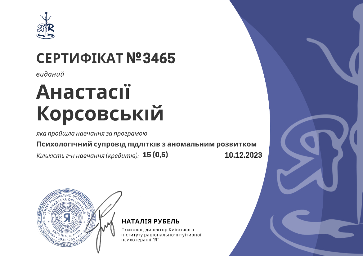 5.Киевский институт рационально-интуитивной психиатрии "Я". «Психологическое сопровождение подростков с аномальным развитием» 2024 год.