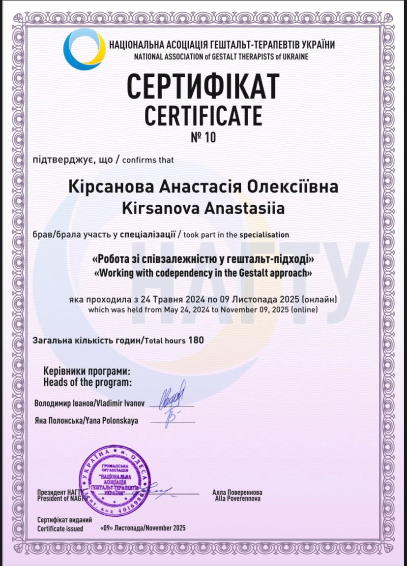 Прошла первая ступень «Основы гештальт терапии» с 26.11.2021 – 12.02.2023 (180 часов)