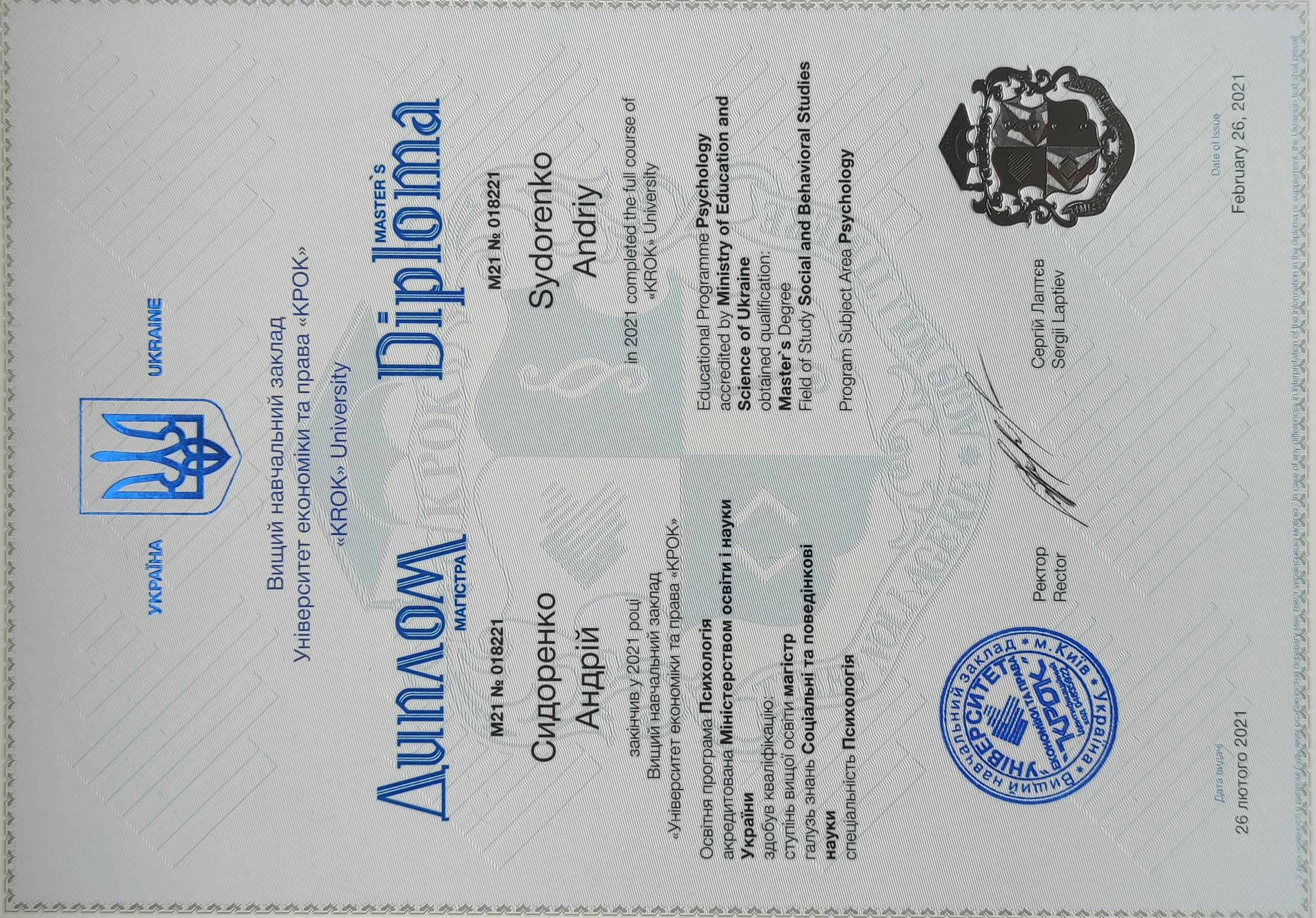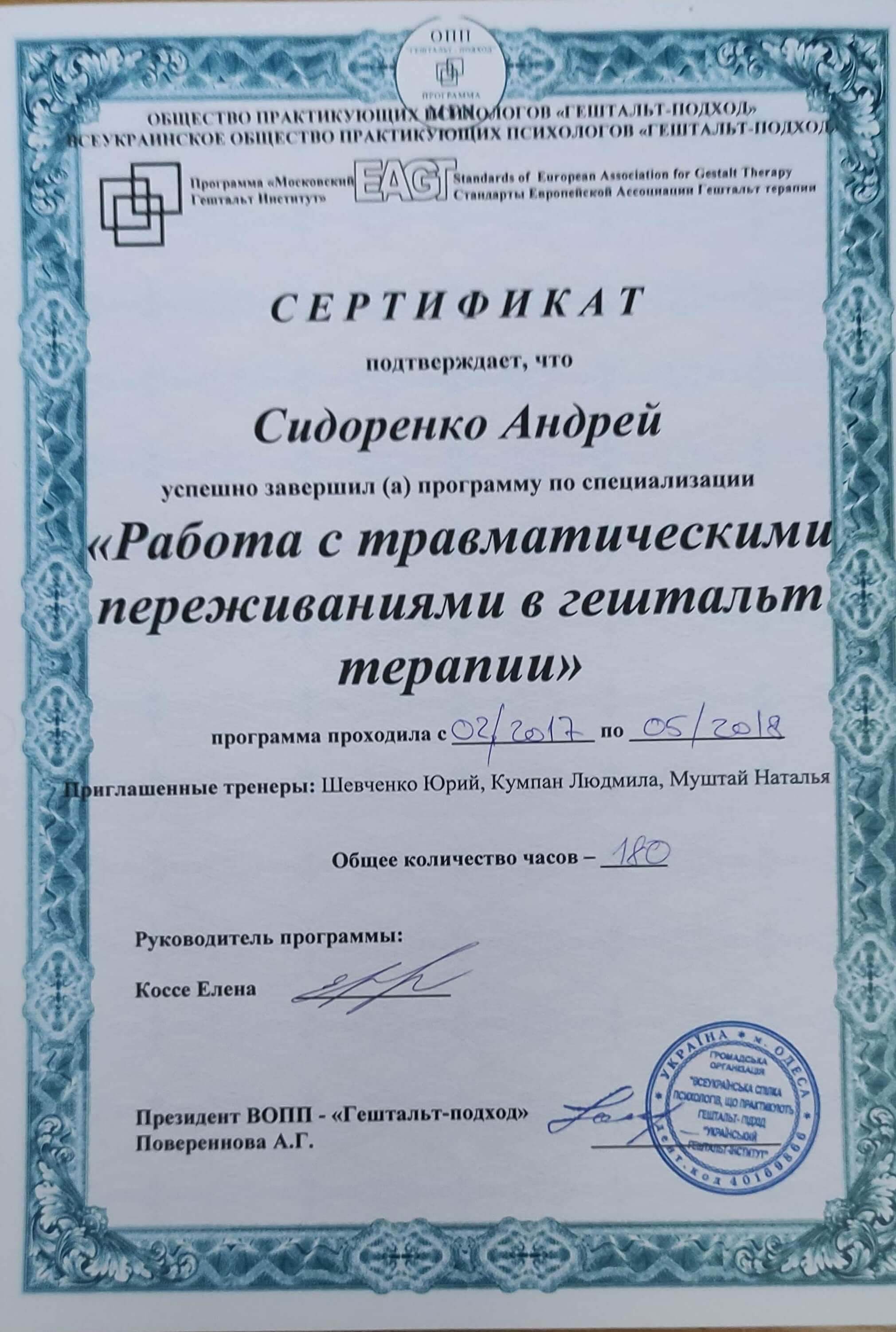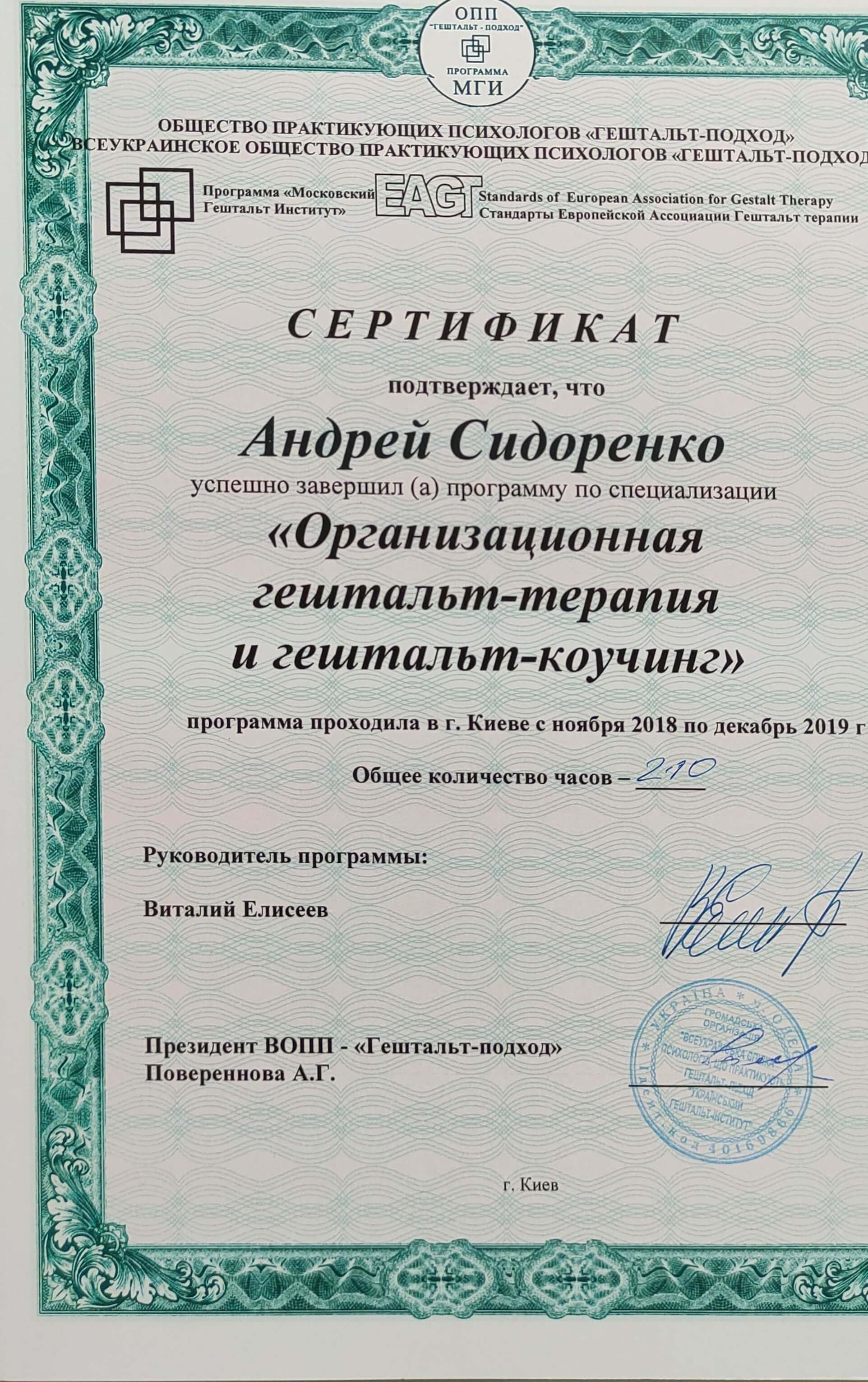 Закончил 2ю ступень в Украинском гештальт институте (ВОППГП).