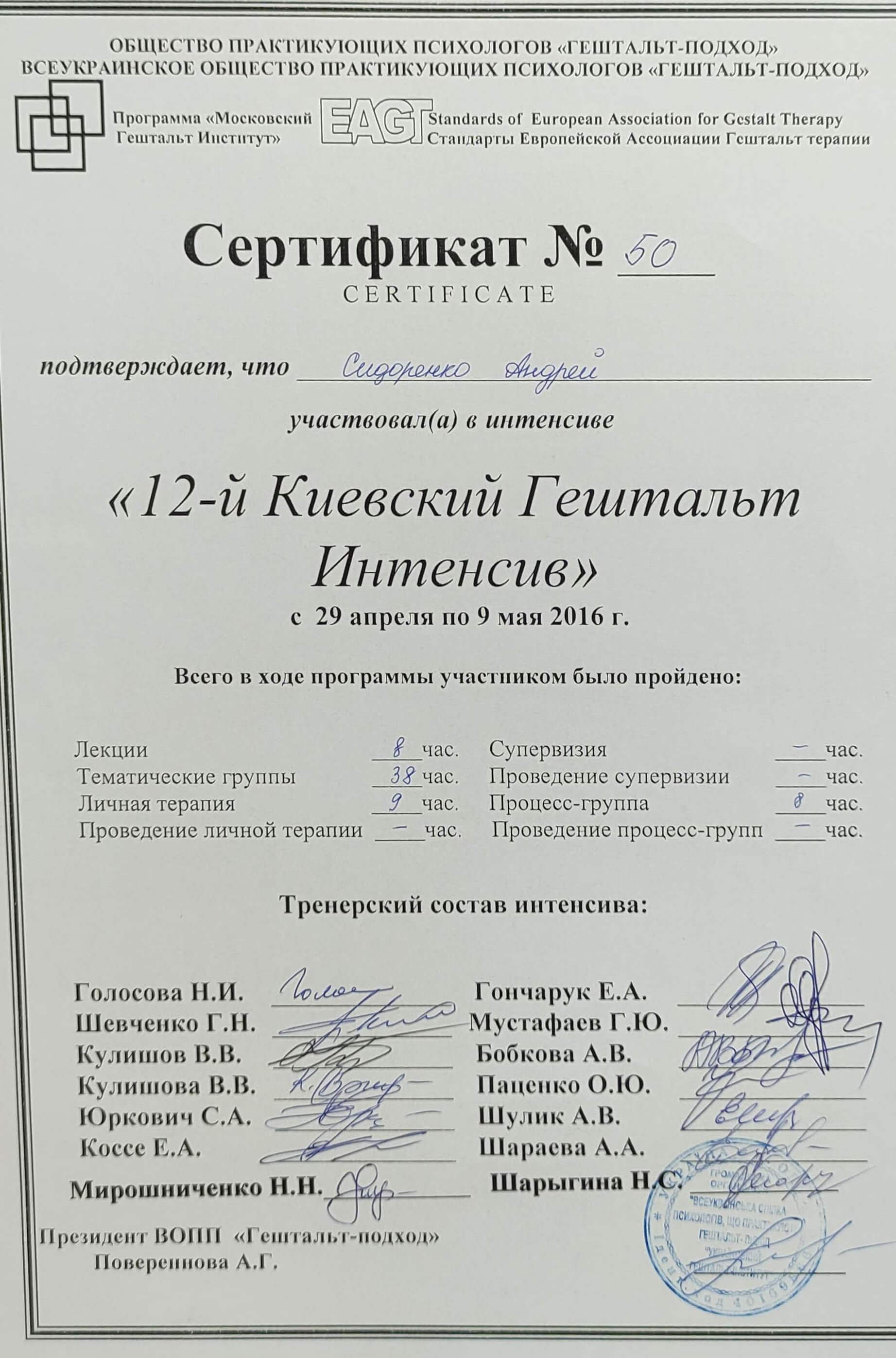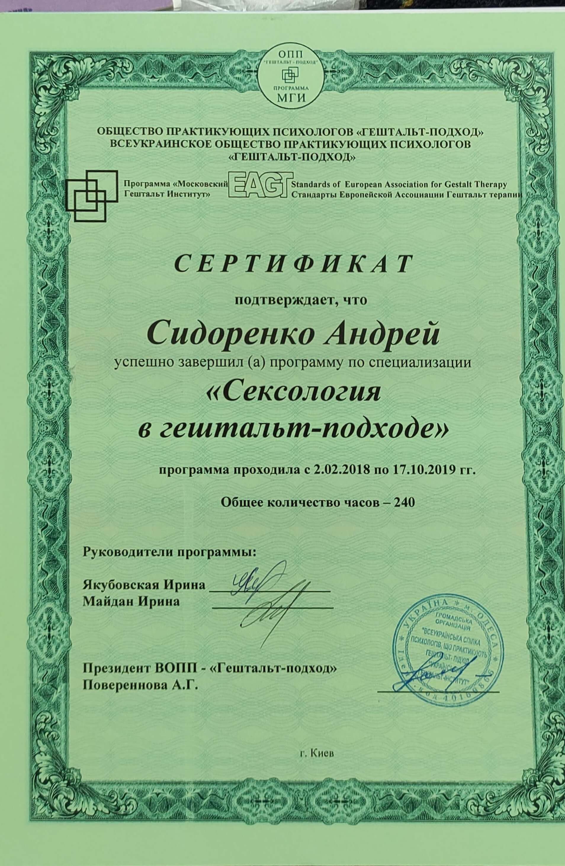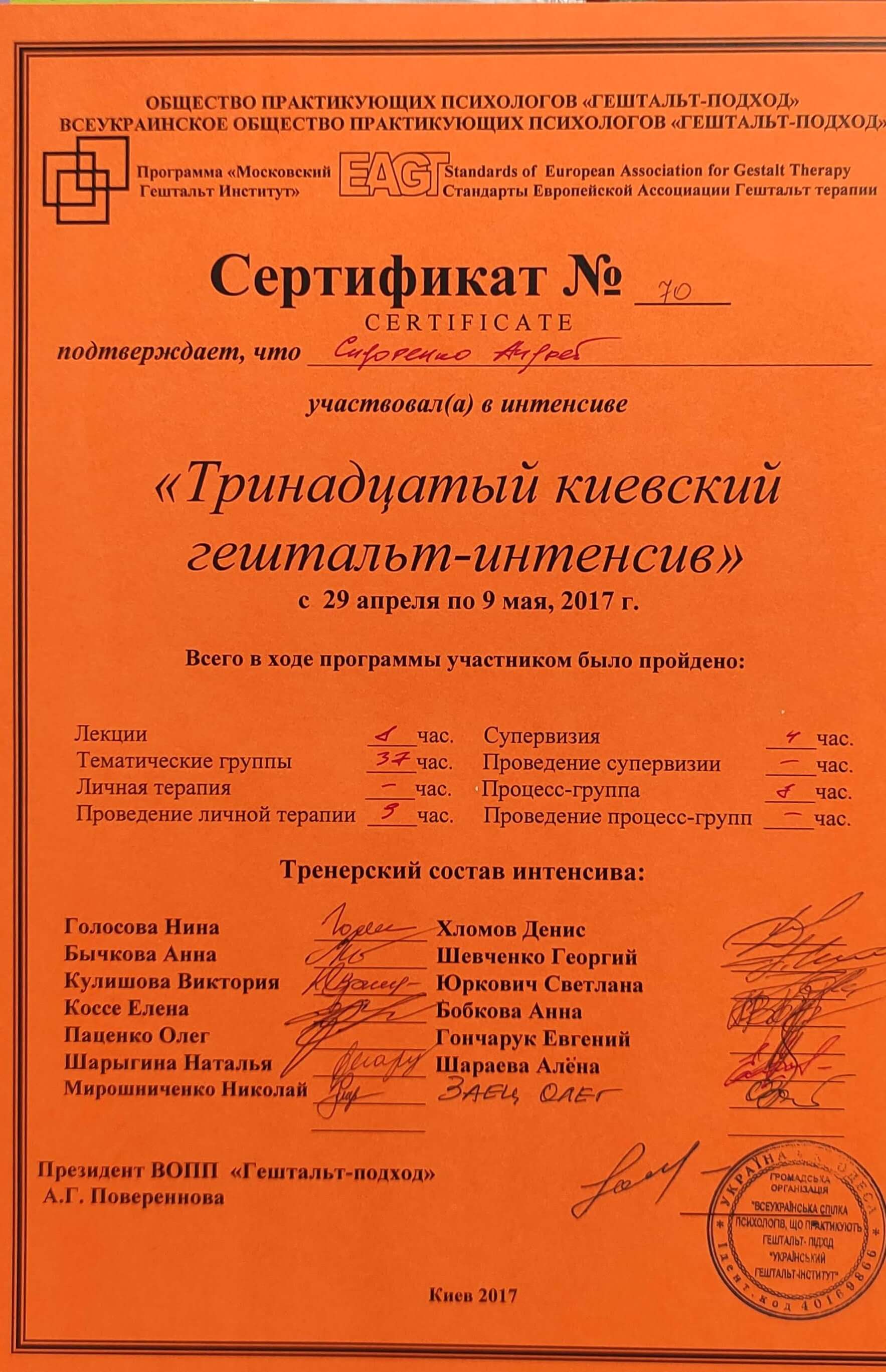 Закончил 2ю ступень в Украинском гештальт институте (ВОППГП).