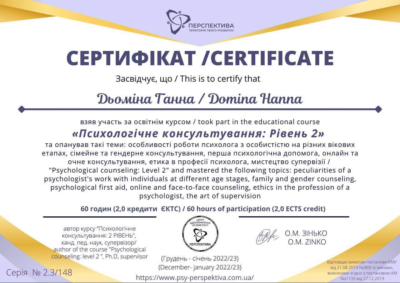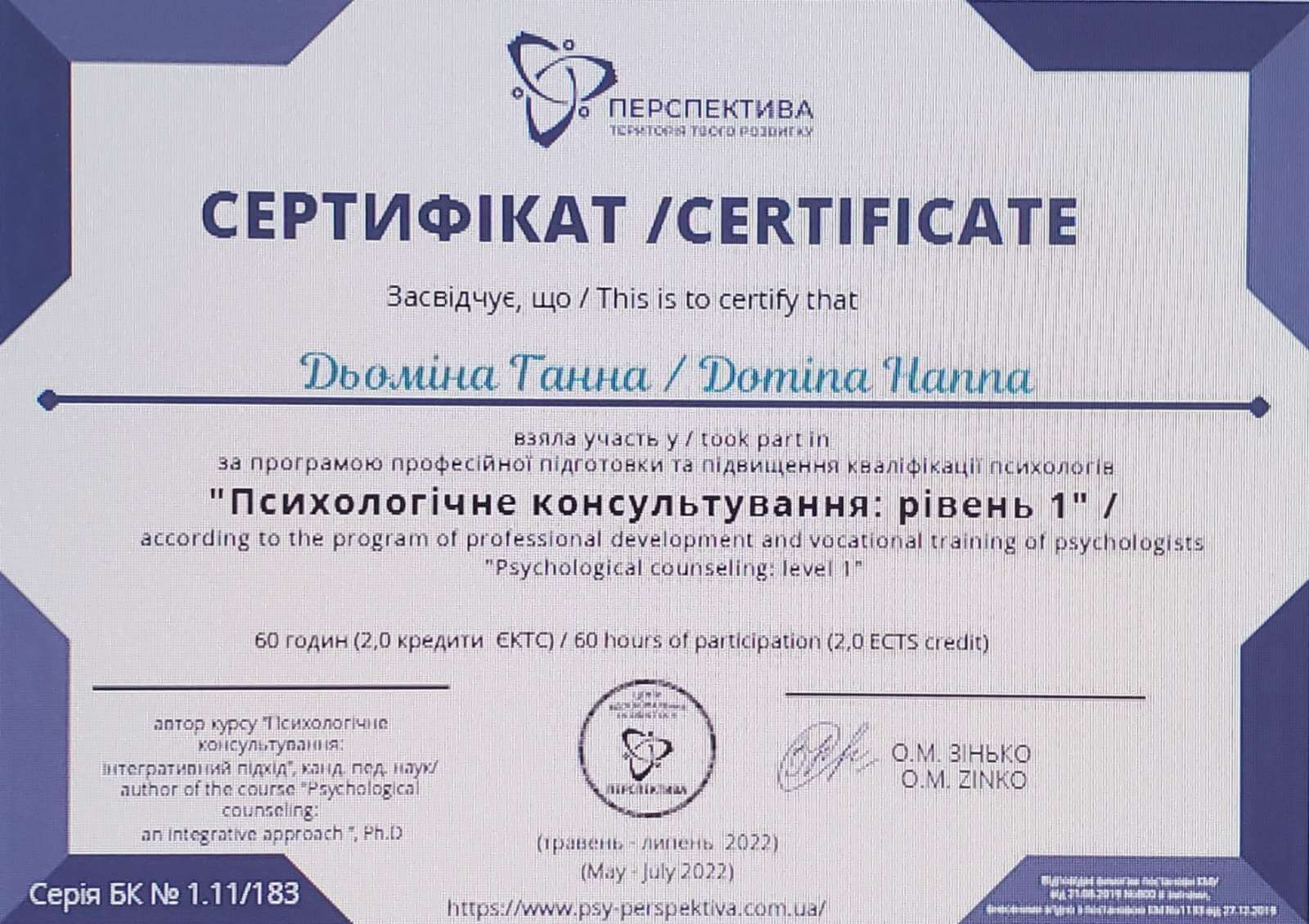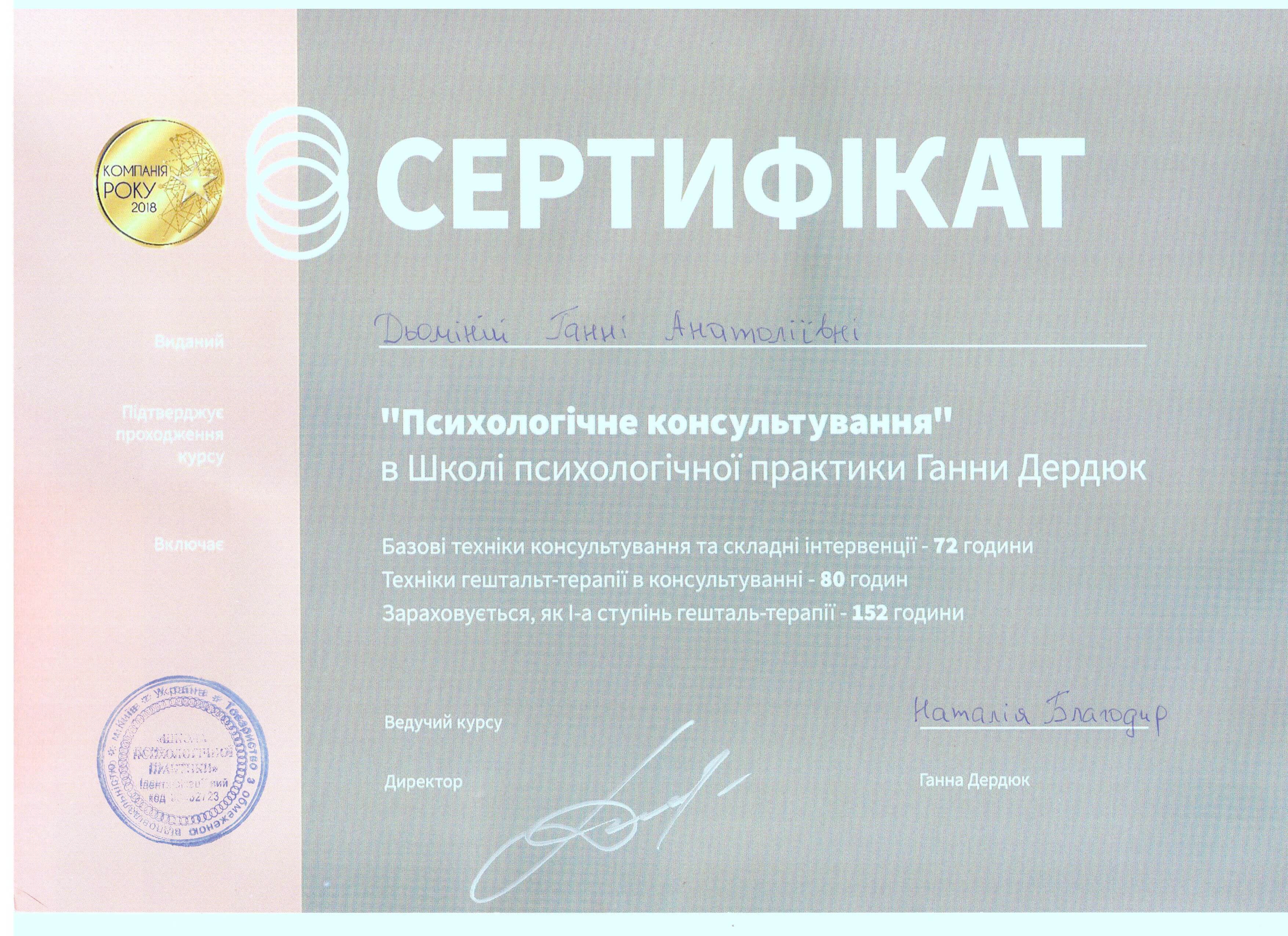 - Курс Психологическое консультирование в гештальт подходе, 1 ступень (152 ч.) и учусь на 2 ступени,
