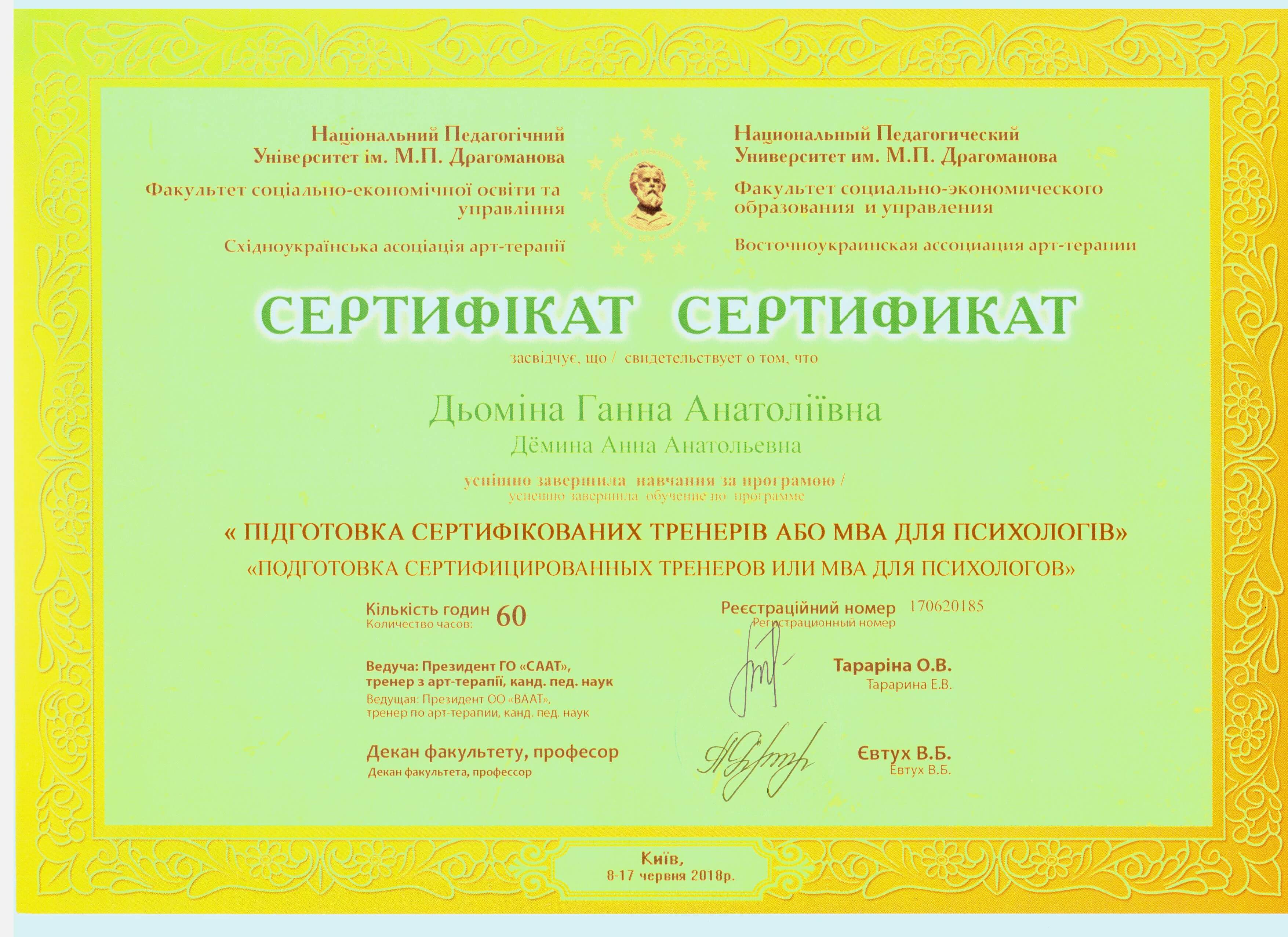 - Программа подготовки сертифицированных тренеров или МВА для психологов (60 ч.),
