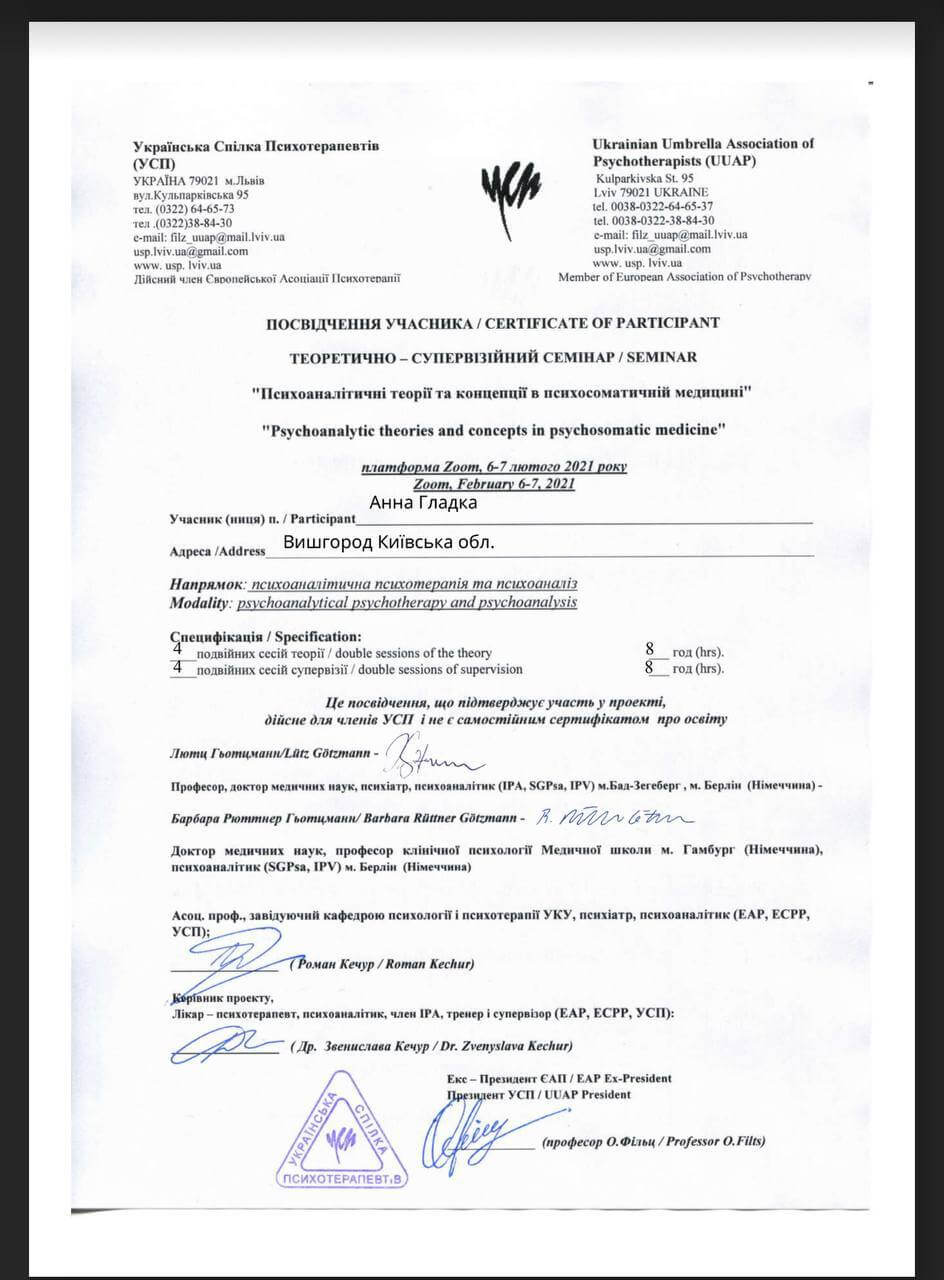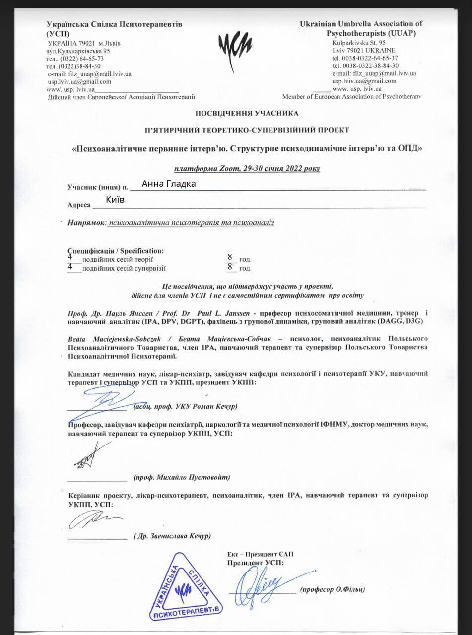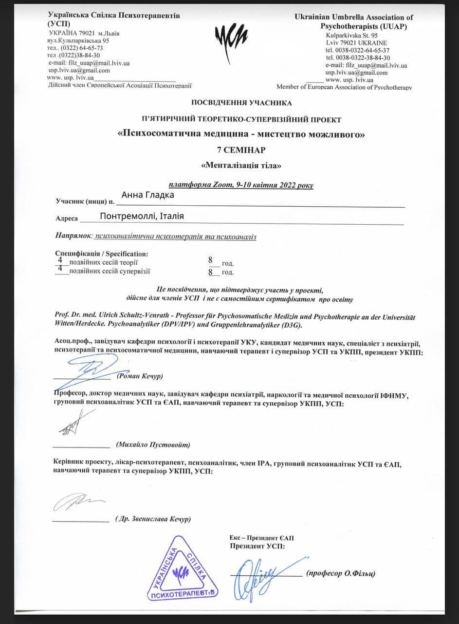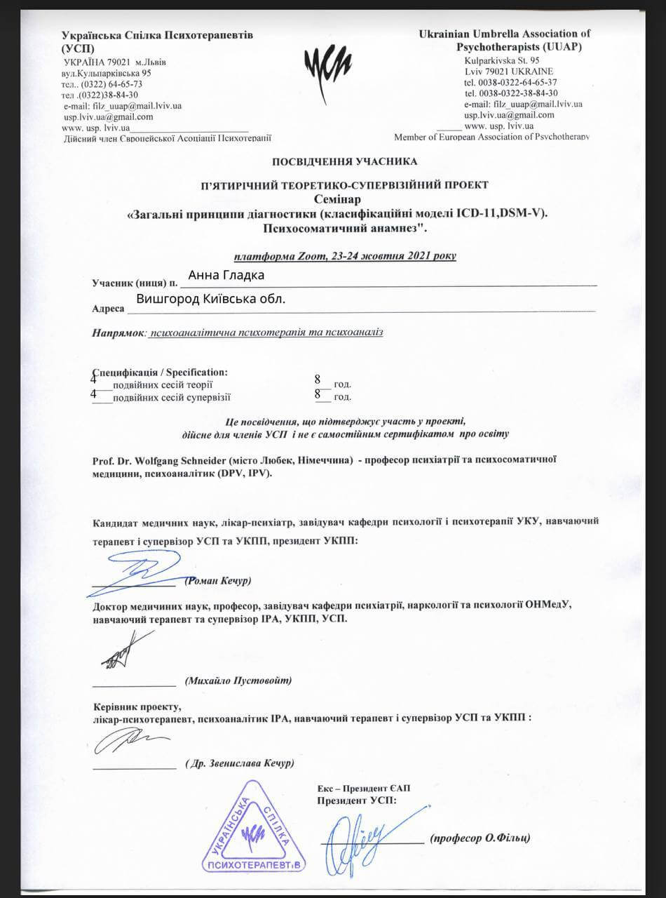 Украинская школа группового психоанализа, групповой психоаналитик 2018-2023.