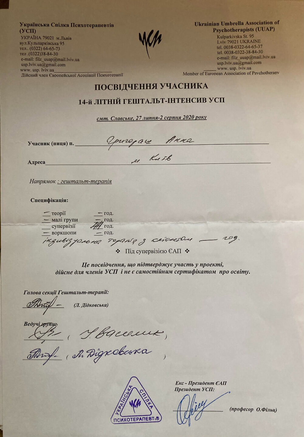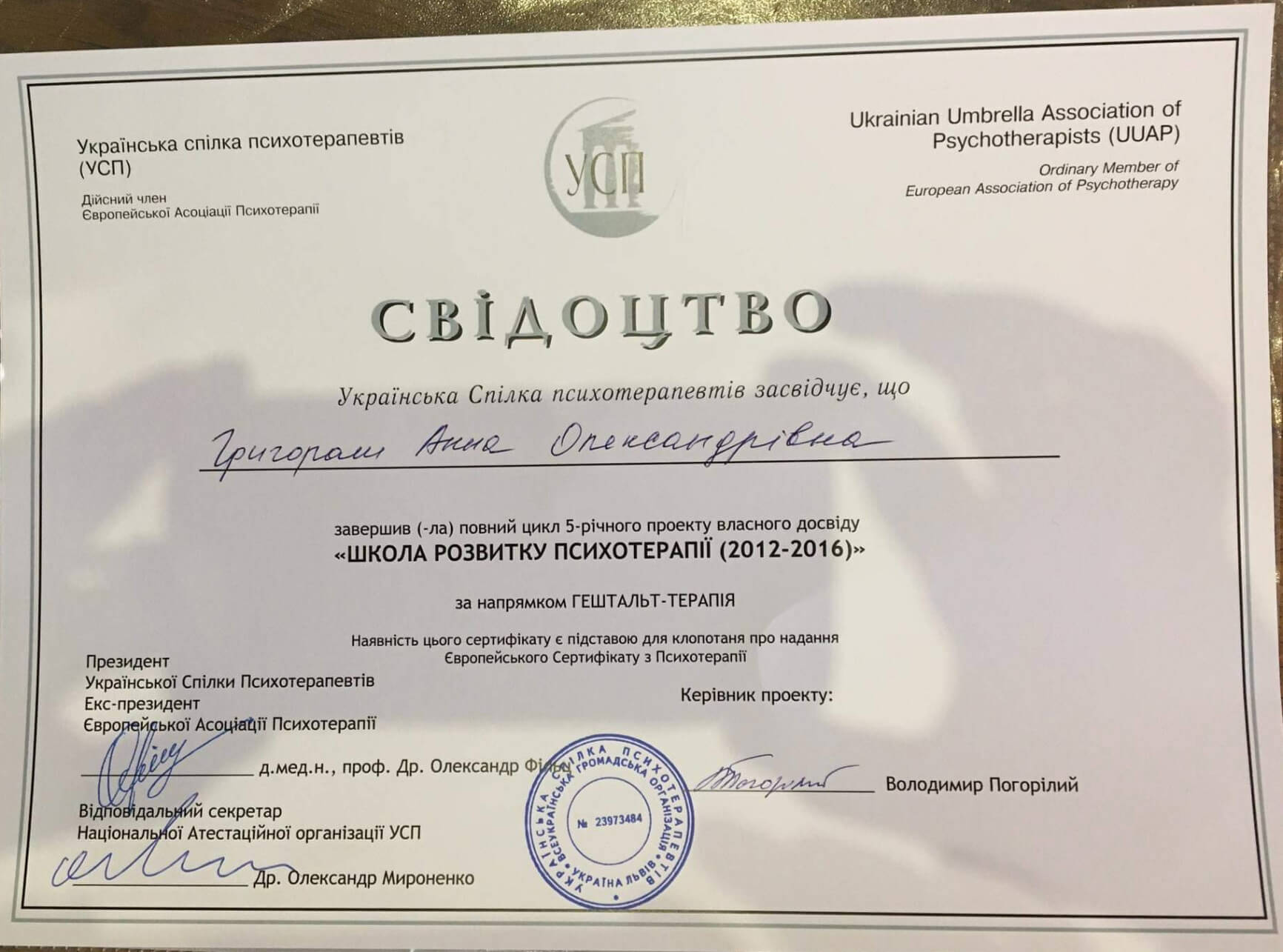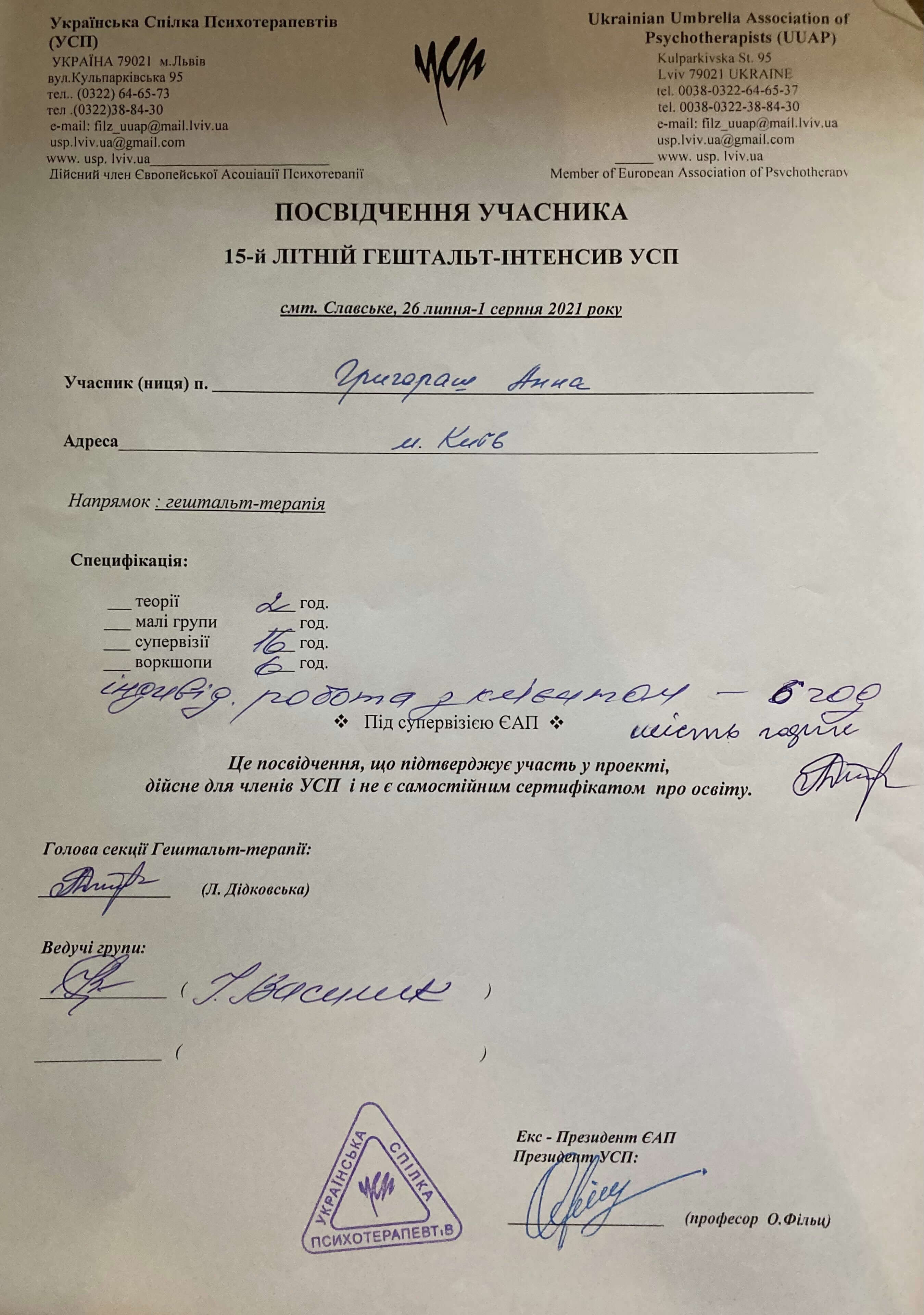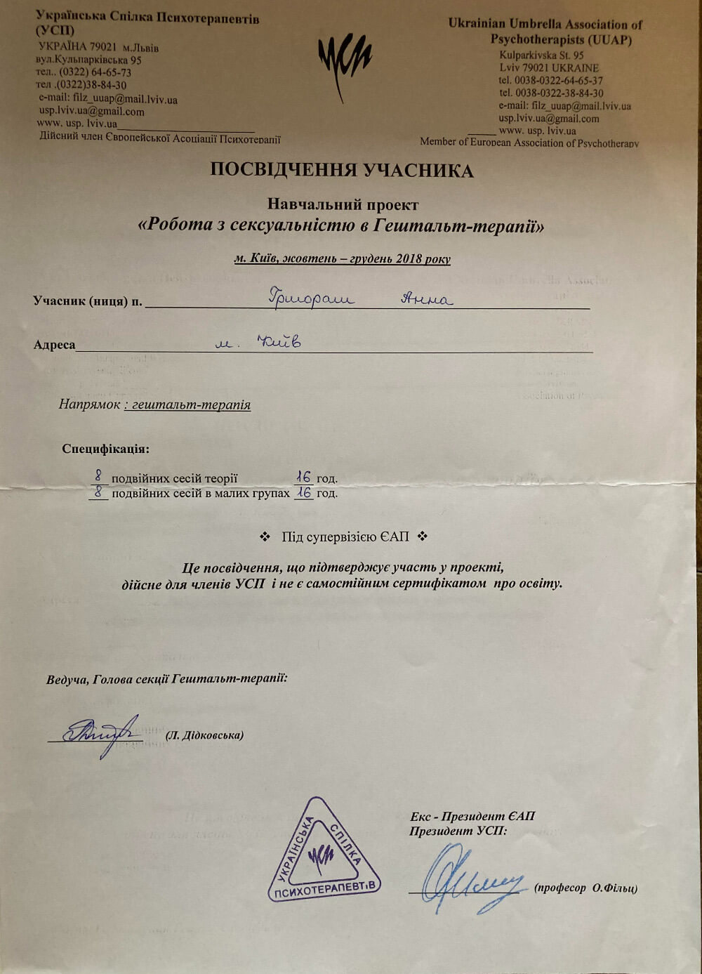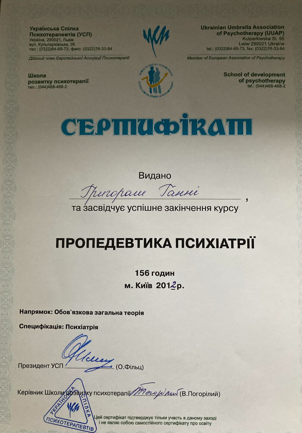 Украинский Психотерапевтический Университет, проект собственного опыта по направлению гештальт-терапии Киевской школы психотерапии, пропедевтика психиатрии и практика в психбольнице им. Павлова