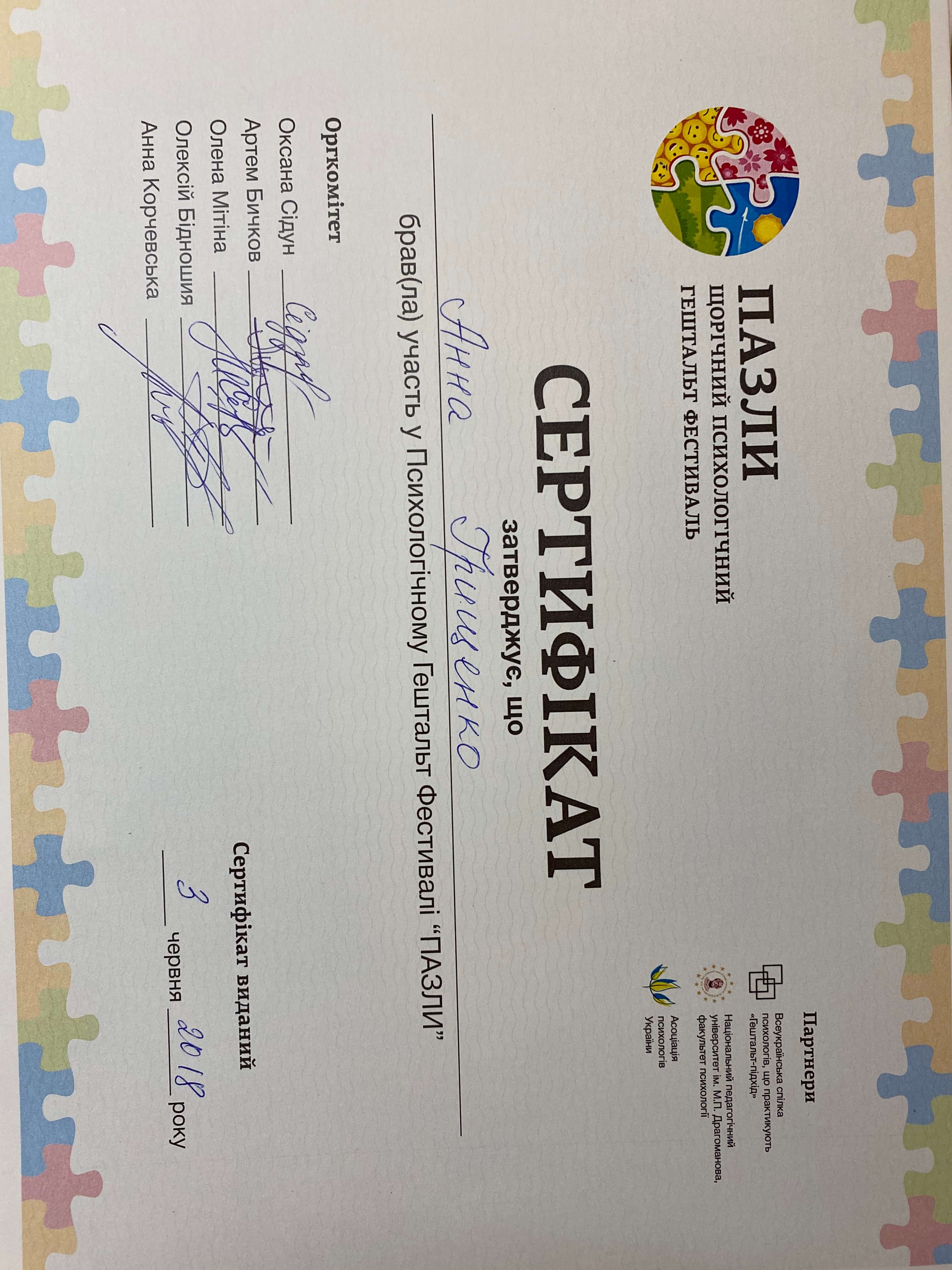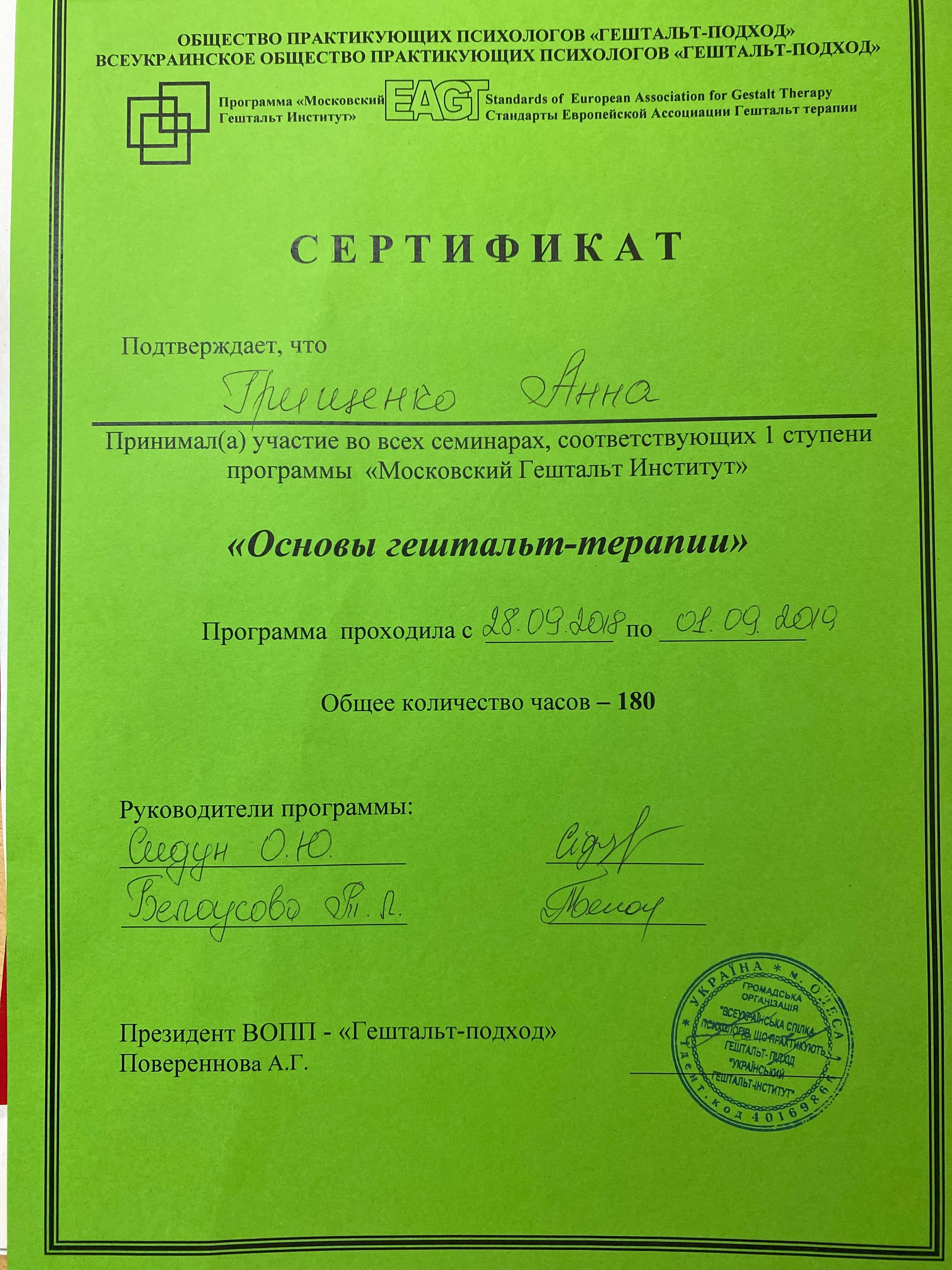 Имею высшее психологическое образование. Сейчас заканчиваю 2 ступень в Всеукраинском Гештальт сообществе психологов, практикующих Гештальт подход. Специализация: арттерапия.