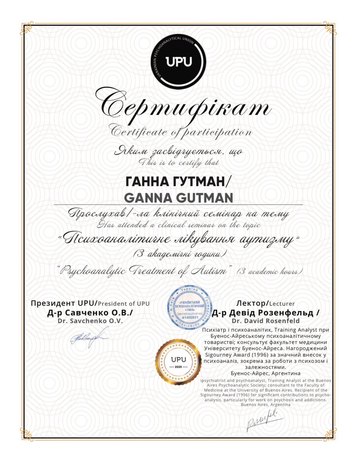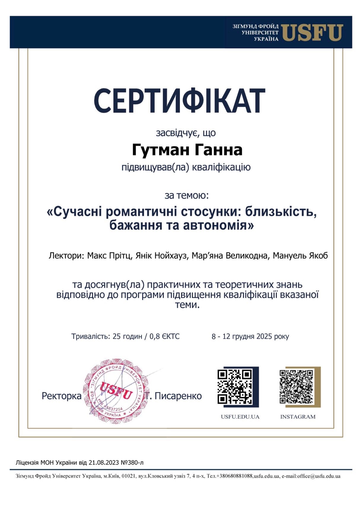 Мне 41 год. Есть два сына 16 и 12 лет. Живу в Германии уже 3,5 года. Веду практическую психоаналитическую деятельность уже 3 года онлайн и онлайн. Есть три высших образования. Владею украинским, английским и русским свободно. До того, как начать работать психоаналитиком, работала в сфере HR и вела собственный онлайн образовательный проект для родителей, привлекая украинских специалистов проводить онлайн лекции по психологии и детской безопасности для родителей. Развиваю собственную профессиональную Instagram страницу. Есть более 1300 подписчиков. Счастлива работать психоаналитиком. Считаю, что мой жизненный и профессиональный опыт может помочь многим клиентам/анализантам найти внутреннюю опору и справиться с симптомами, которые мешают им полноценно и счастливо жить.