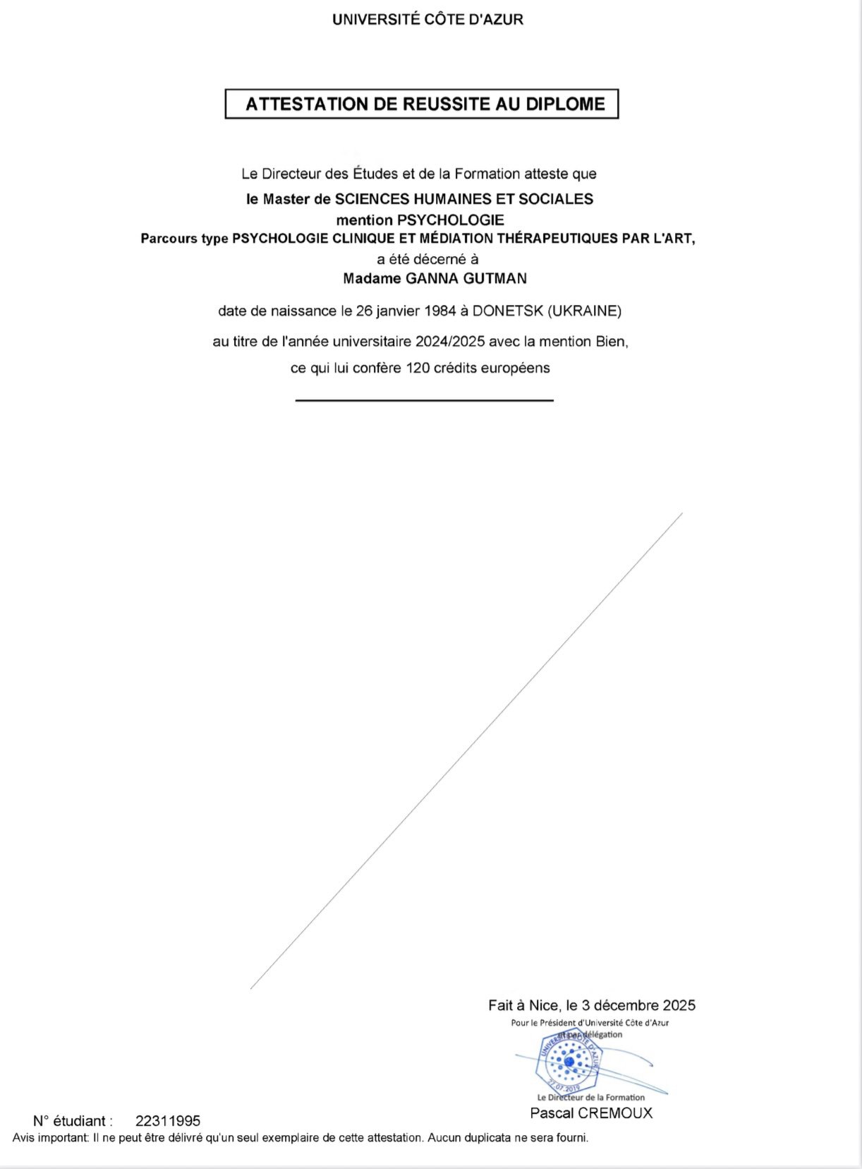 Окончила Университет Т. Г. Шевченко, Психология. Окончила Университет Côté d’Azur, клиническая психология.
