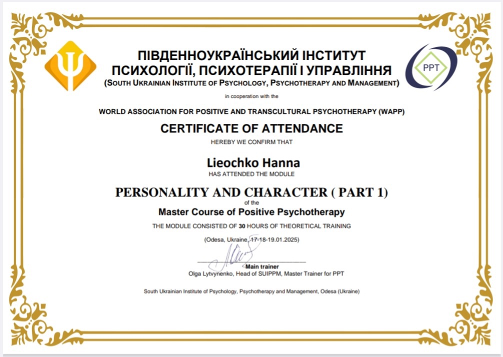 Меня зовут Анна, я психолог, и моей основной специализацией является Позитивная психотерапия. Этот метод помогает людям видеть не только свои трудности, но и возможности для развития.