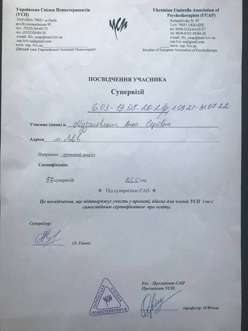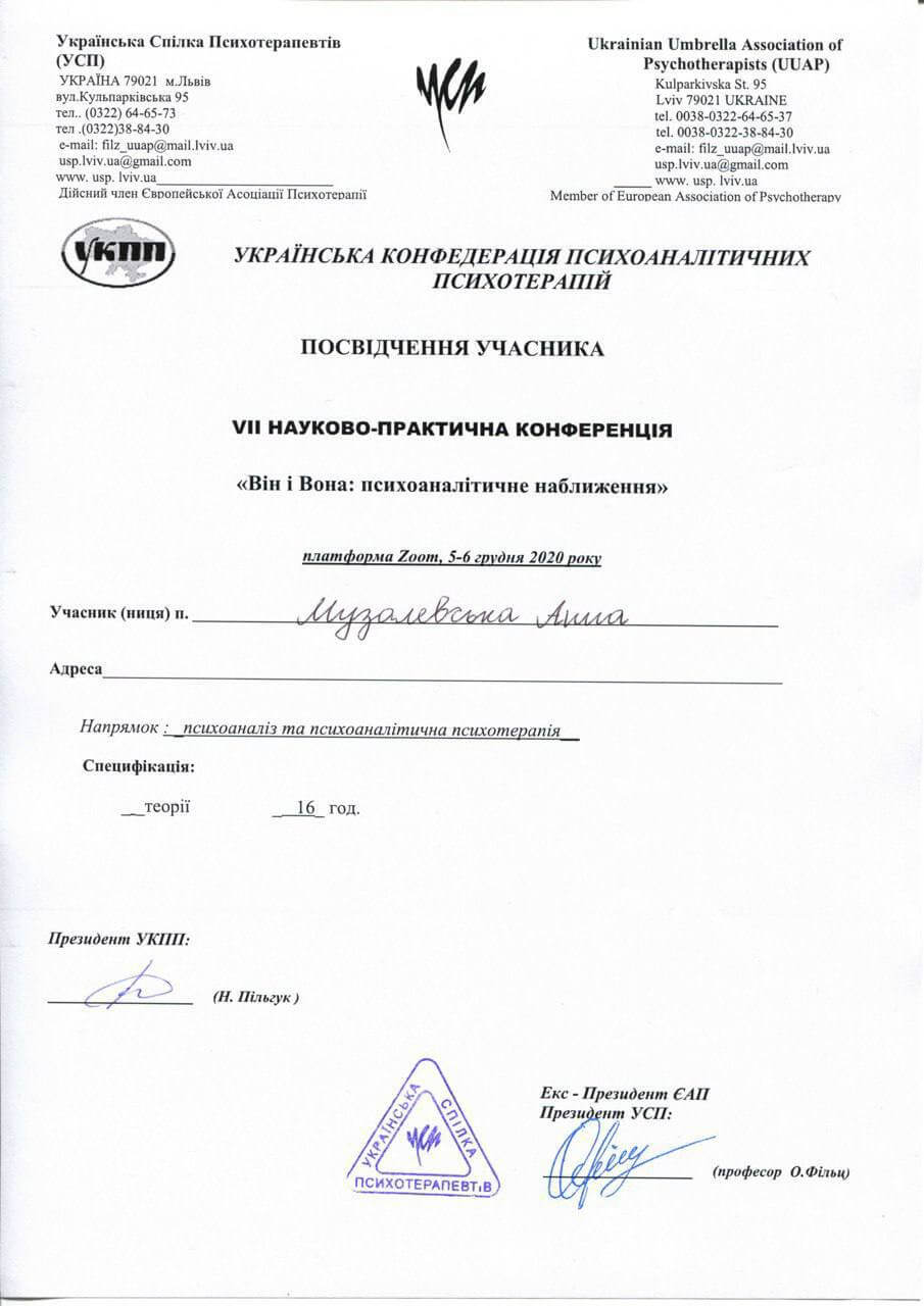 Сейчас прохожу обучение психотерапевтическому методу – психоанализ – в 4-летнем проекте от Львовского института ментального здоровья. Также является участником группового проекта собственного опыта от Станиславского проекта. Регулярно посещаю дополнительные семинары по интересующим темам в поле психотерапии.