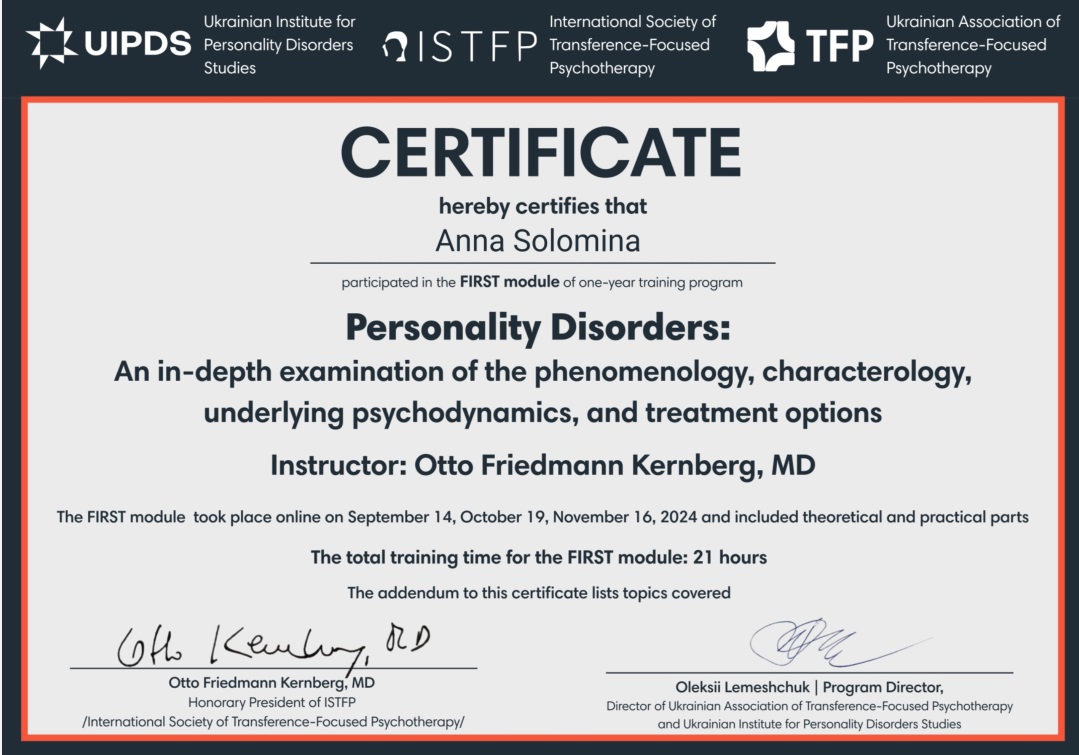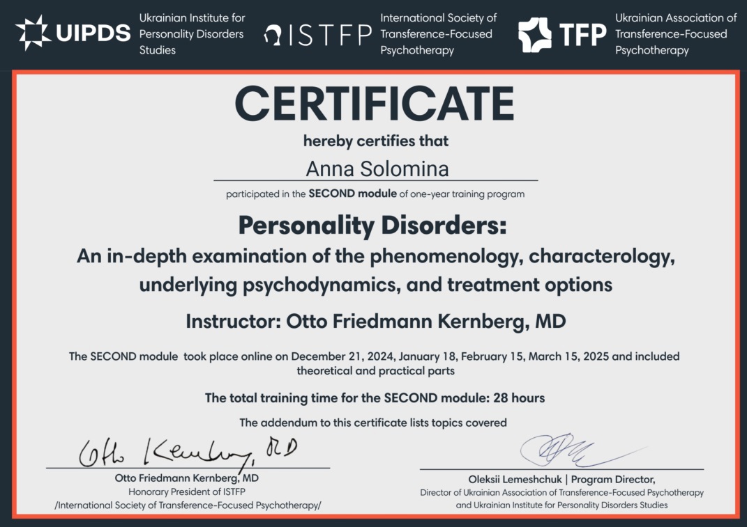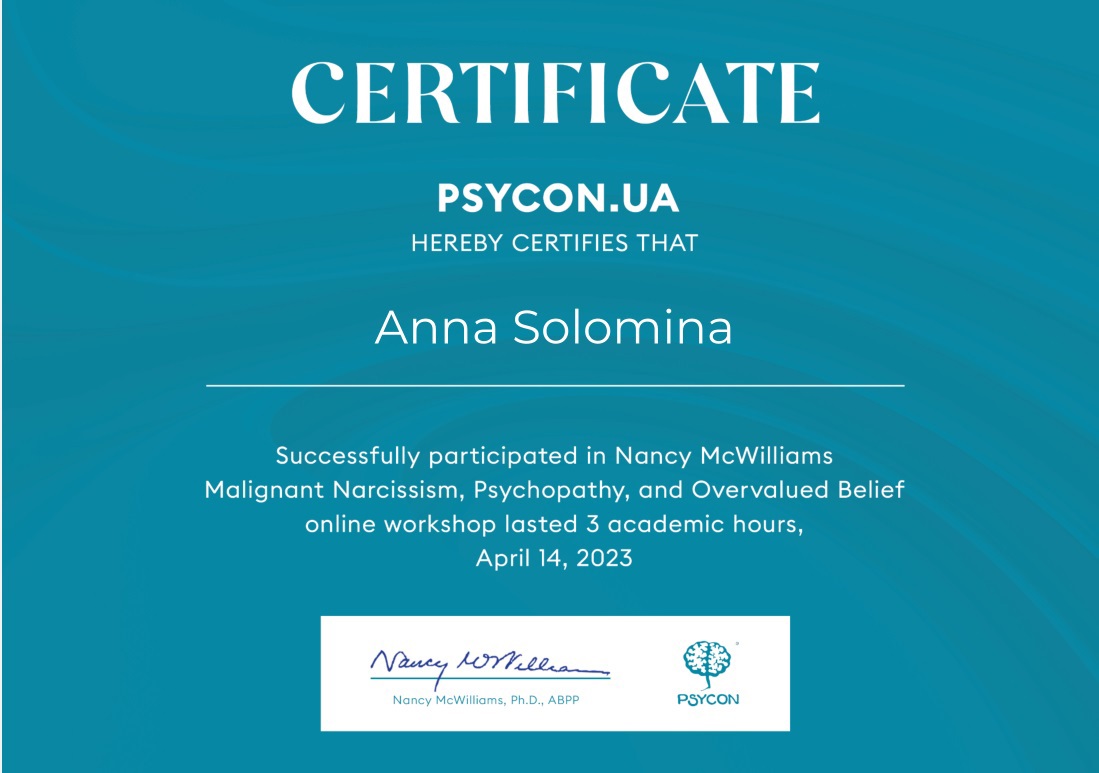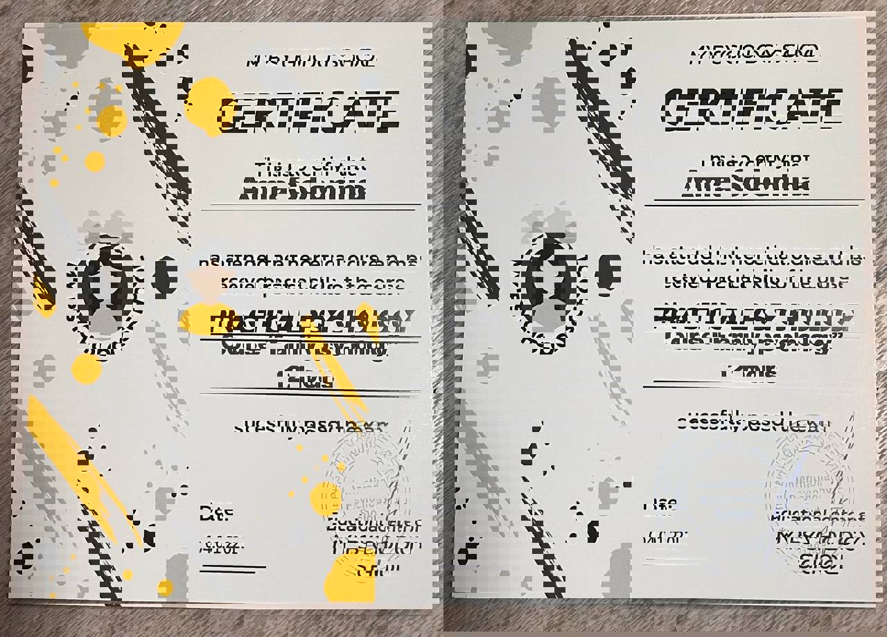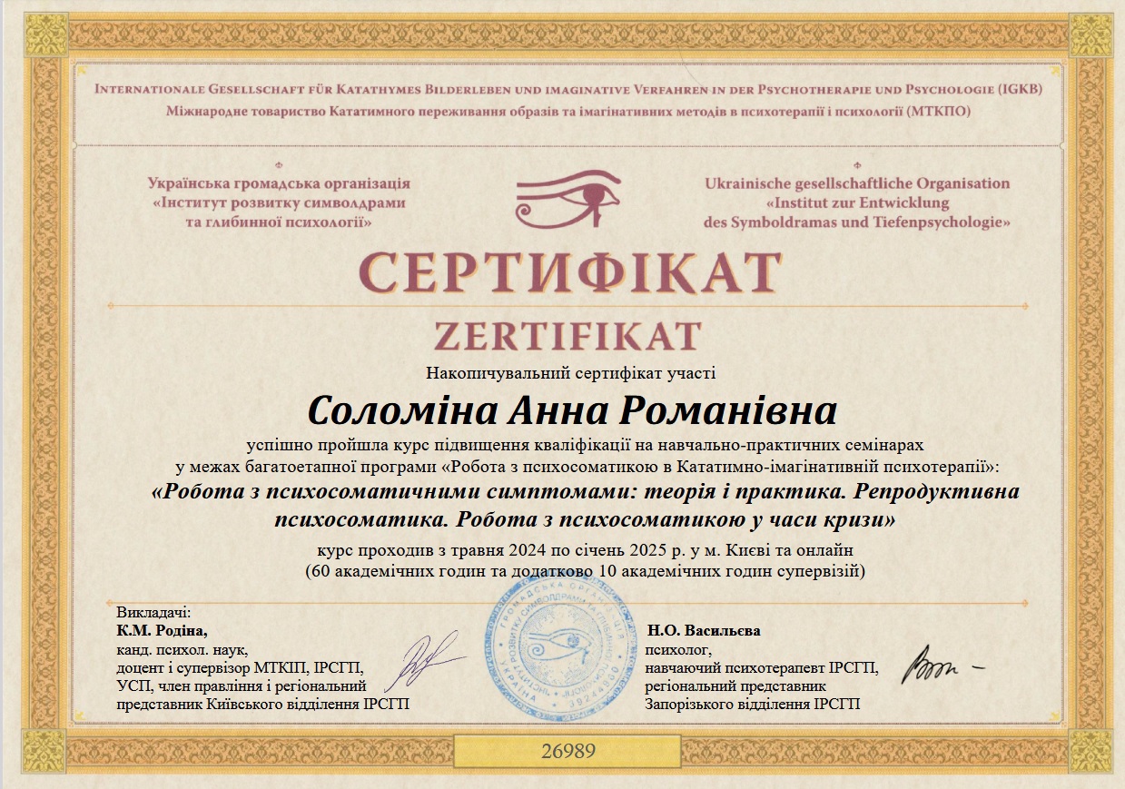 Психология – вторая профессиональная сфера моей жизни. Есть красный диплом ЧНУ им. Богдана Хмельницкого (практическая психология, магистратура). Также я прошла обучение в 4 года по методу Символдрама (кататимно-иммагинативная психотерапия), получила квалификацию консультантки в методе и ожидаю сертификации на звание психотерапевтки