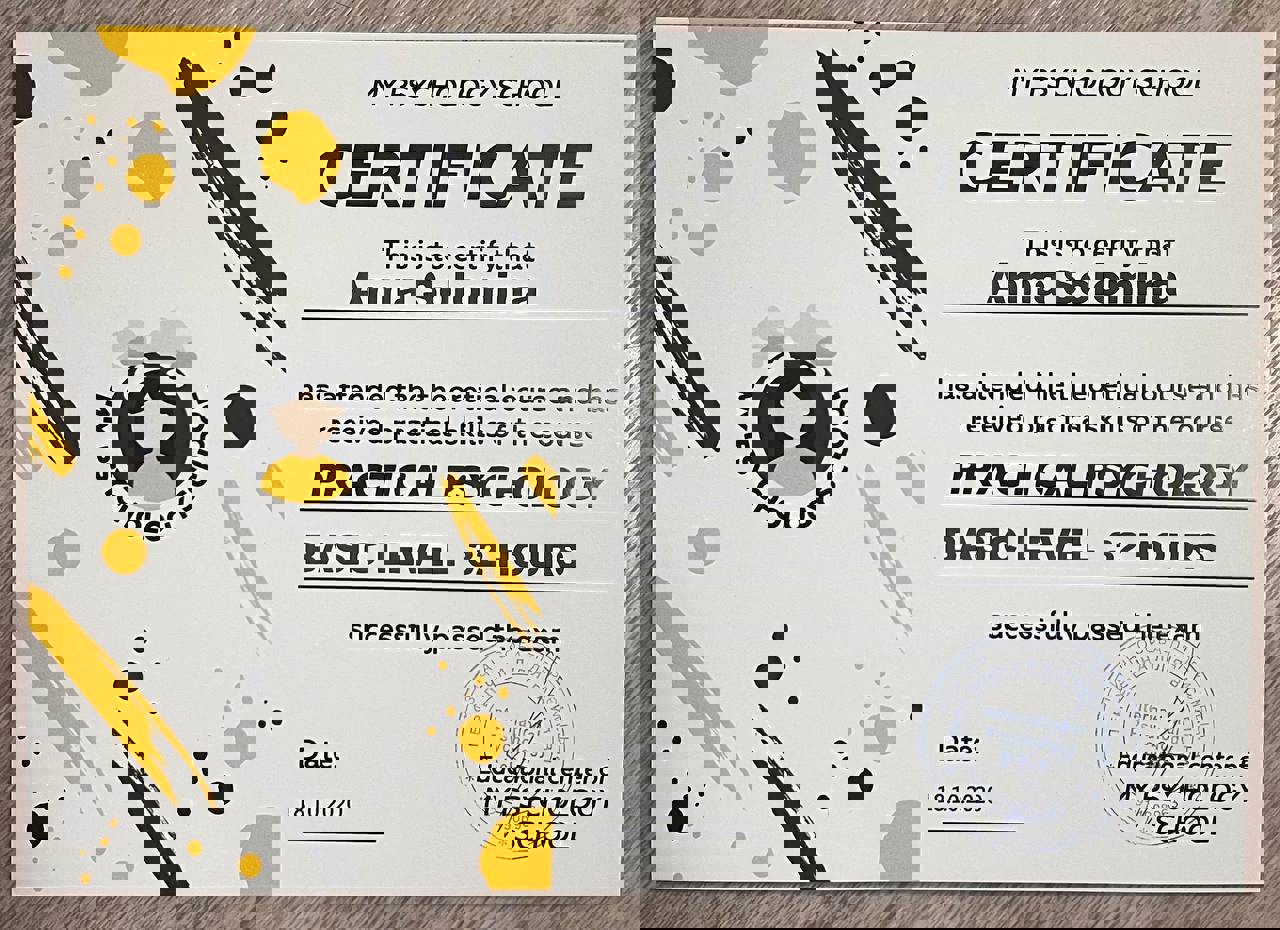 Я нахожусь в непрерывном процессе обучения и повышения квалификации. В настоящее время заканчиваю специализацию "Психосоматика в Символдраме", параллельно начала обучение на двух дополнительных курсах "Травмотерапия" и "Детская и подростковая психотерапия"