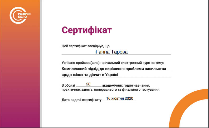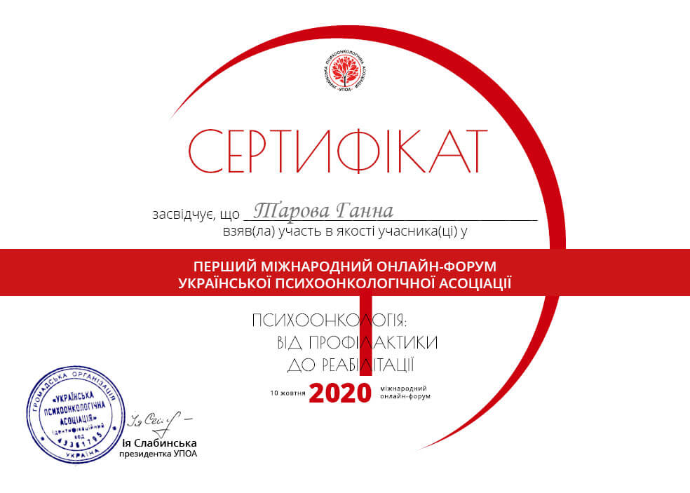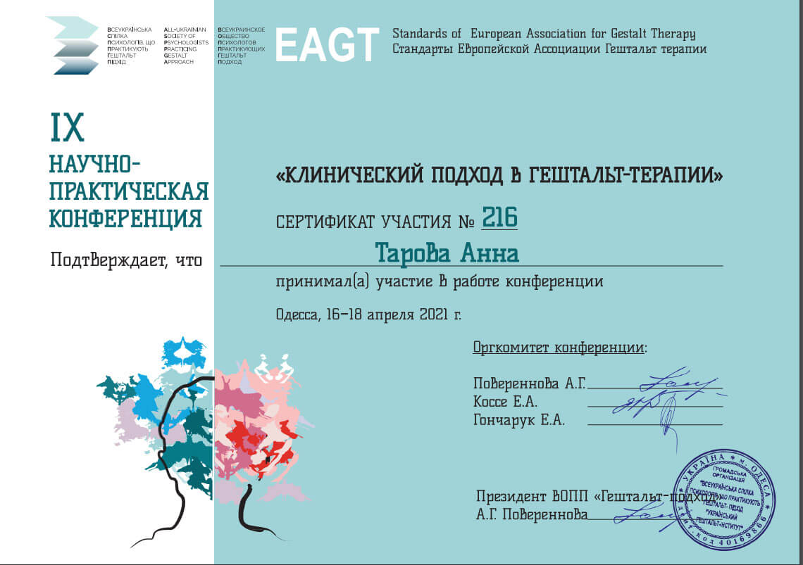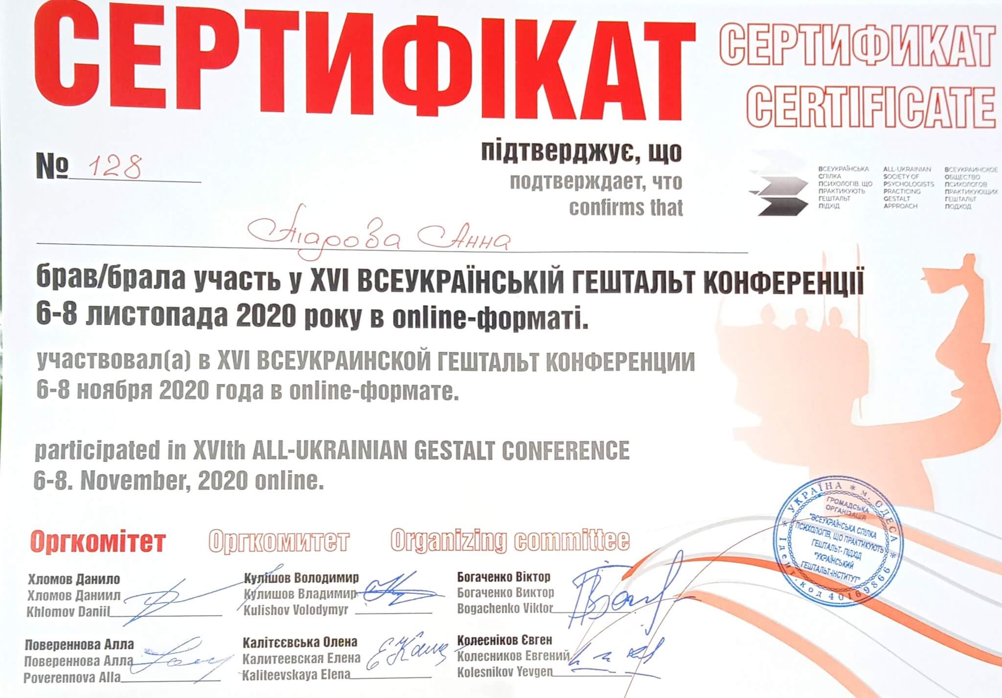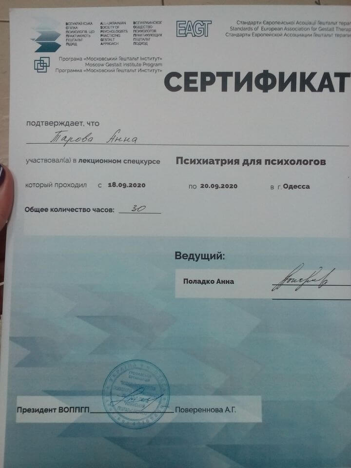 закончила магистратуру по психологии в Южно-Украинском педагогическом университете им. Ушинского, первую ступень гештальт-программы (тренеры Е.Колесников, Е.Тыцкая), в настоящее время обучаюсь на второй ступени гештальт-программы пройдено 450 часов (тренеры Е.Колесников, В.Кулишов, Е.Тыцкая), также окончила специализацию "Работа с травмой насилия в гештальт-подходе" (линейный тренер В. Серлик, сертифицирующий тренер А. Повереннова), прошла курс "Пропедевтика психиатрии" (ведущая А.Поладко).