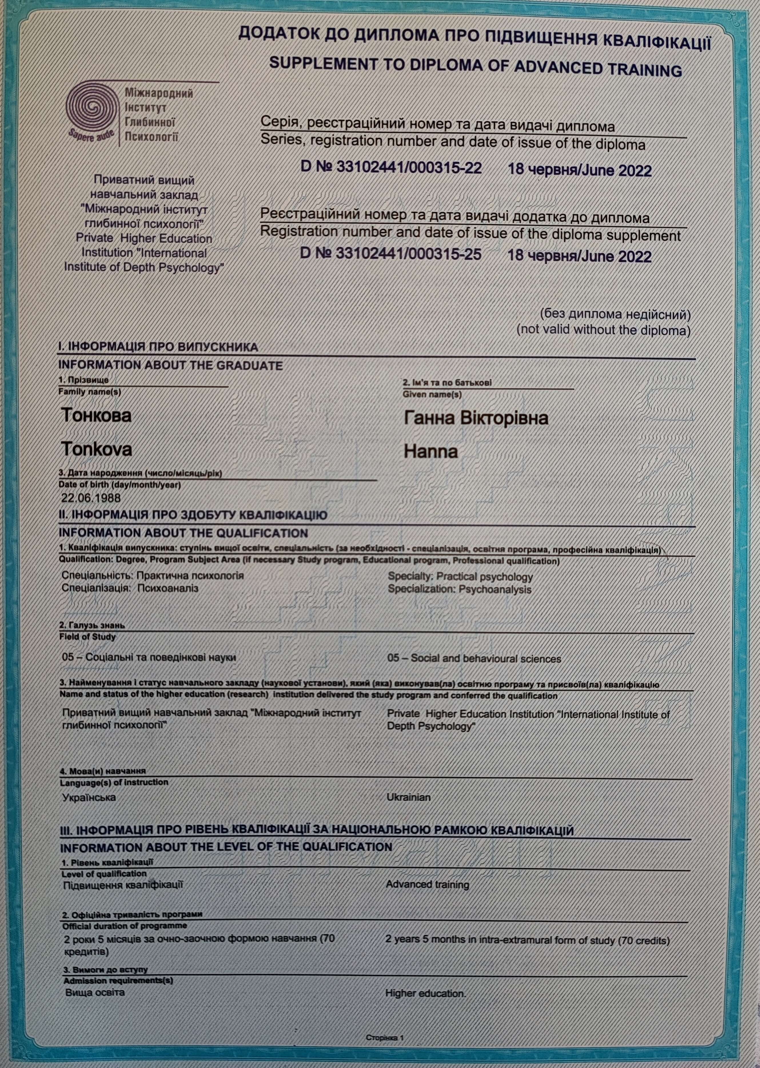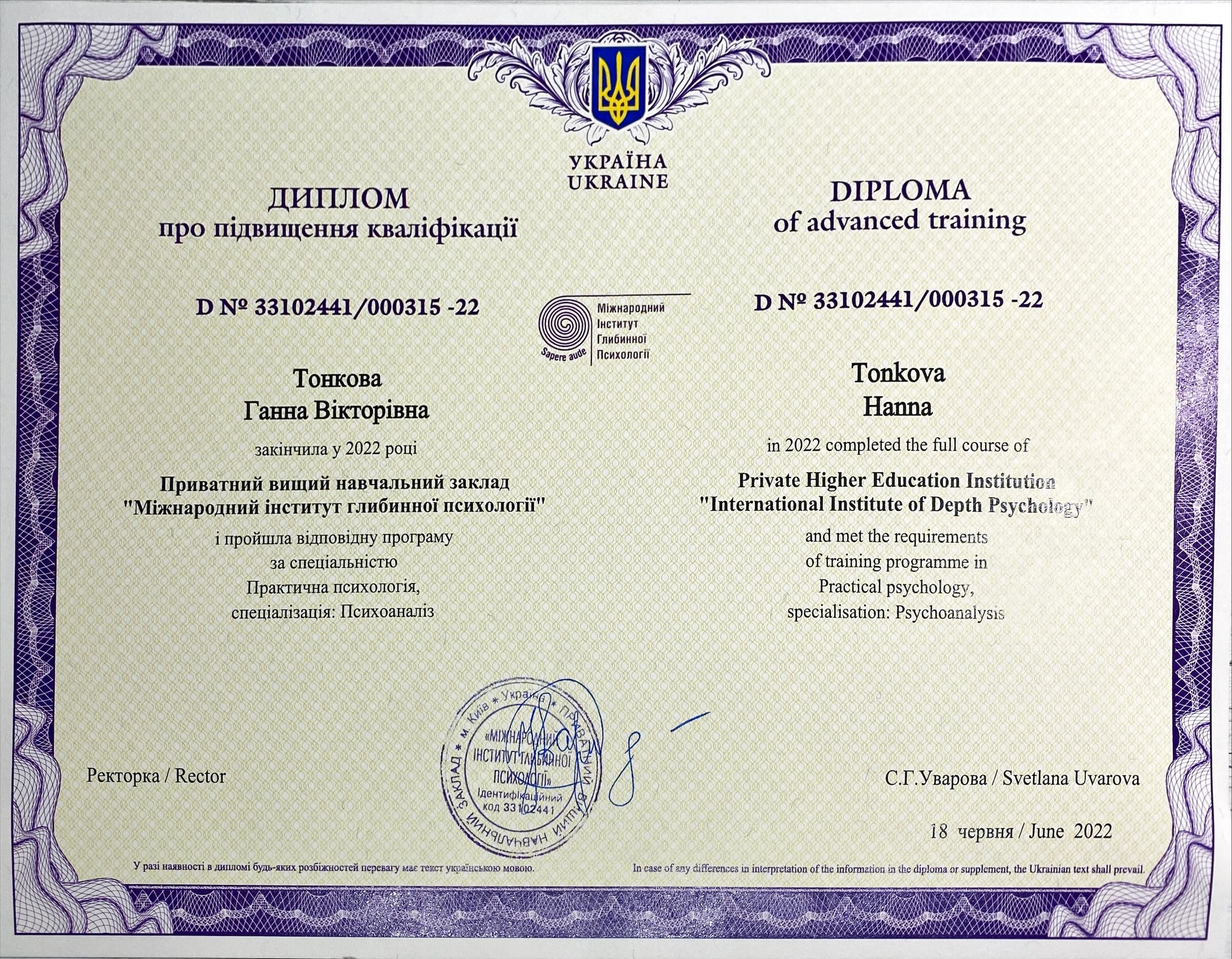 - Международный институт глубинной психологии. Практическая психология. Специализация: психоанализ.