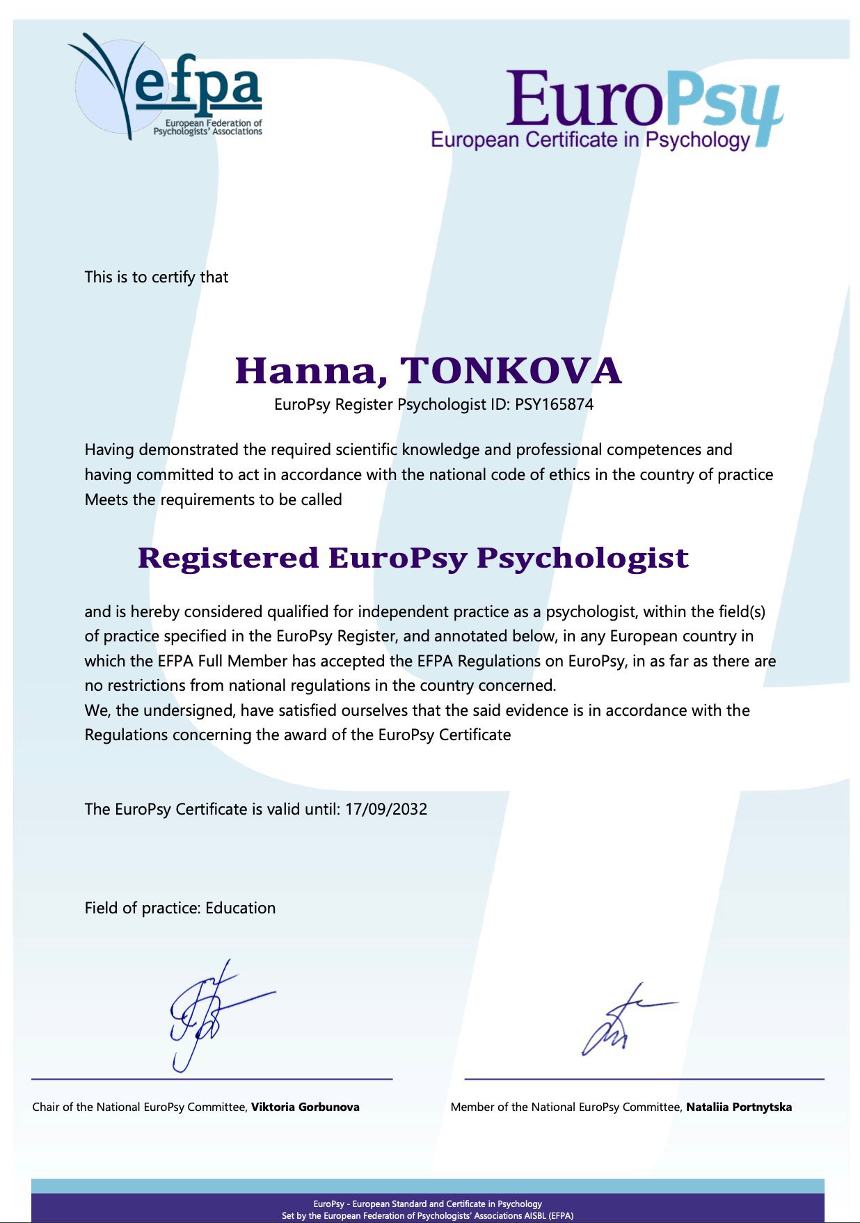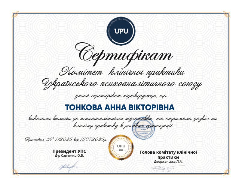 Практикующий психолог, психоаналитик. Состою в профессиональных сообществах: Национальная психологическая ассоциация Украины и Украинский психоаналитический союз.