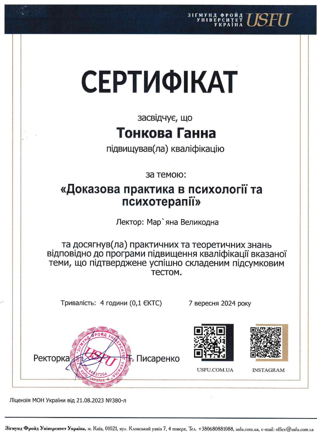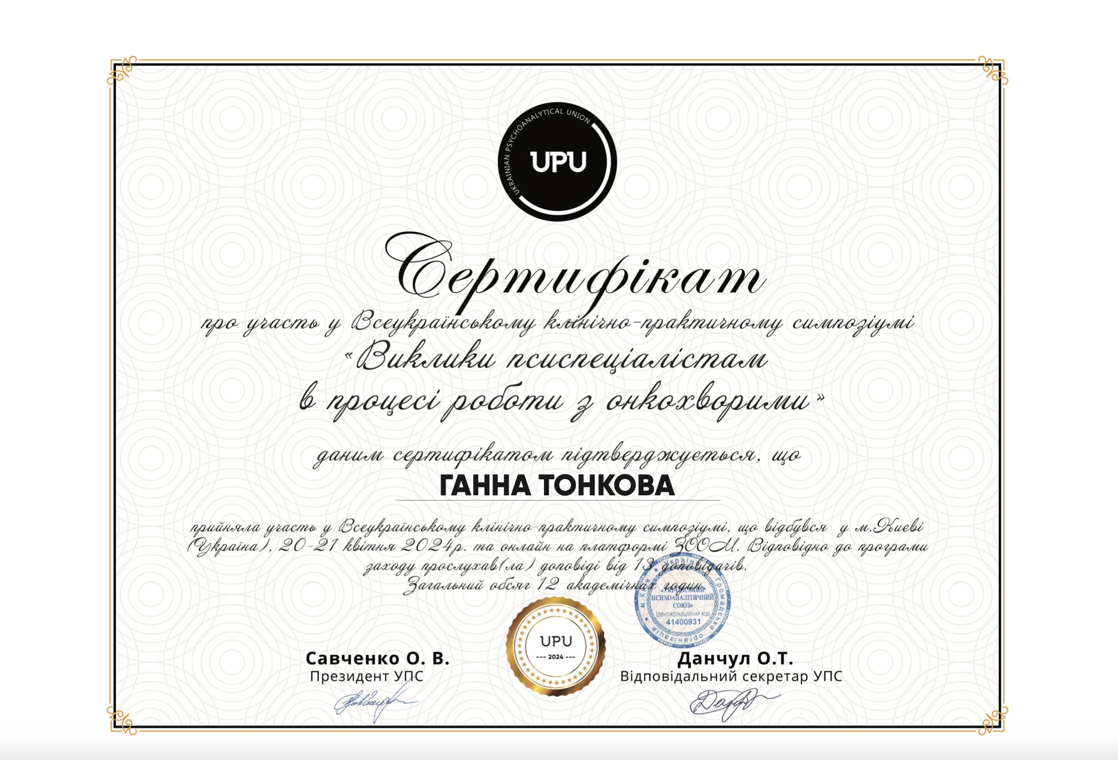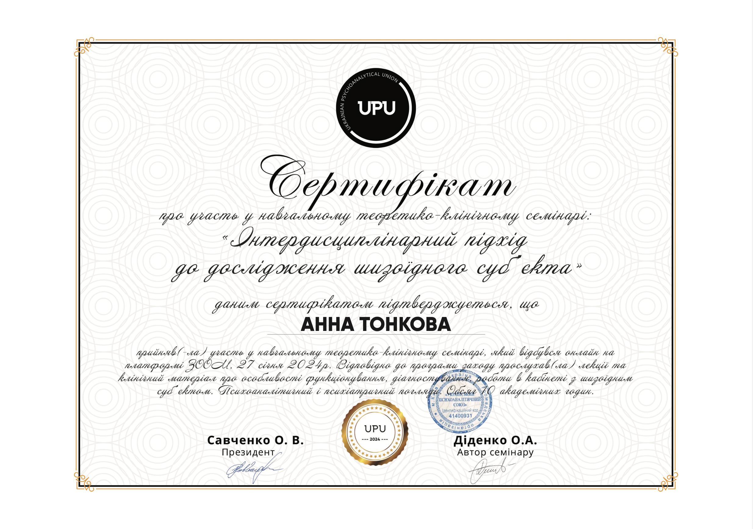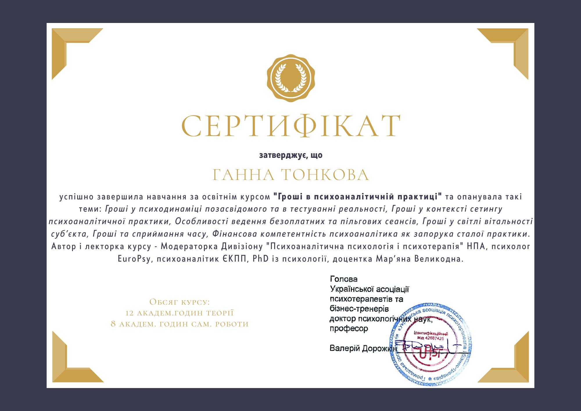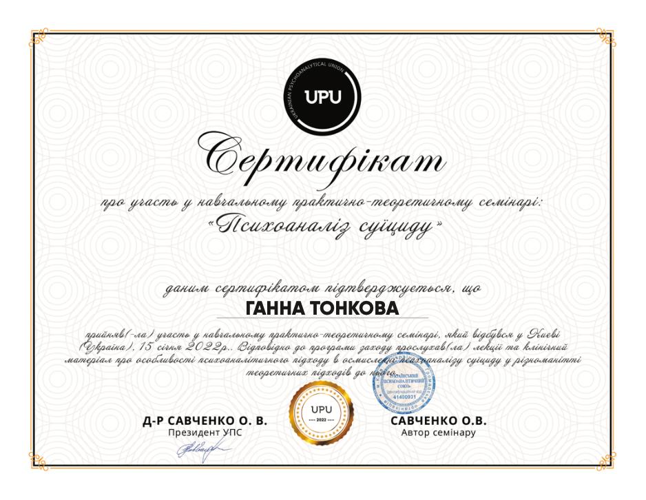 - Курс пропедевтики психиатрии (Украинский союз психотерапевтов, 156 часов, 2023) и др.