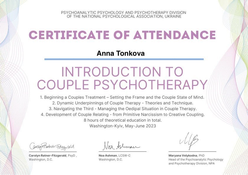 - Курс Іntroduction to Couple Psychotherapy (курс американских экспертов по парной психотерапии Carolyn Ratner-Fitzgerald и Noa Ashman для специалистов НПА, 2023)