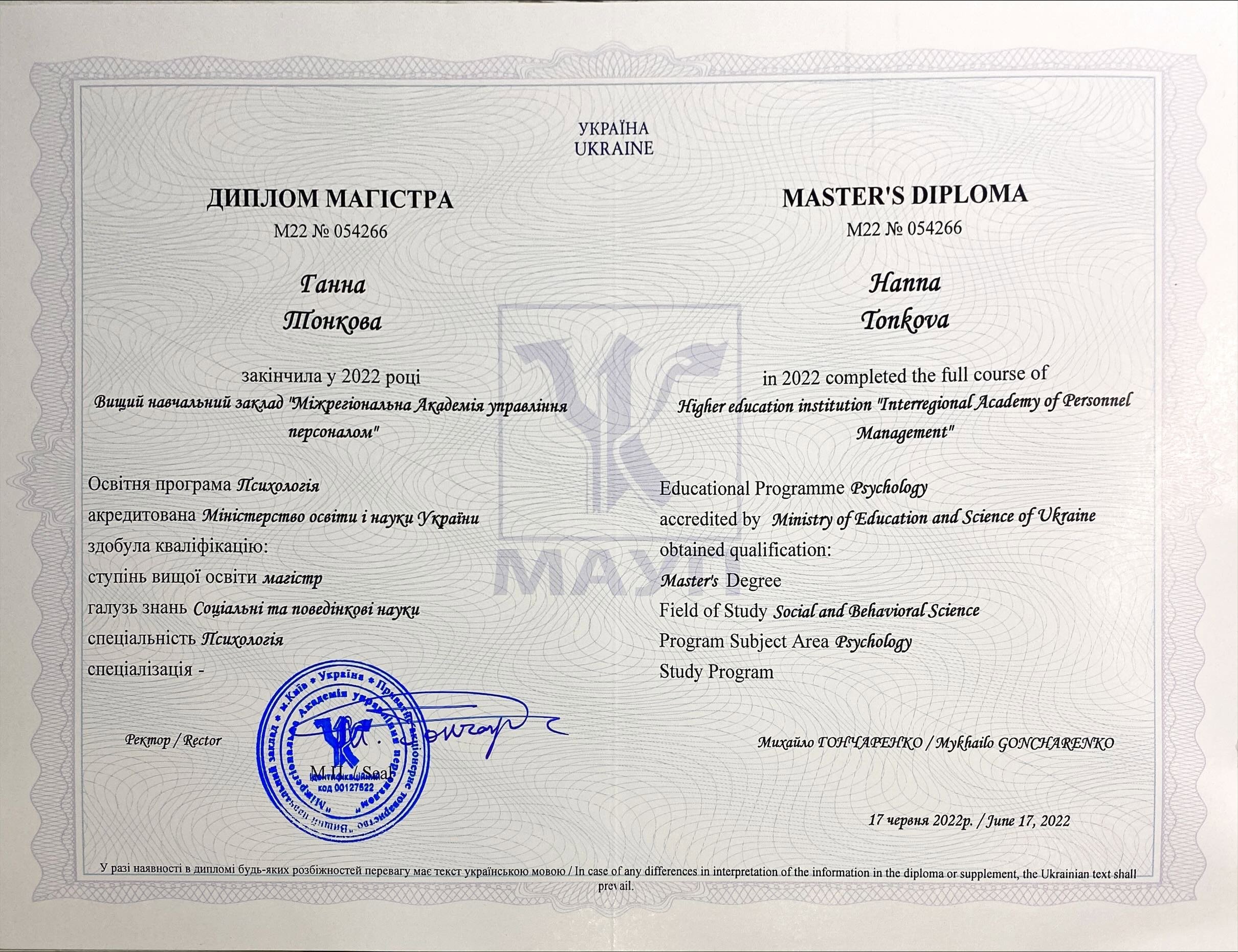 - Межрегиональная Академия управления персоналом. Специальность: психология (магистр).