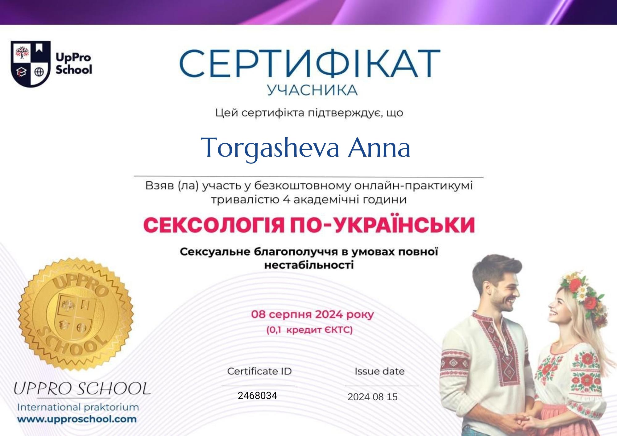 • Сертификат, практикум "Сексуальное благополучие в условиях полной нестабильности", август 2024 г.;