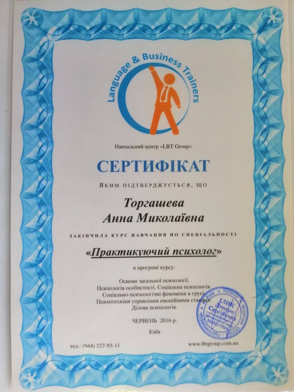 • Сертификат, курс "Практикующий психолог", 2016 г.;