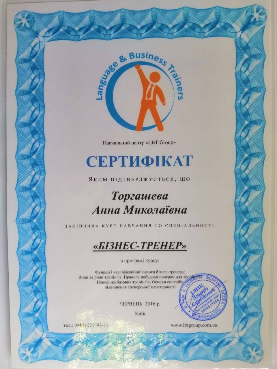 • Сертификат, курс "Бизнес-тренер", 2016;
