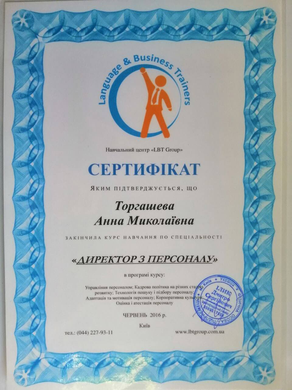 • Сертификат, курс "Директор по персоналу", 2016г.