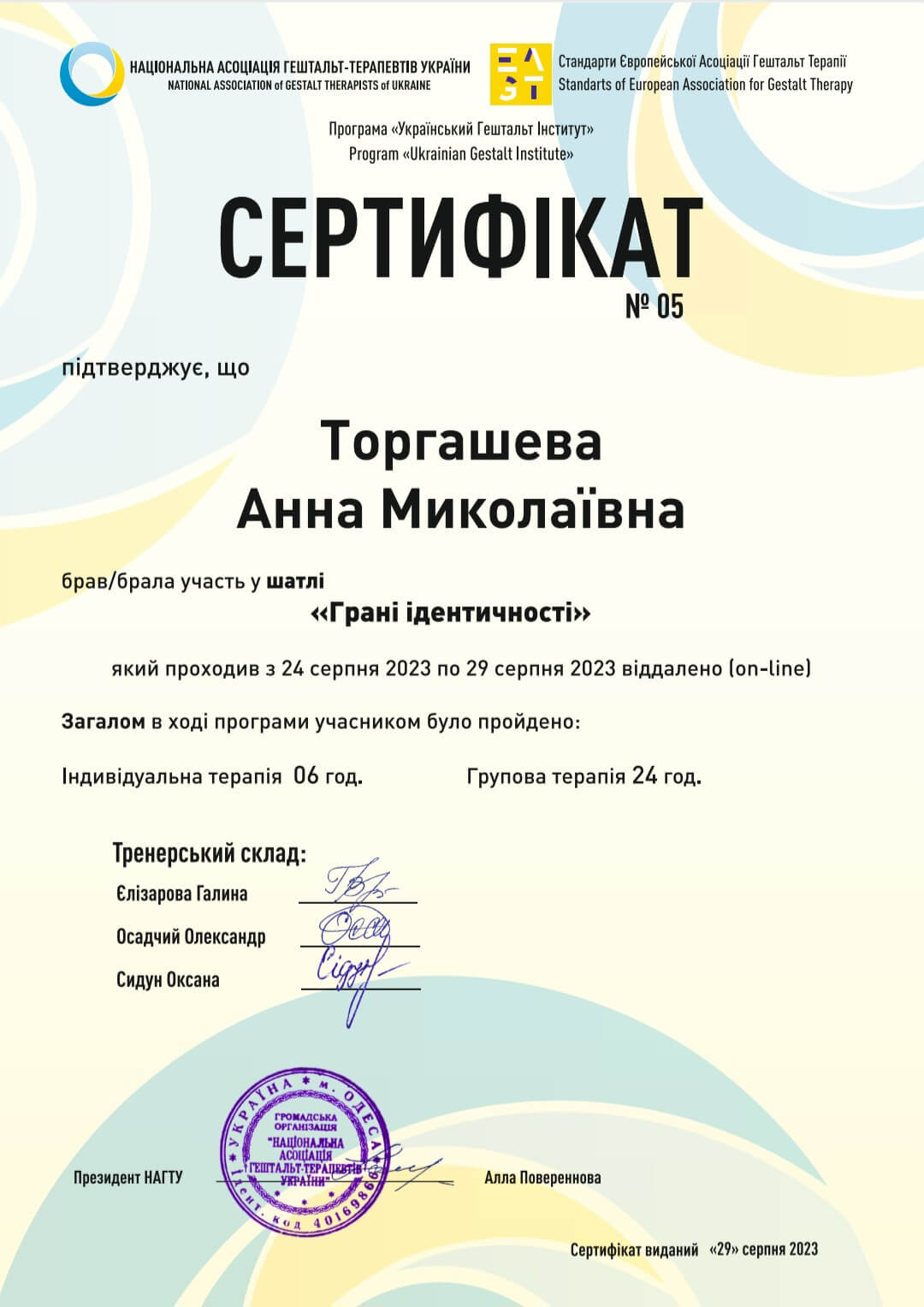 • В настоящее время учусь на ІІ степени (4-й год) на гештальт-терапевта в НАГТУ (Национальная ассоциация гештальт-терапевтов Украины), с 2020 г.