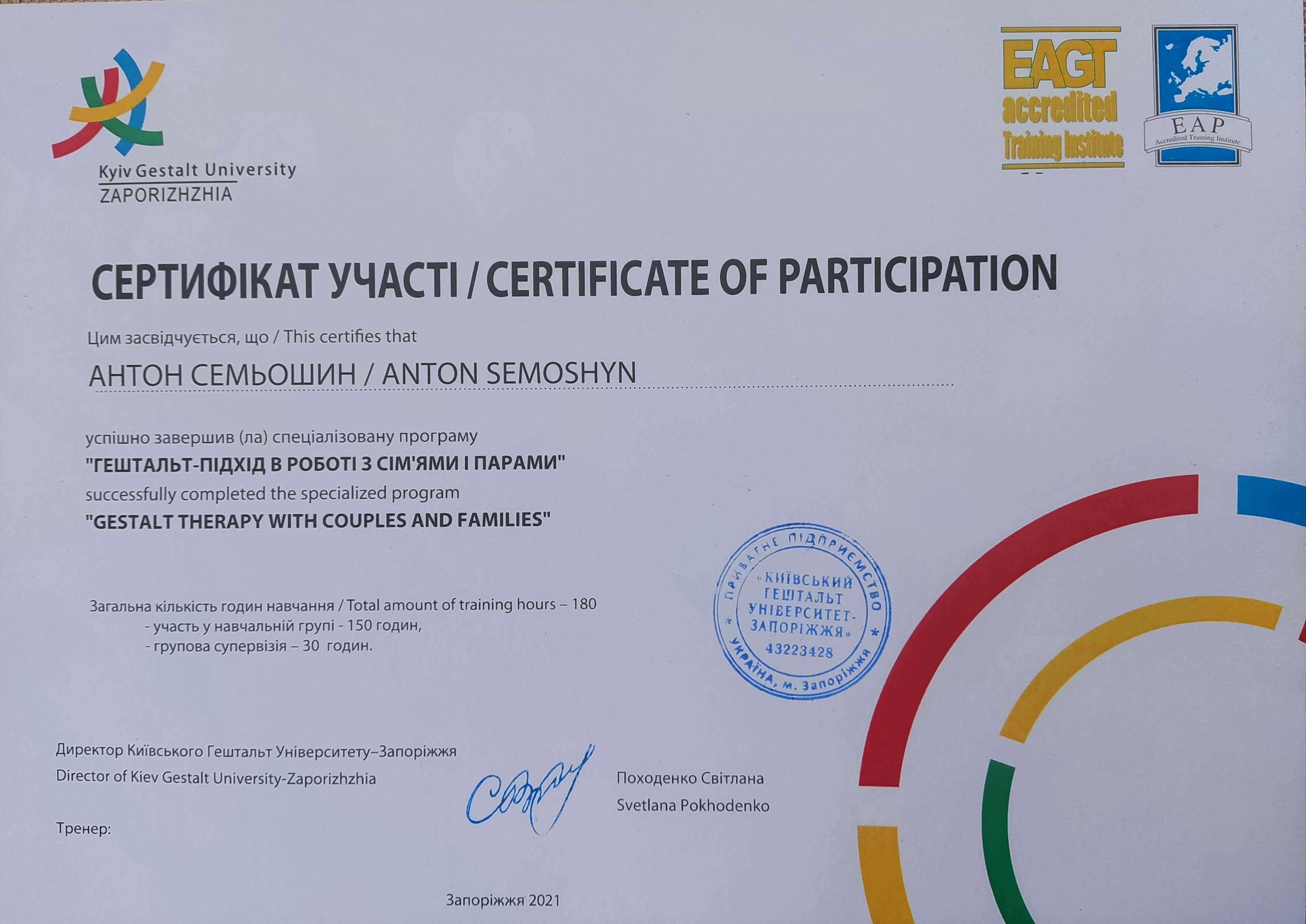 Практикующий гештальт-терапевт. Психолог. Семейный психотерапевт. Групповой психотерапевт.Обучающий тренер Киевского Гештальт Университета Запорожье.