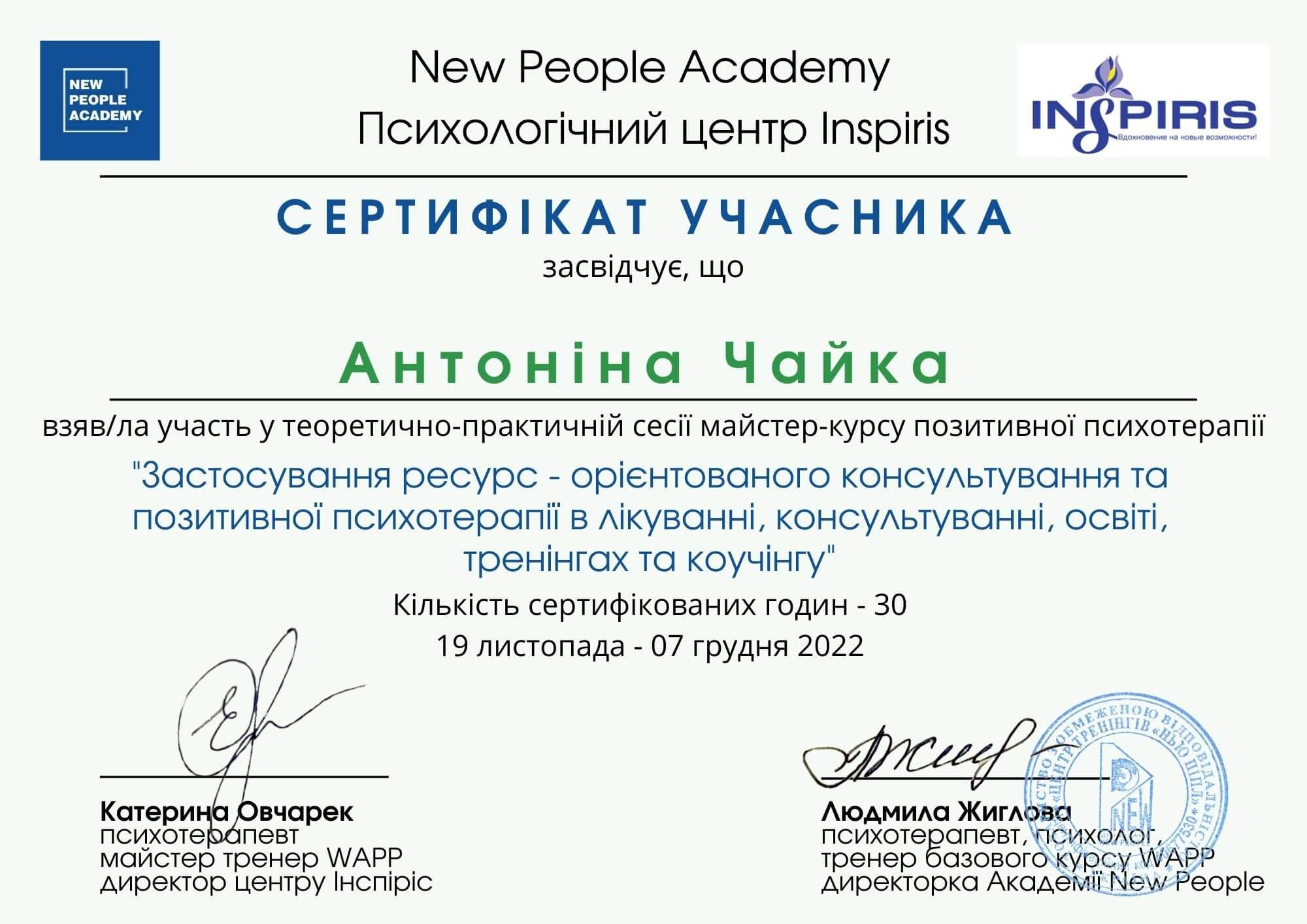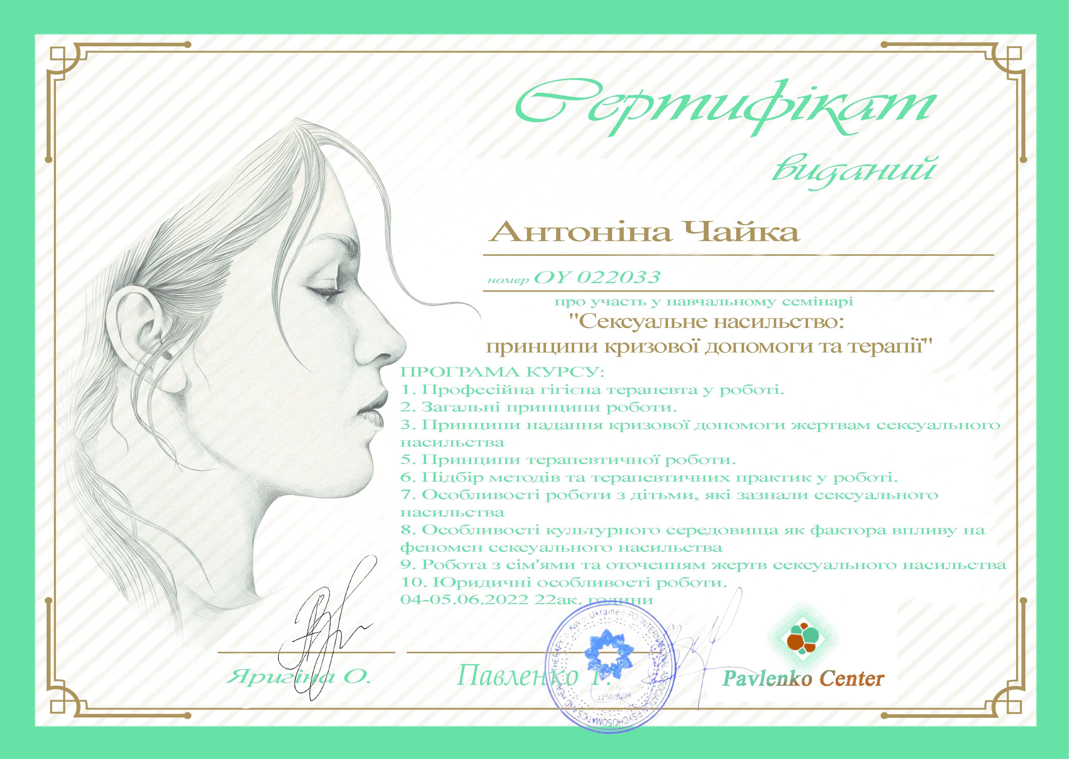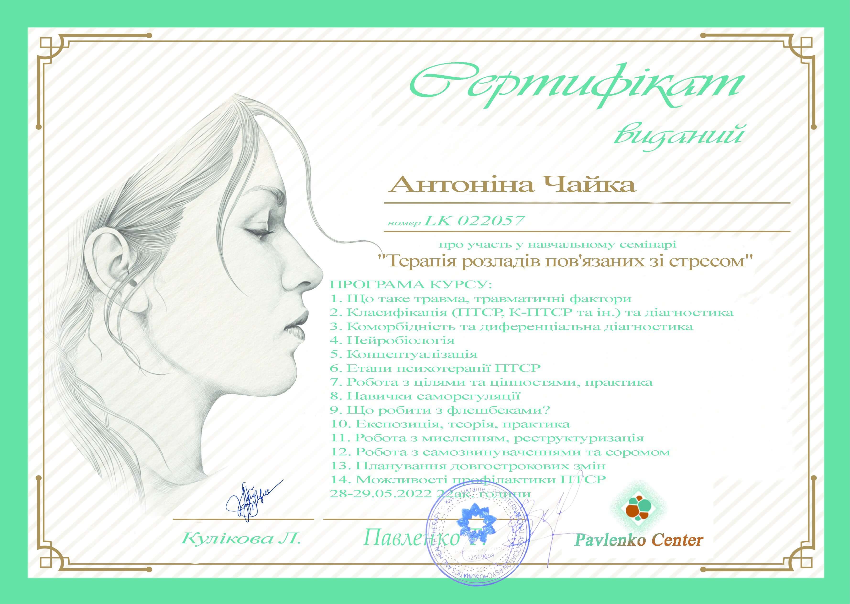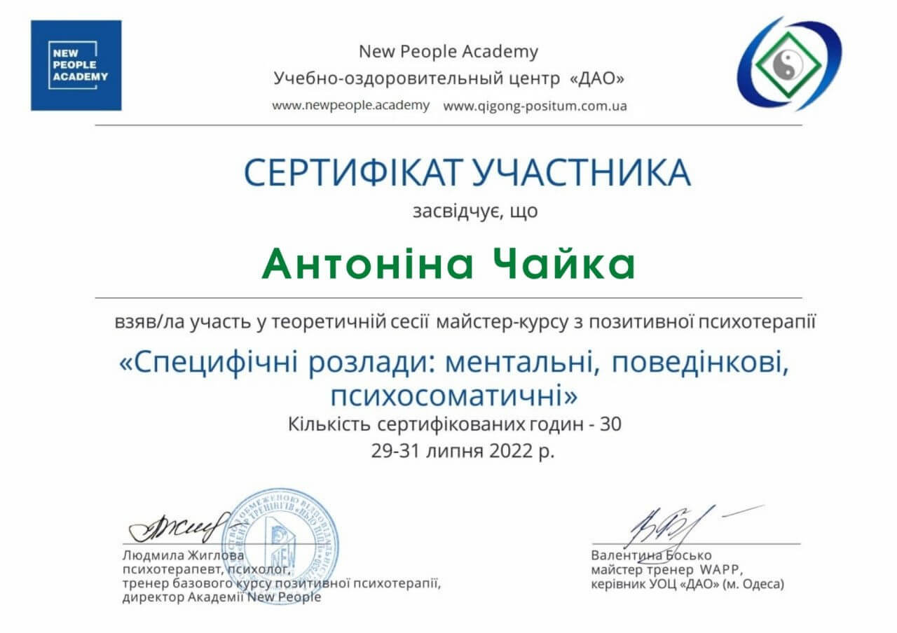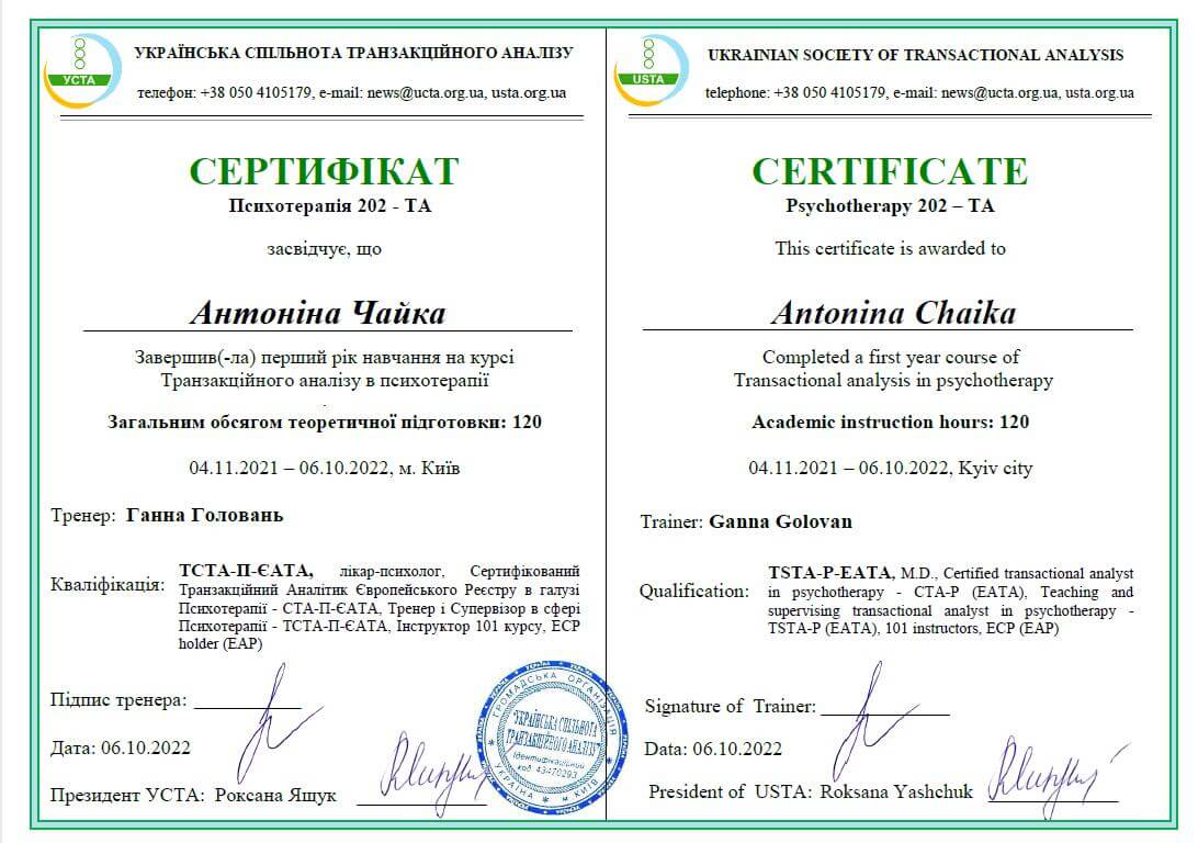 Закончила полный курс "Пропедевтика психиатрии и ряд программ по работе с психологической травмой и ПТСР