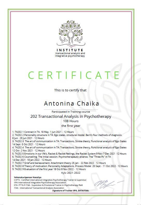 Заканчиваю обучение в Институте Интегративной психотерапии и Транзакционного анализа