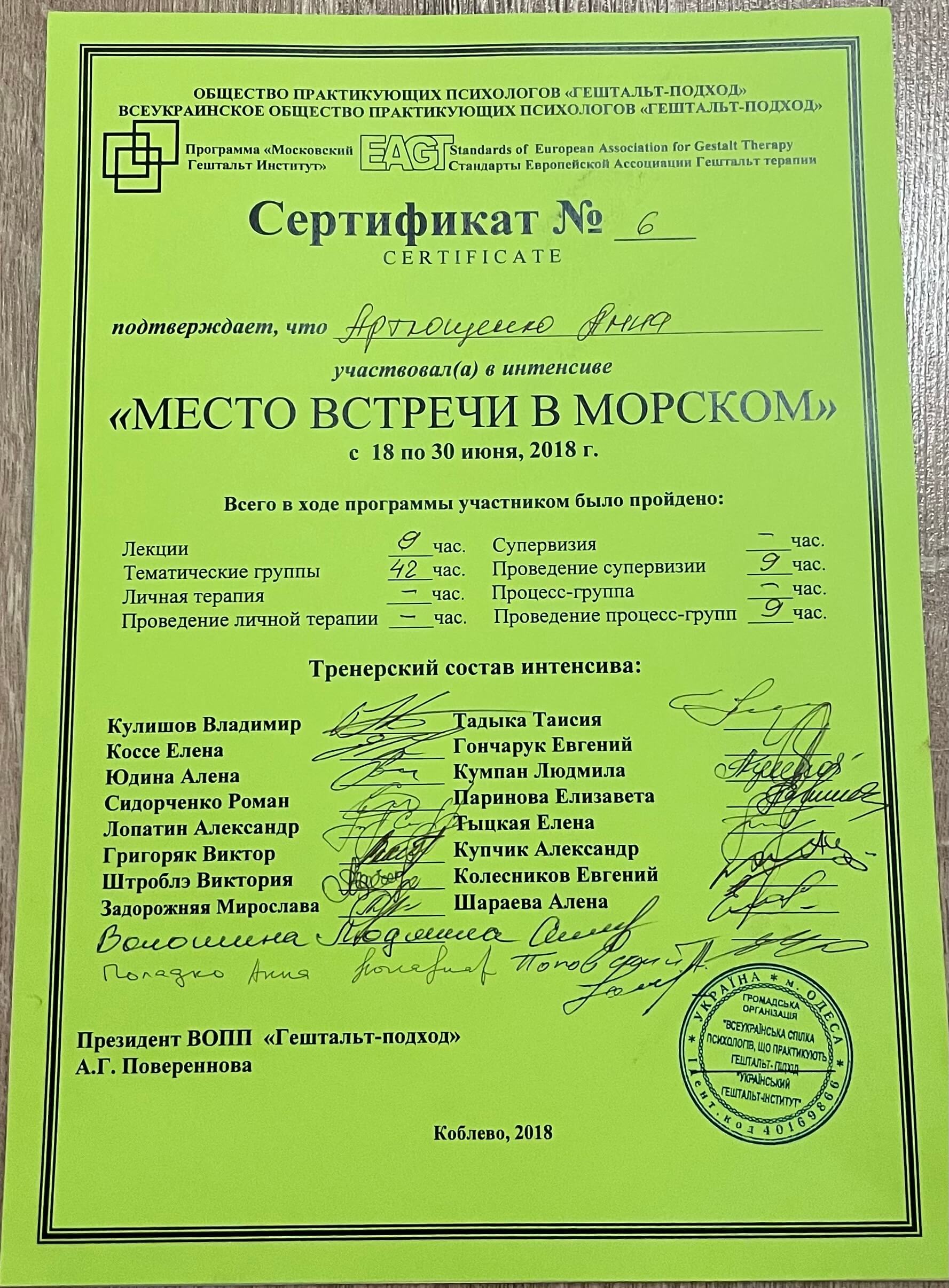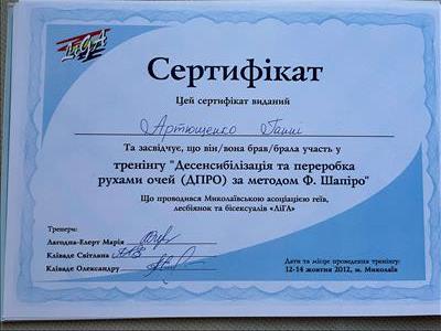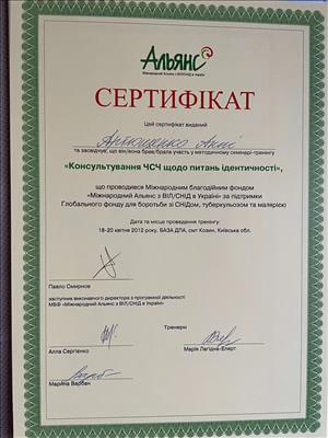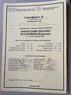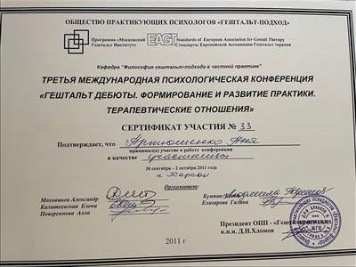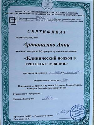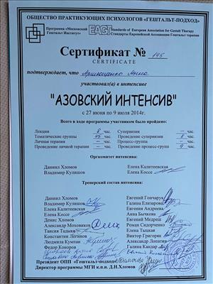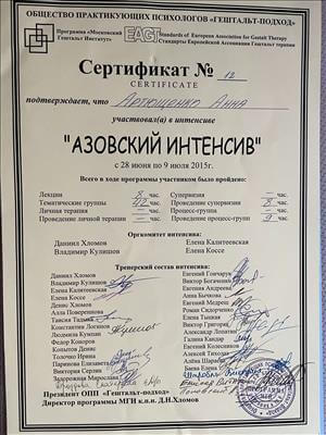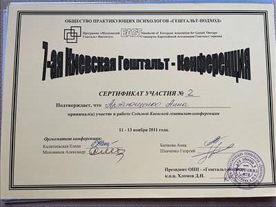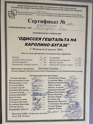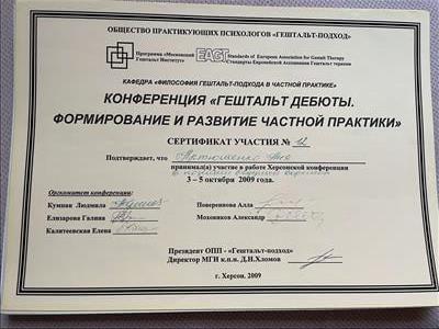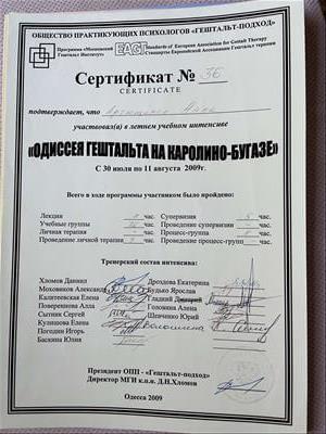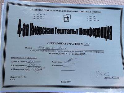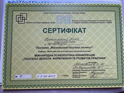 Базовое образование психолога Херсонский государственный университет. Второе образование институт им. Драгоманова, а также украинский гештальт институт