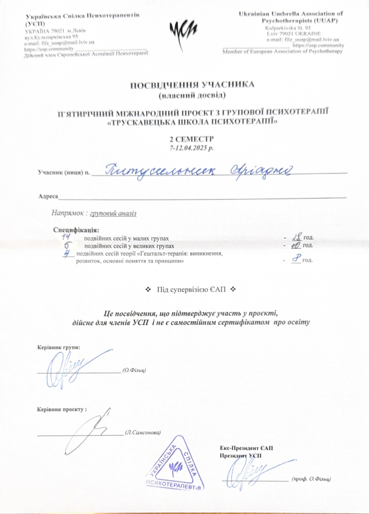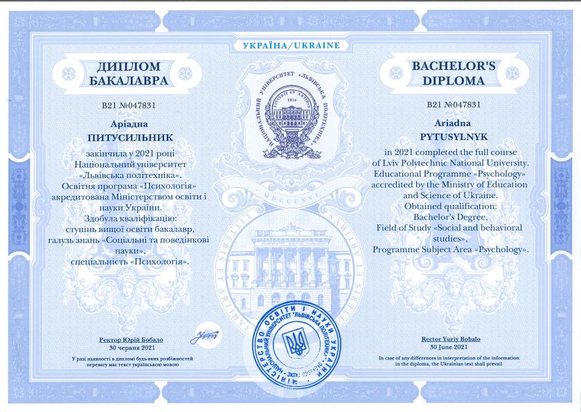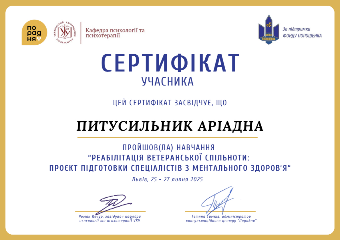 Завершила бакалавриат по специальности «Психология», далее продолжила обучение на магистратуре в Украинском Католическом Университете по программе «Клиническая психология с направлением ПДТ» и дополнительно изучала инструменты арт-терапии в специализированном учебном проекте, а сейчас обучаюсь психотерапии в методе приобретаю собственный опыт в Трускавецком проекте.