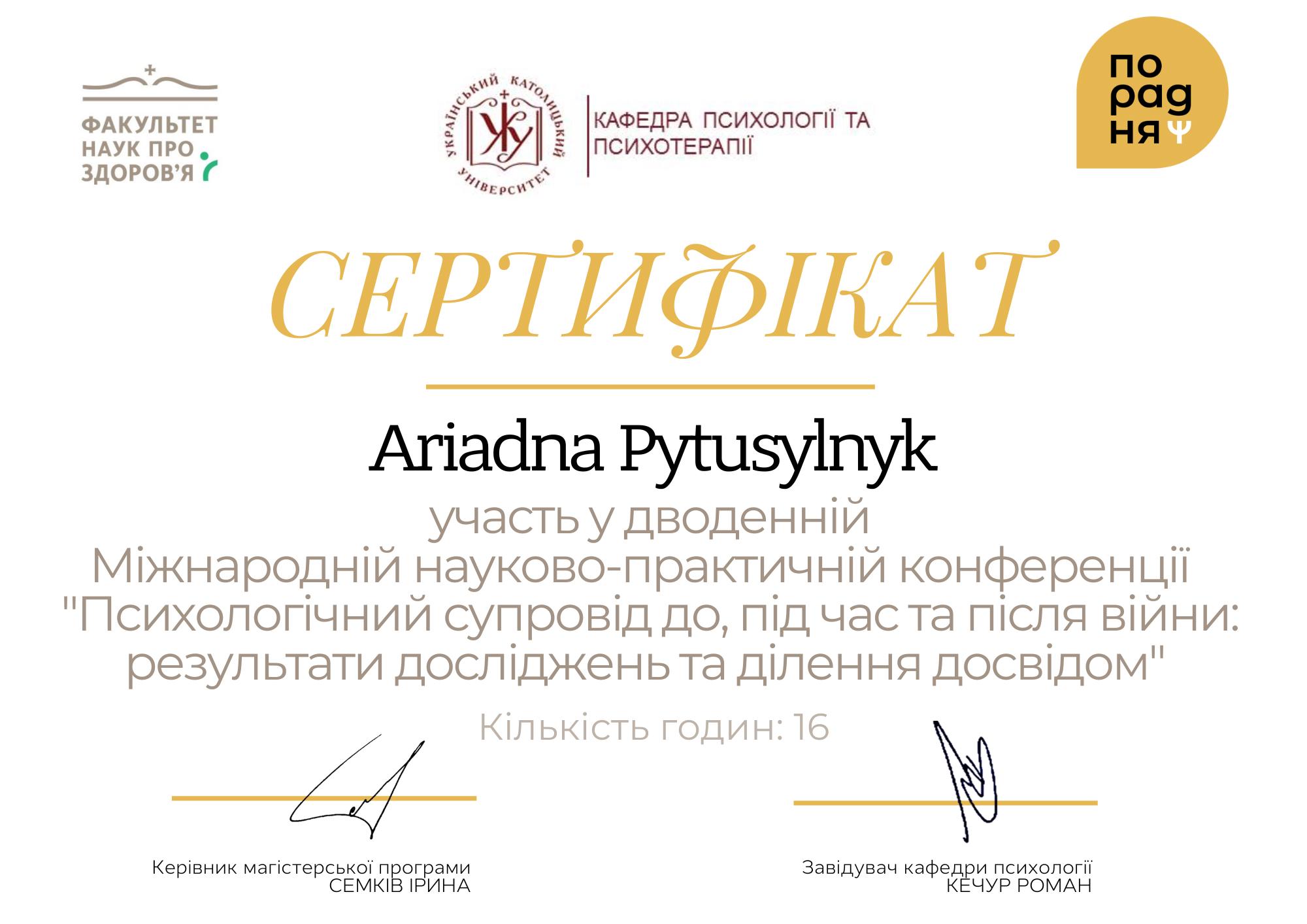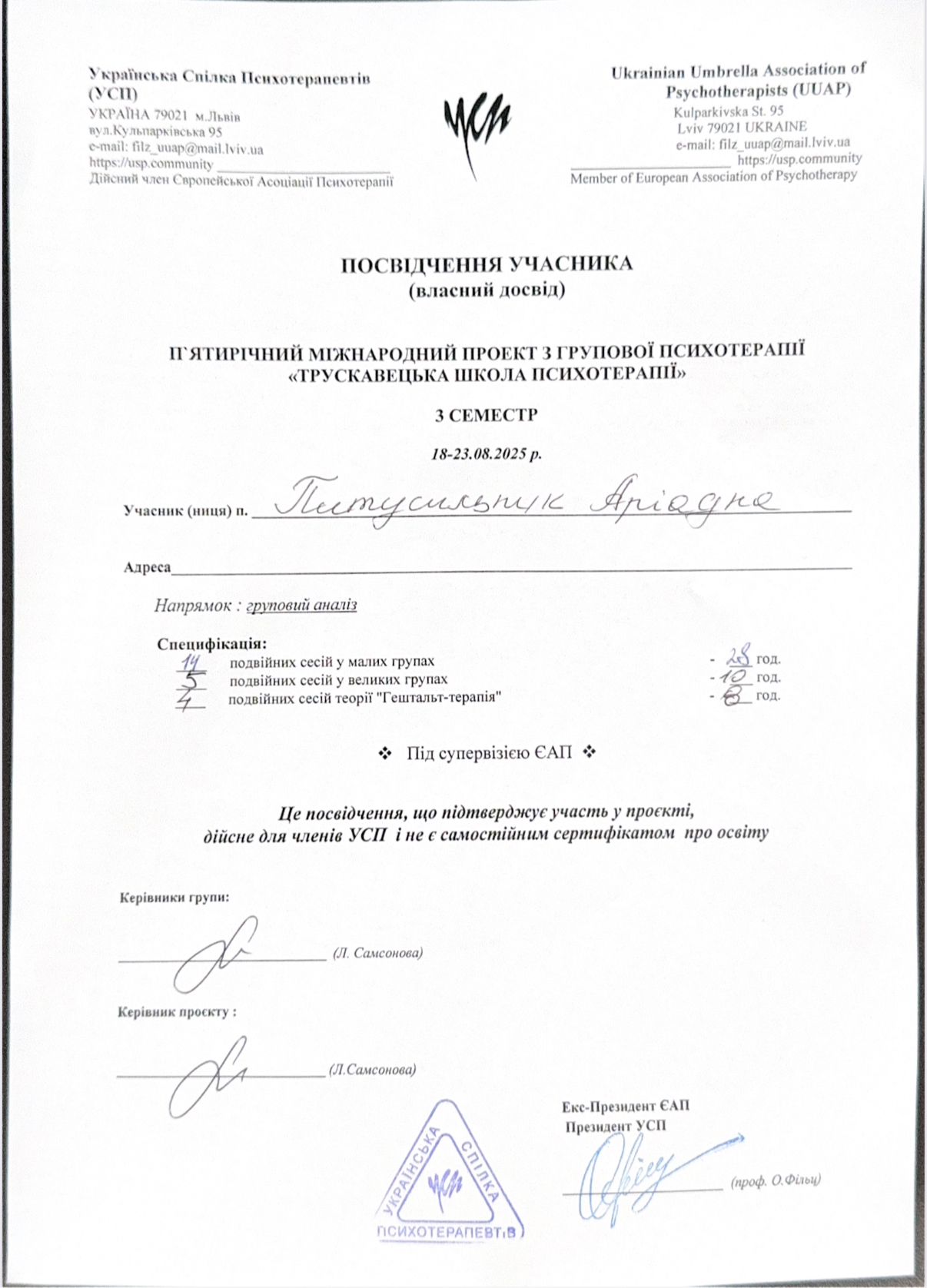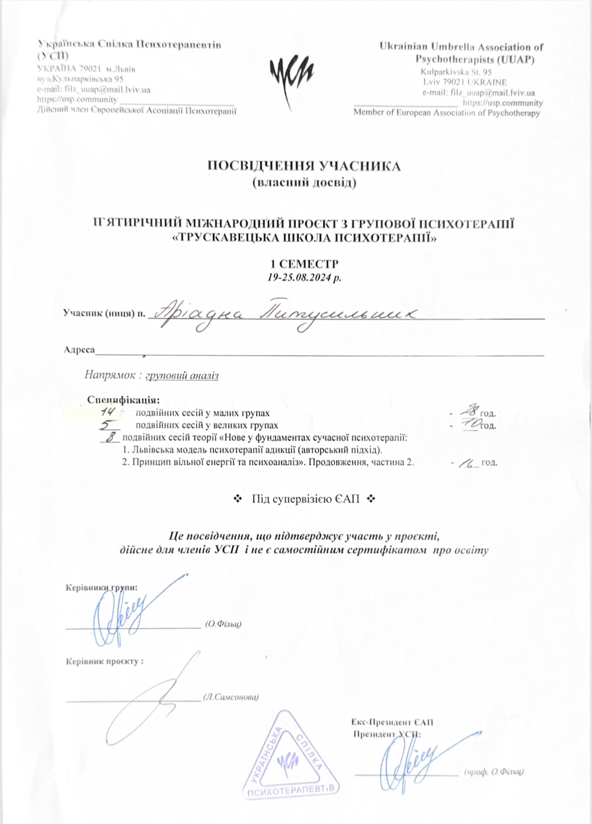 Завершила бакалавриат по специальности «Психология», далее продолжила обучение на магистратуре в Украинском Католическом Университете по программе «Клиническая психология с направлением ПДТ» и дополнительно изучала инструменты арт-терапии в специализированном учебном проекте, а сейчас обучаюсь психотерапии в методе приобретаю собственный опыт в Трускавецком проекте.