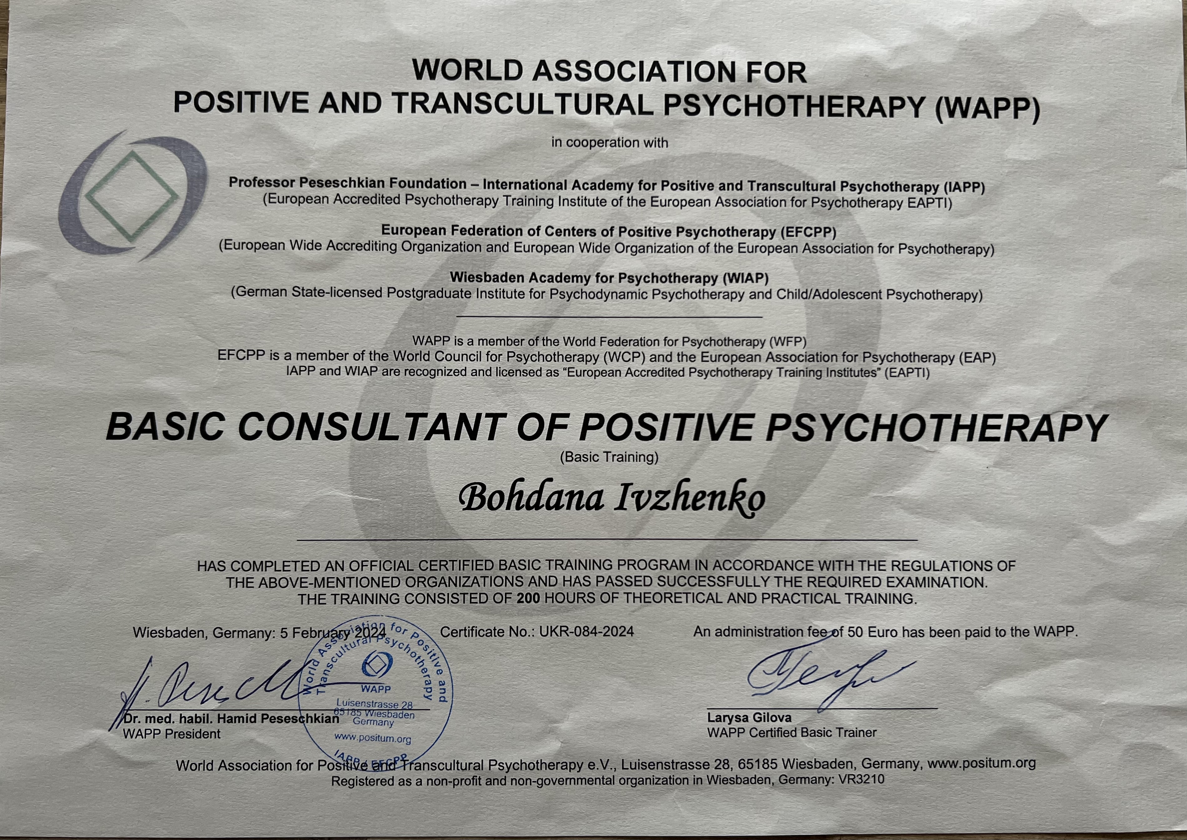 Работаю в методе положительной психотерапии. Эмпатийна, чувствительна и очень внимательна к клиентам. Все пройденные мной курсы повышения квалификации помогают в разных особых ситуациях услышать и понять клиента.