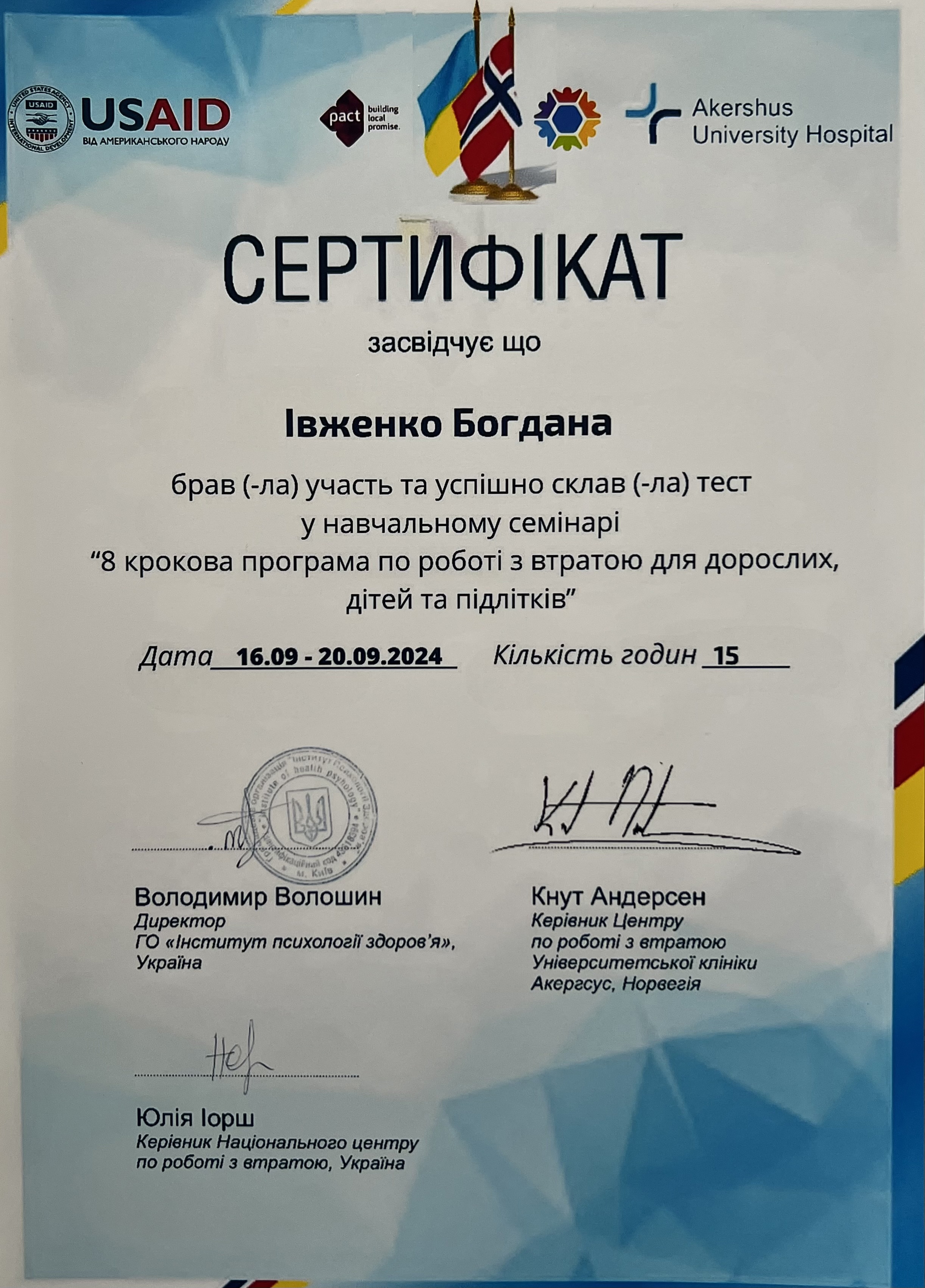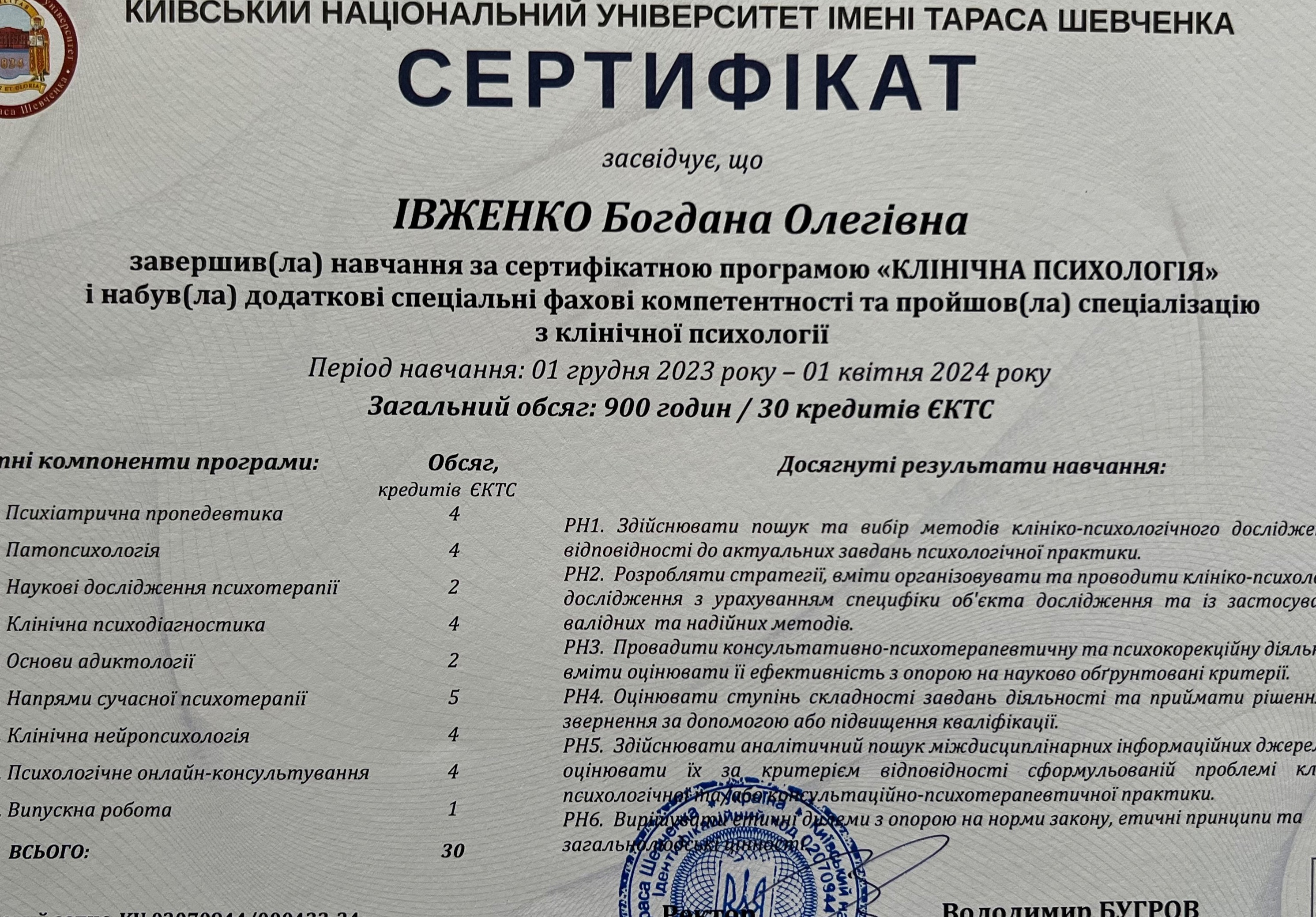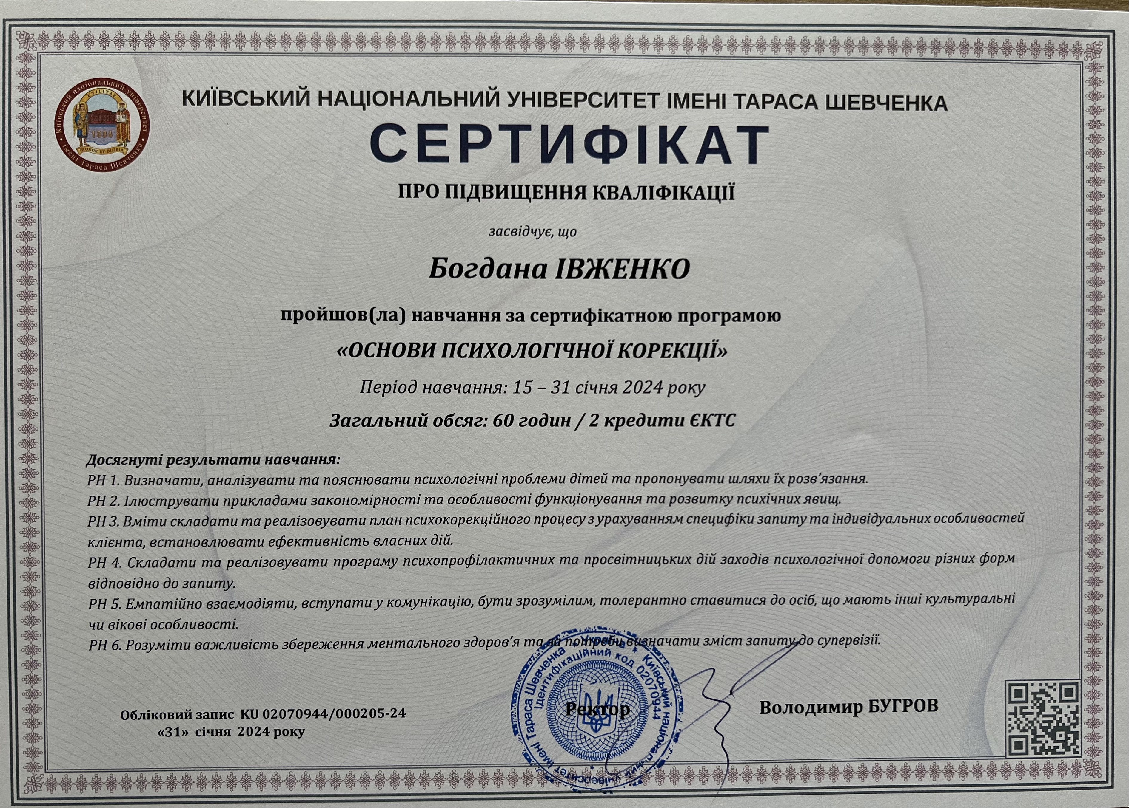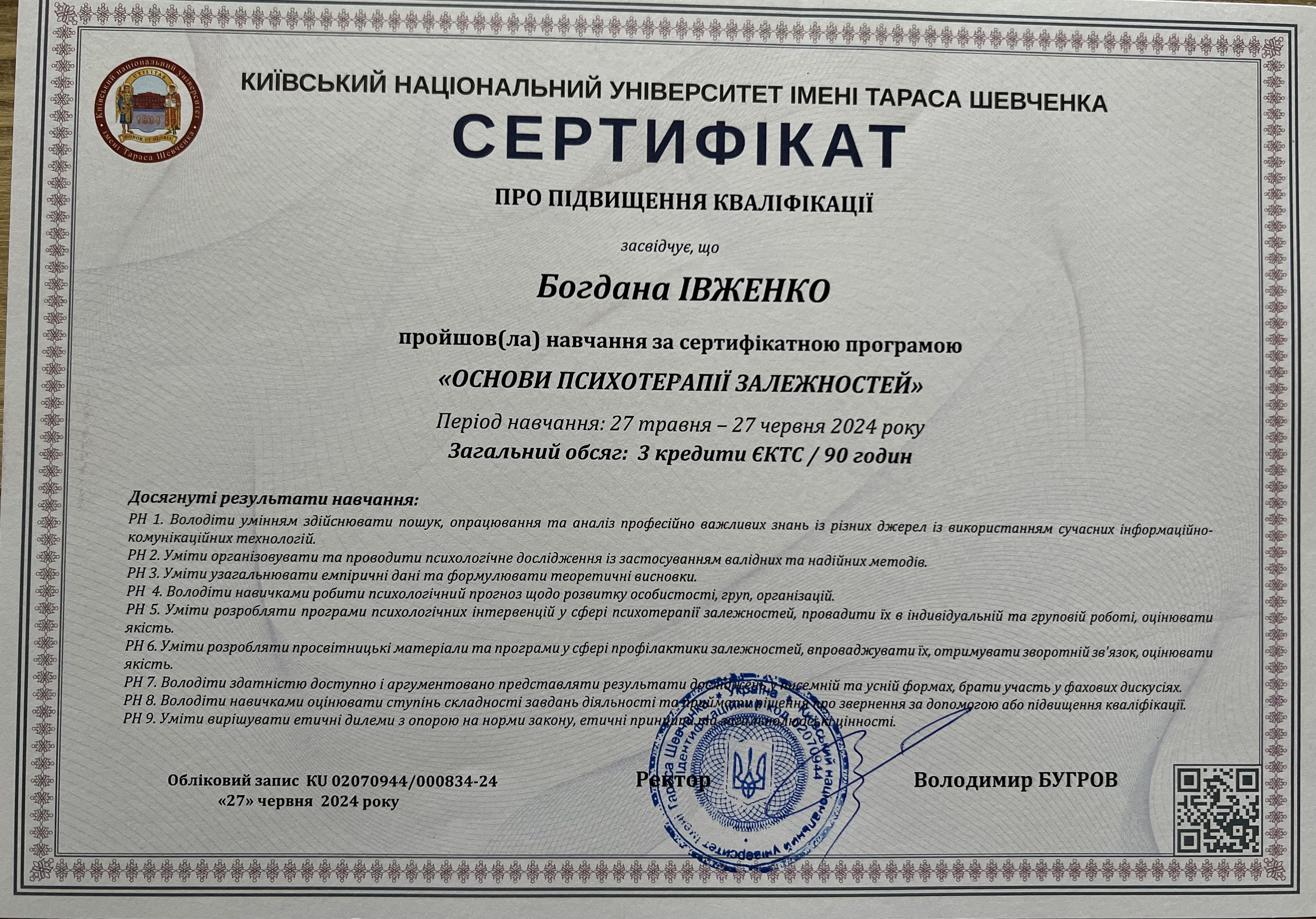 Клиническая психология; курс по зависимостям; Коррекционная деятельность с особыми детьми – ин-т им. Шевченко г. Киев
