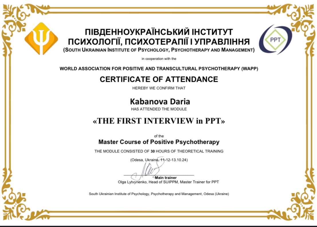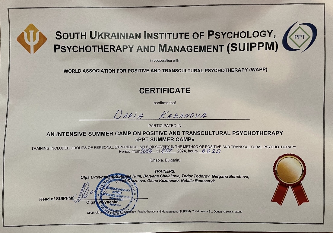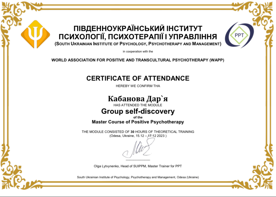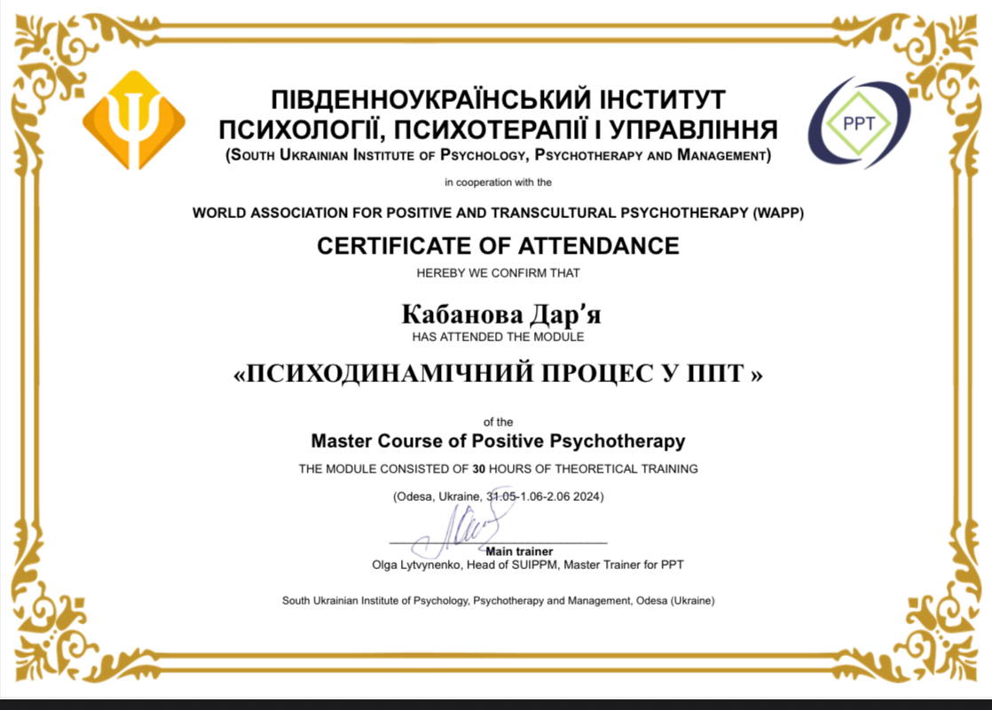 2. Южноукраинский институт психологии, психотерапии и менеджмента. Специальность «Консультант по методу Позитивная и транскультуральная психотерапия».