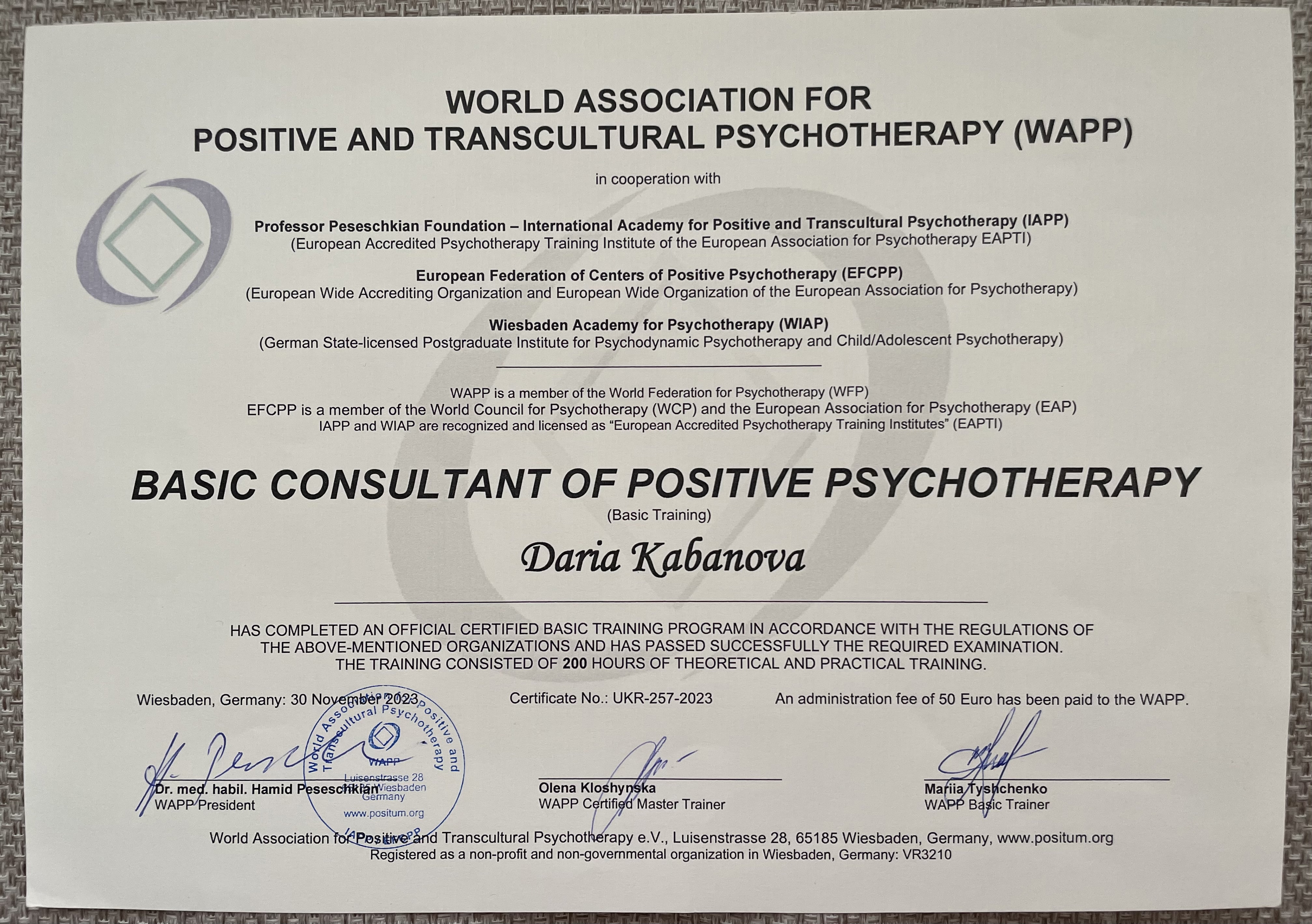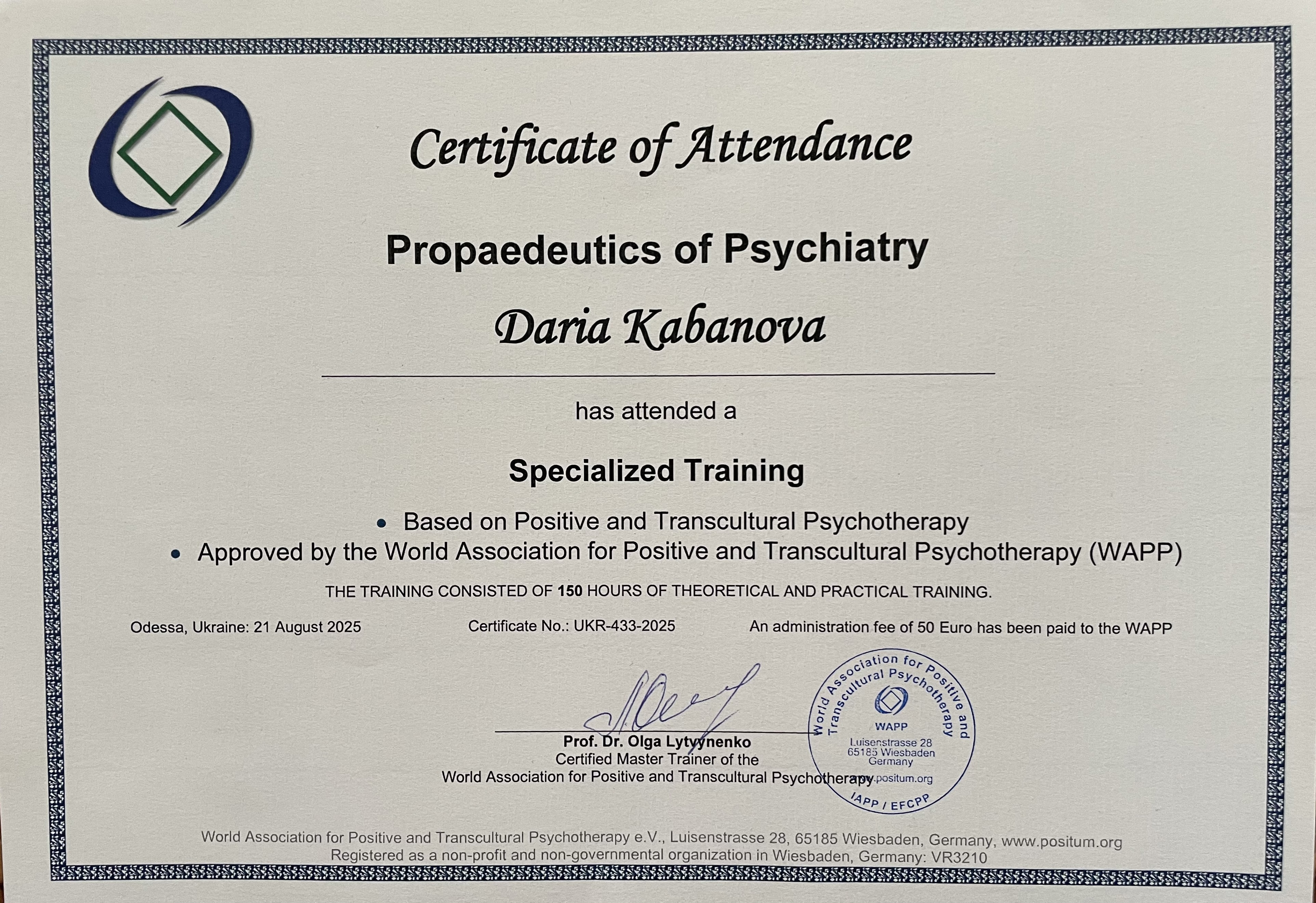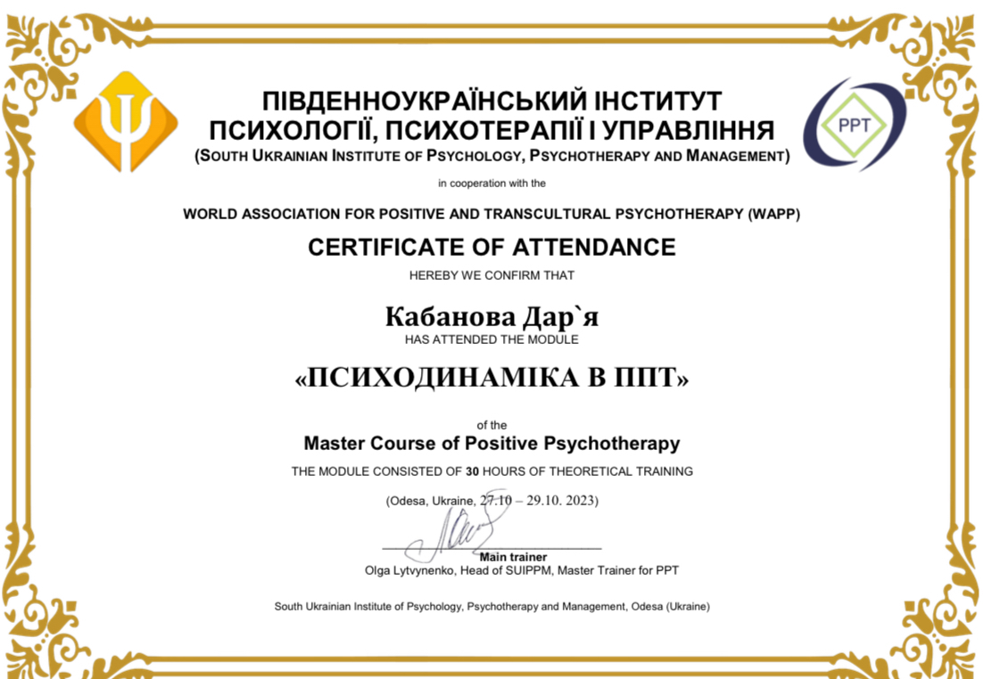 2. Южноукраинский институт психологии, психотерапии и менеджмента. Специальность «Консультант по методу Позитивная и транскультуральная психотерапия».