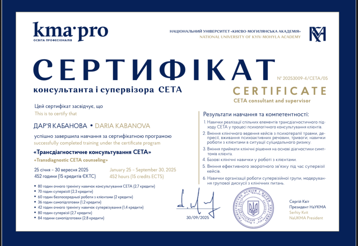Прохожу много обучения по психологии и психотерапии. В 2025 году стала консультантом и супервизором в программе "Сета". Также в 2025 году завершила годовую учебу по пропедевтике психиатрии.