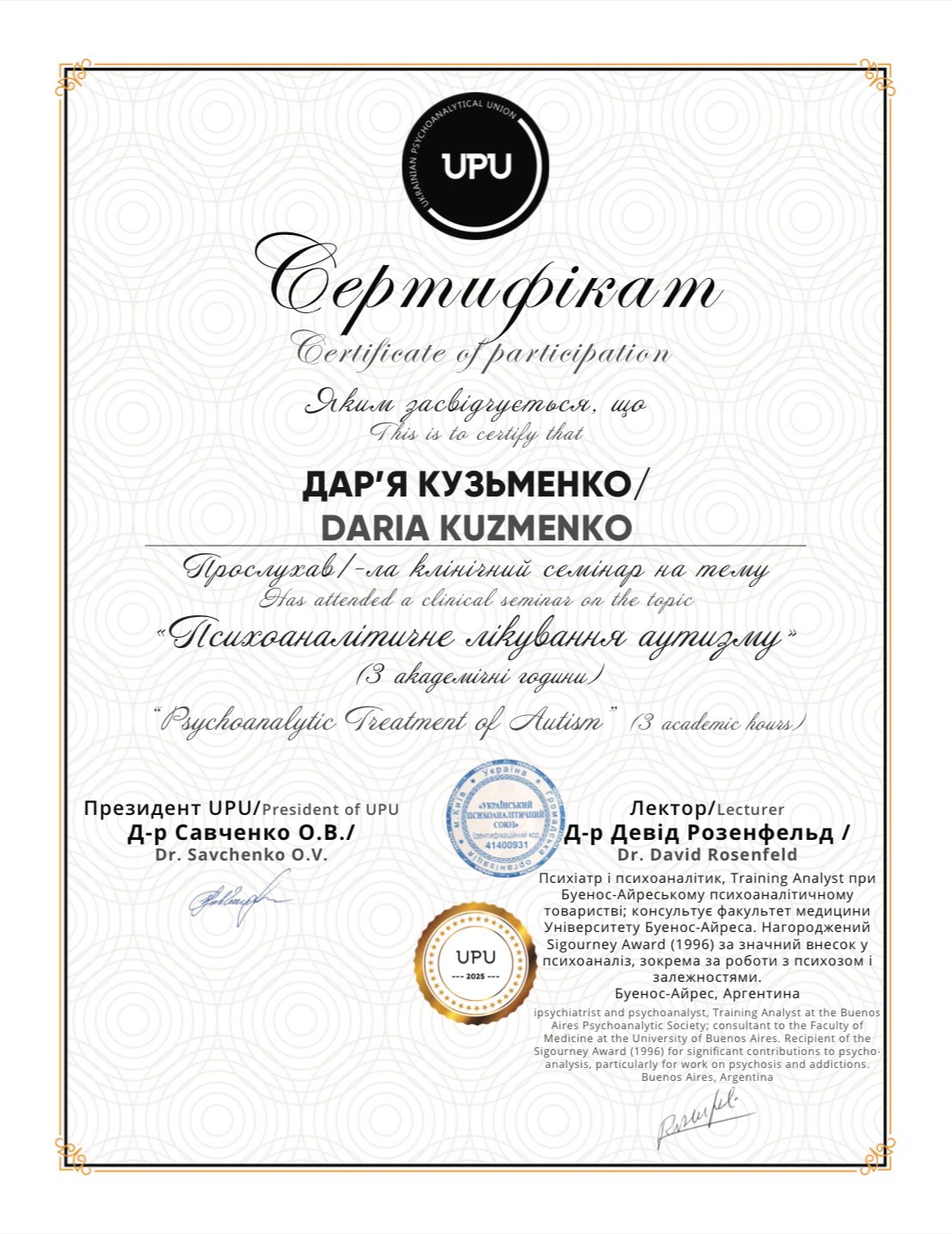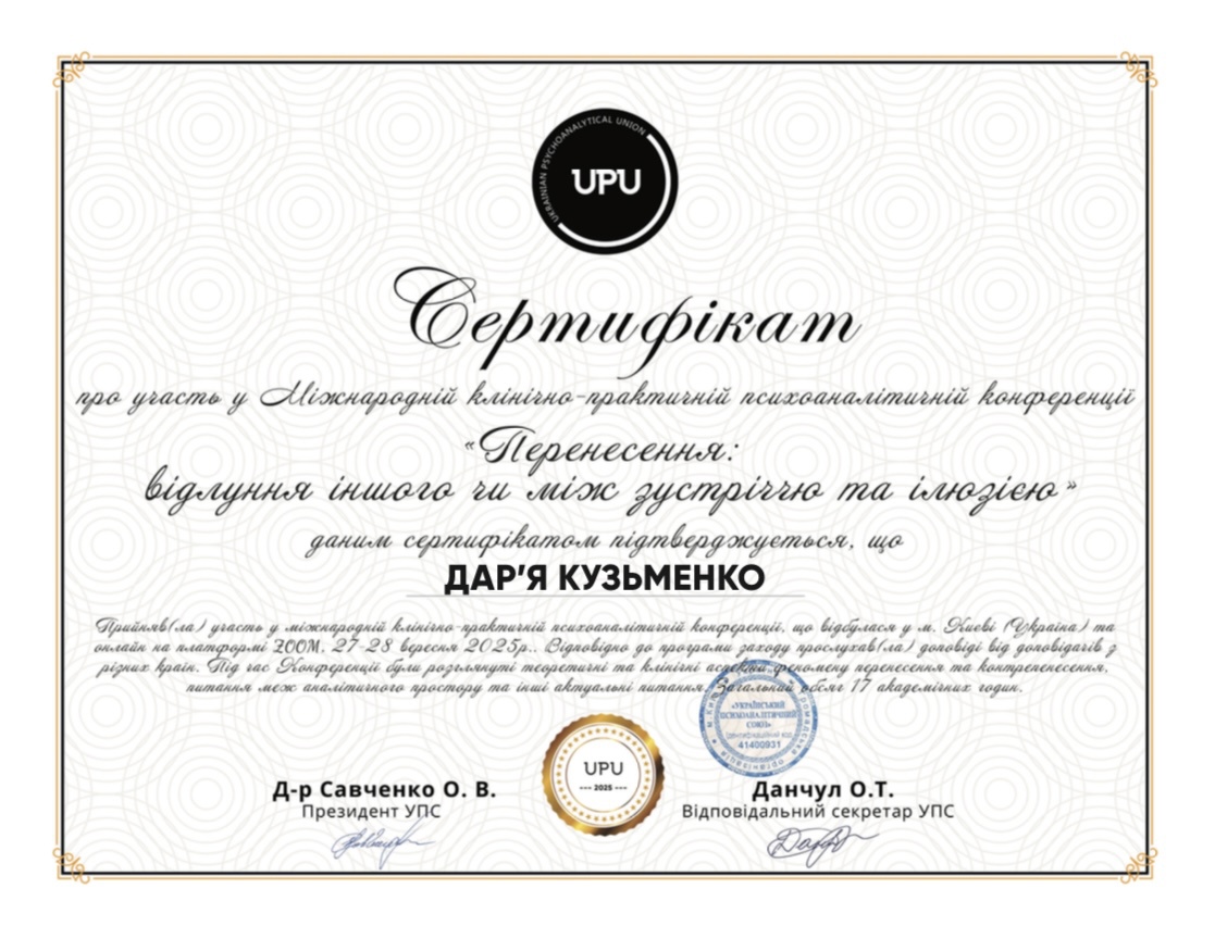 Я являюсь членом Украинской Ассоциации Психоанализа (УАП-ЕКПП) и членом Ассоциации Психотерапевтов и Психоаналитиков Украины.