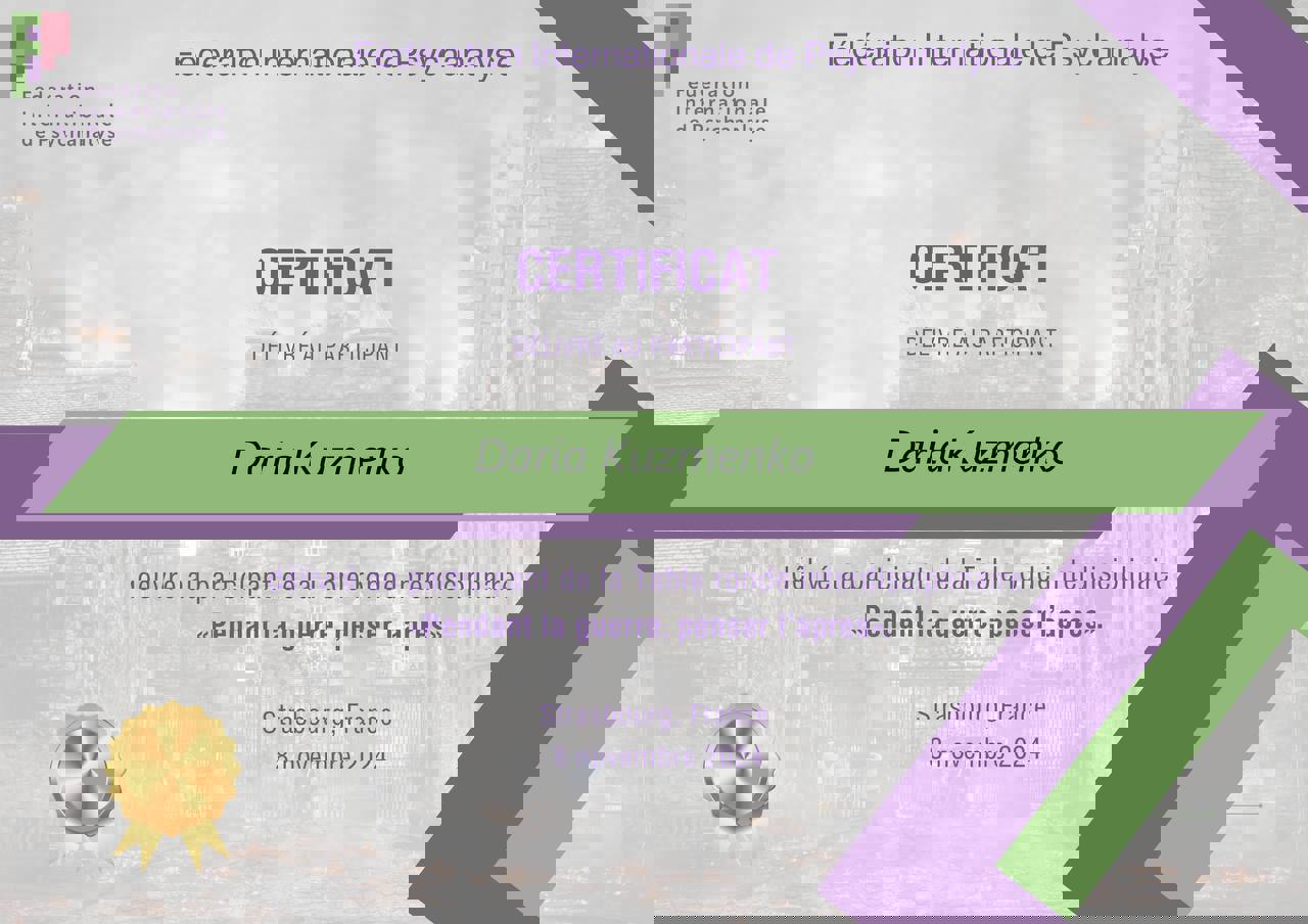 - участник Междисциплинарного круглого стола «Во время войны подумать о том, что будет после», Международная Федерация Психоанализа (Страсбург, Франция).