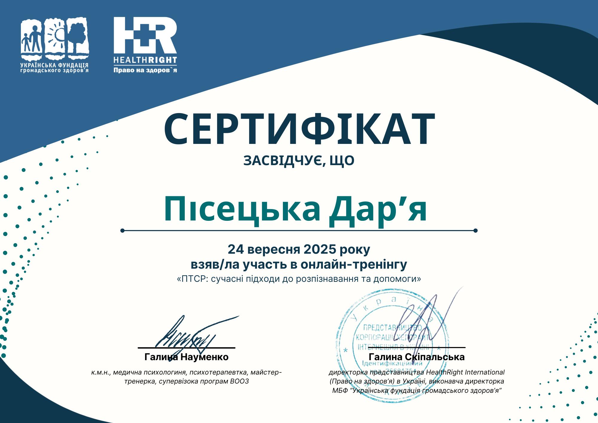 2015 г. – Национальный педагогический университет им. М. П. Драгоманова Институт социальной работы и управления и Восточноукраинская ассоциация арт-терапии «Методы системно-семейной арт-терапии».