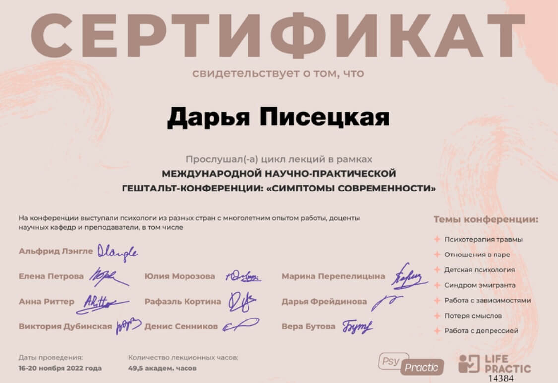 Я дипломированный психолог, арт-терапевт, семейный психолог, гештальттерапевт в учебе.