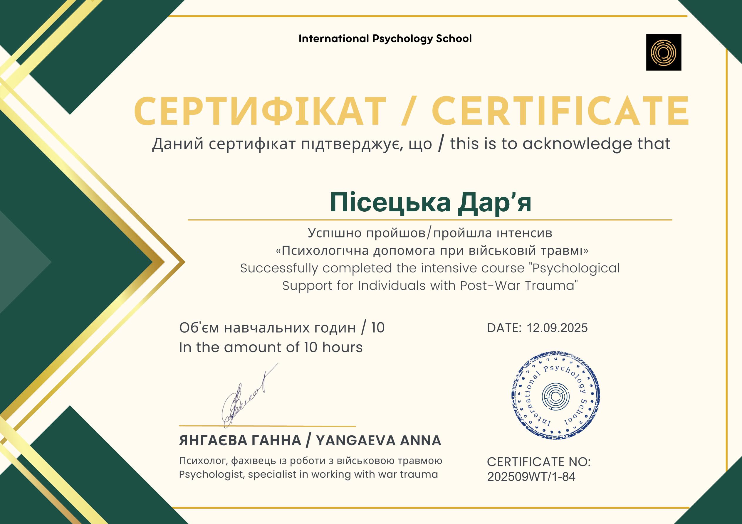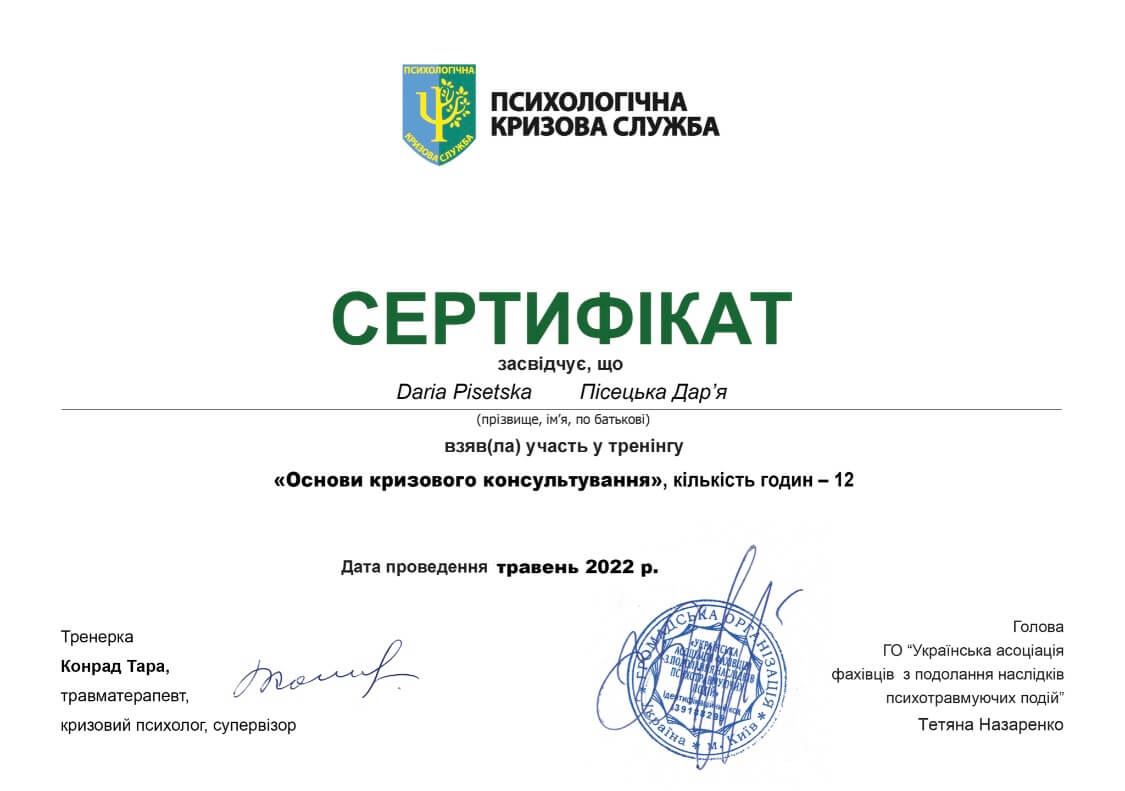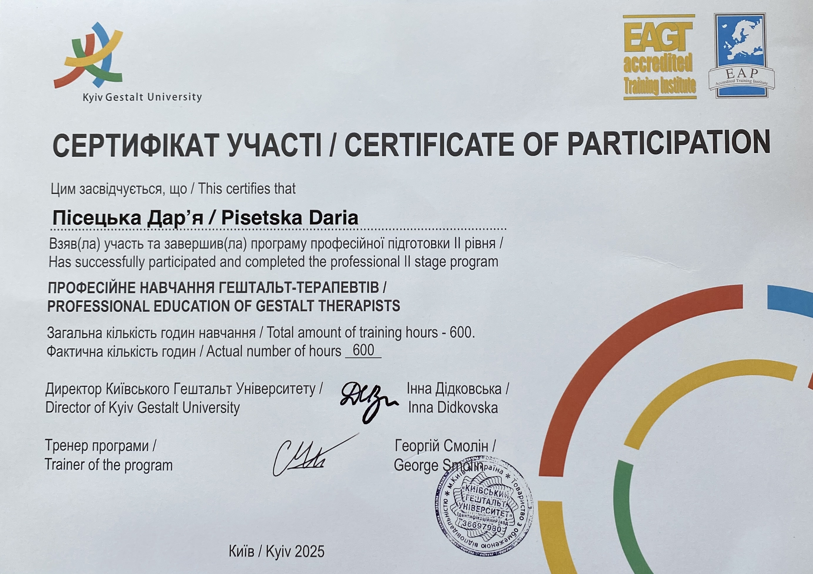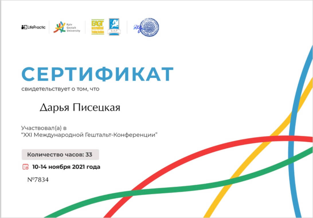 2019 г. – В настоящее время – обучение в Киевском Гештальт Университете.