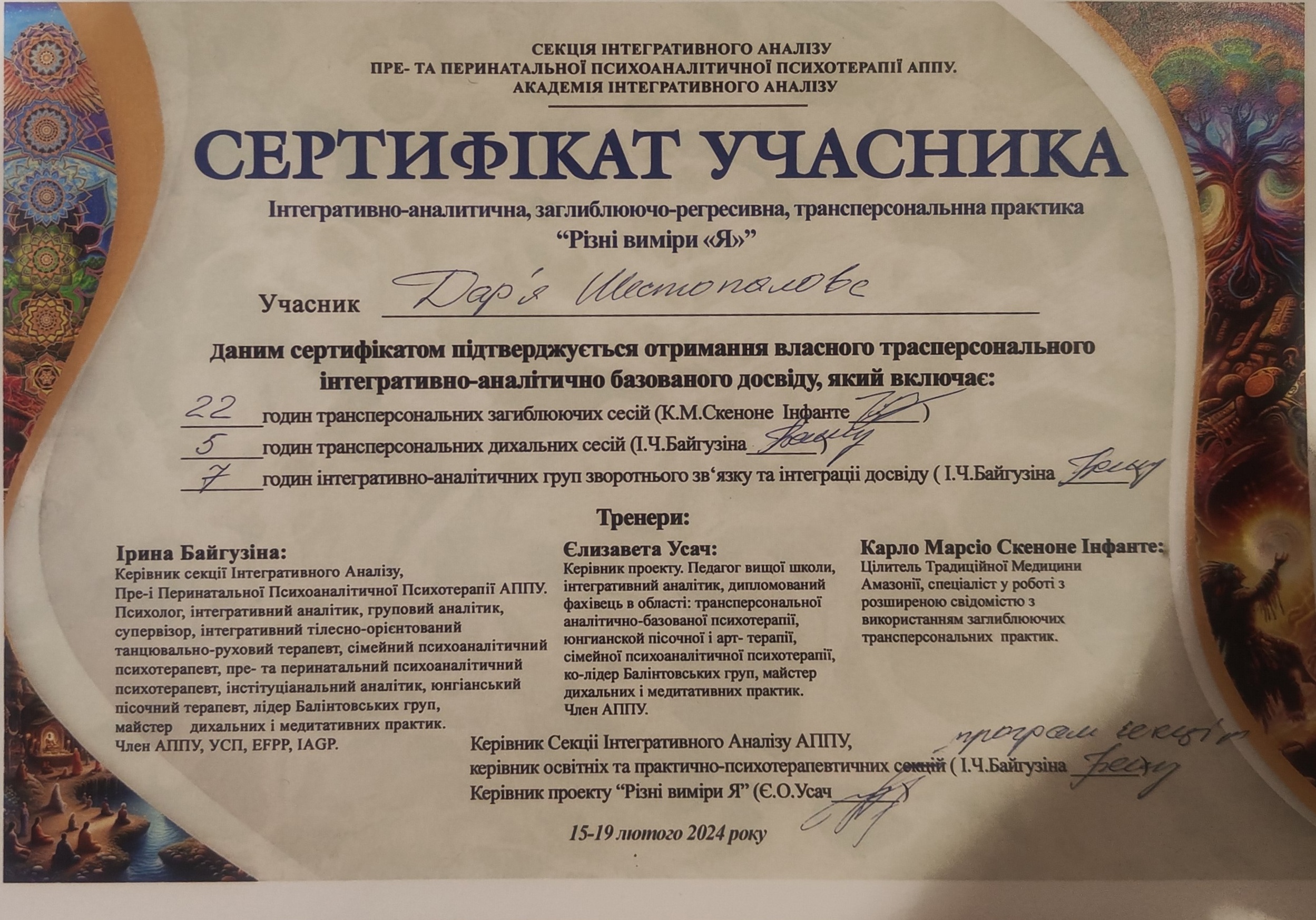- Травма-ориентированная терапия - научно-практическая подготовка "Боевая травма: индивидуальная и групповая терапия" (15 кредитных часов, 2024)