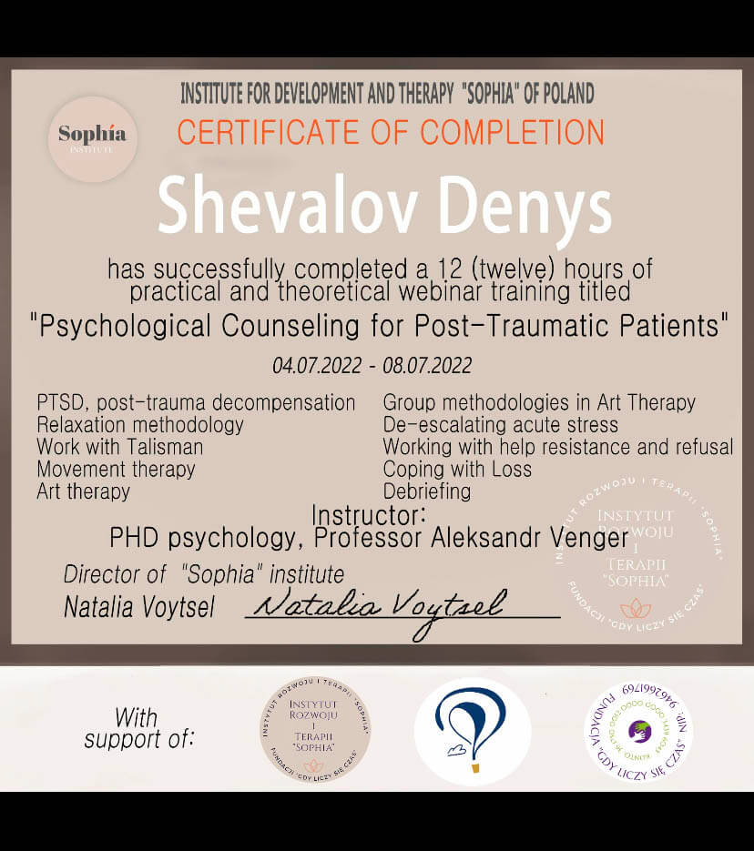 Гештальт-терапевт, бизнес и лайф-коуч, корпоративный психолог. Коуч в системах ICF USA, NCC IPS, Gold Coach GPS (мышление, маркетинг, продажи, gtd, mini mba, RPM tony robbins, чек письмо рокфеллера "ScaleUp"). Изучал дополнительно НЛП, КПТ, Саморегуляцию.